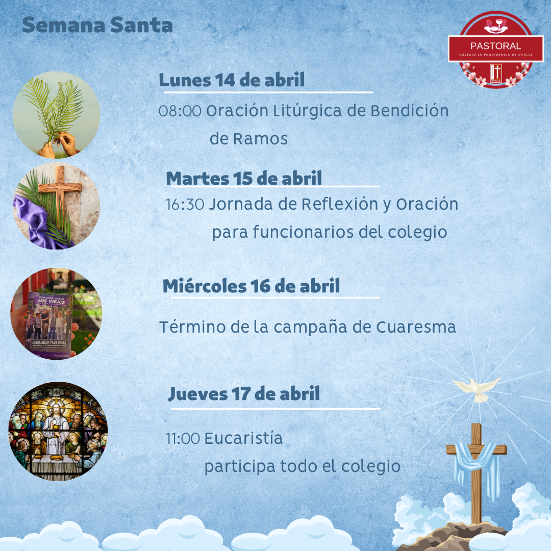 La Pastoral de nuestro colegio invita a vivir juntos esta significativa celebración cristiana que conmemora los momentos más trascendentales de la vida de Jesús: su pasión, muerte y gloriosa resurrección.