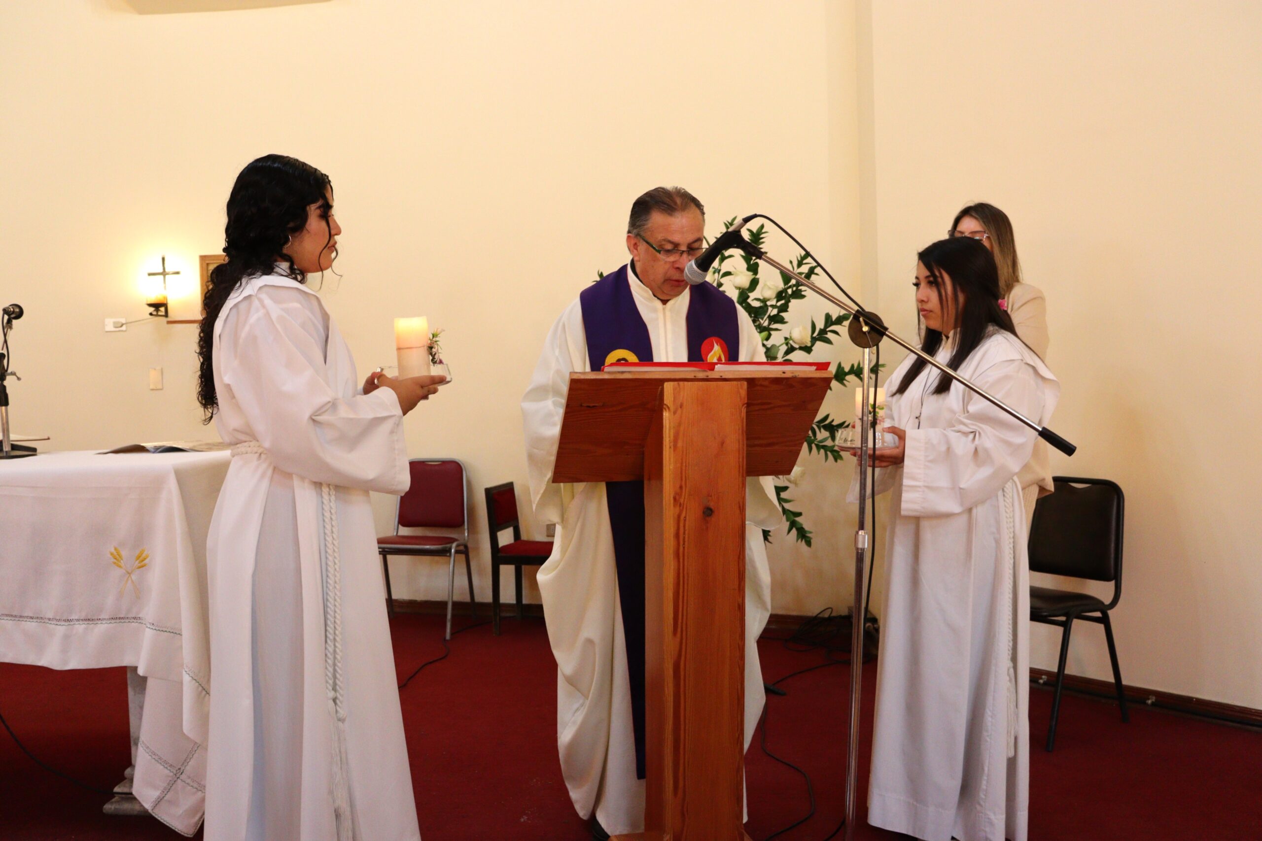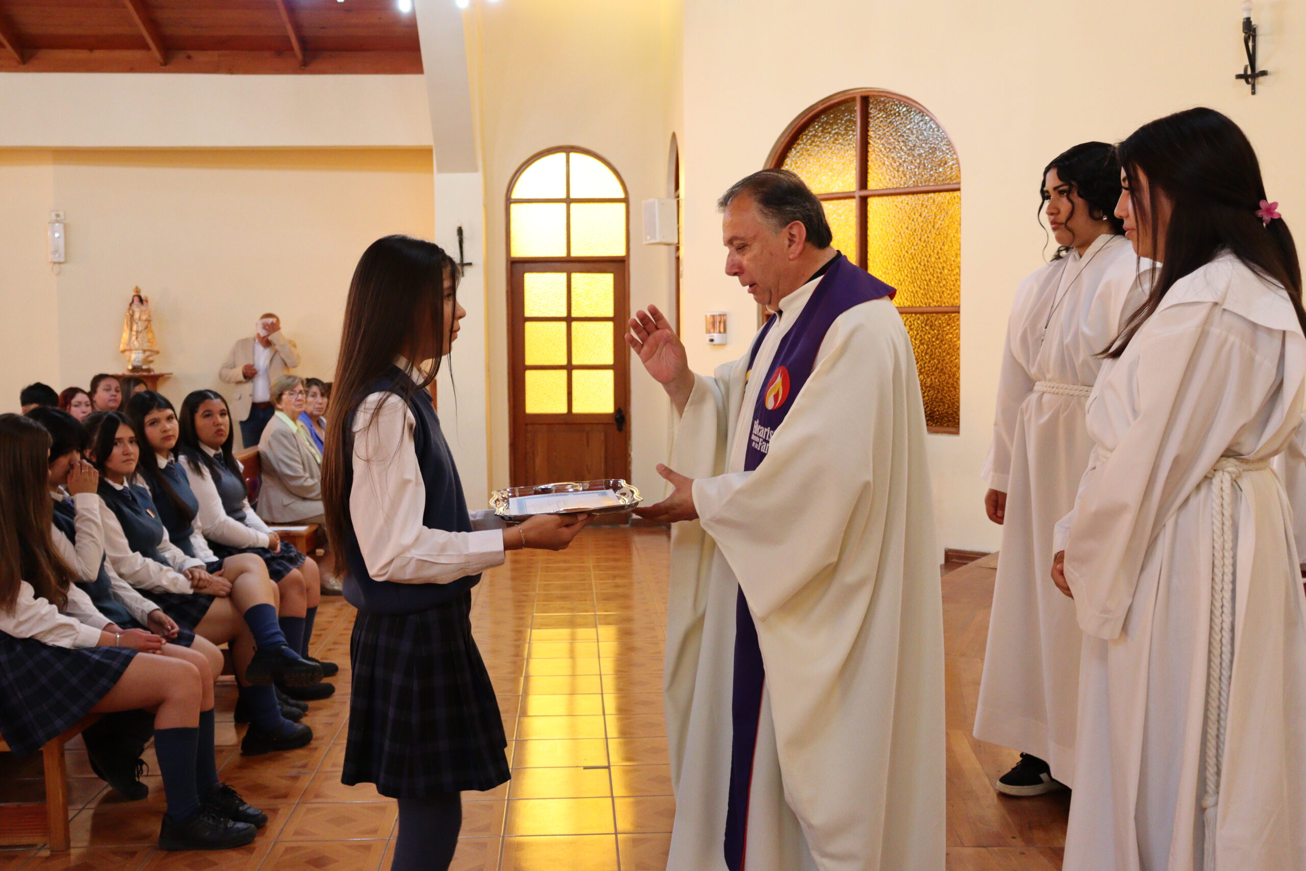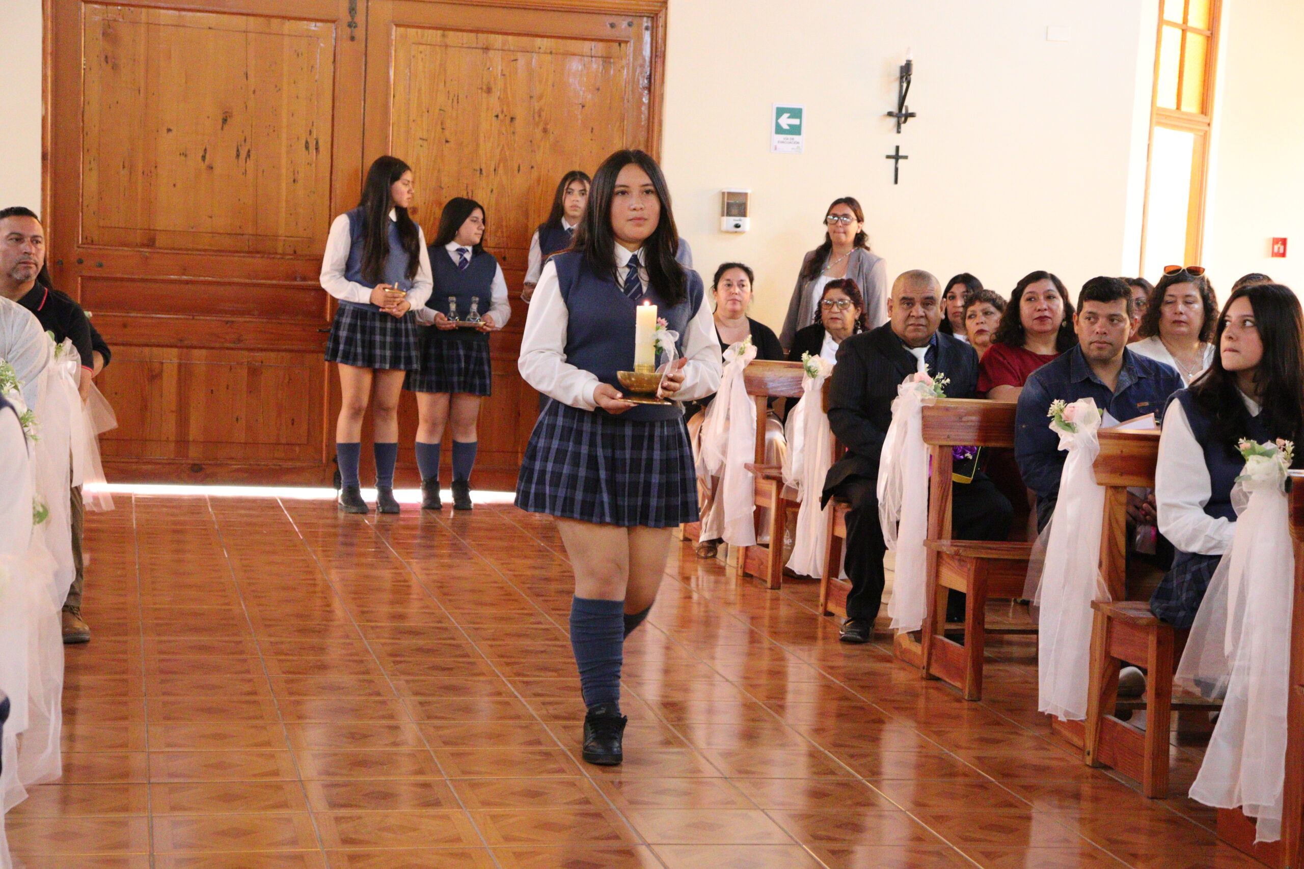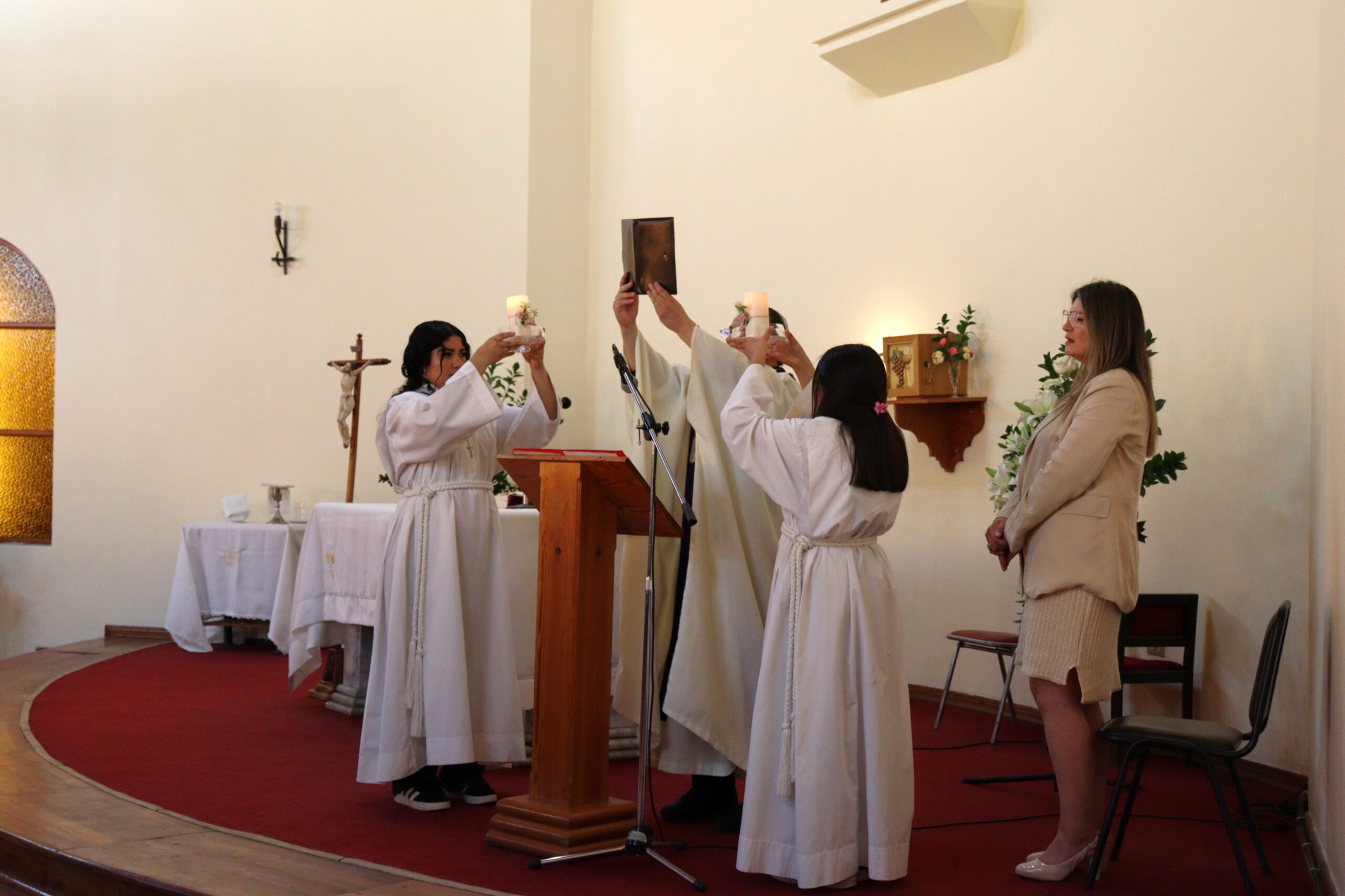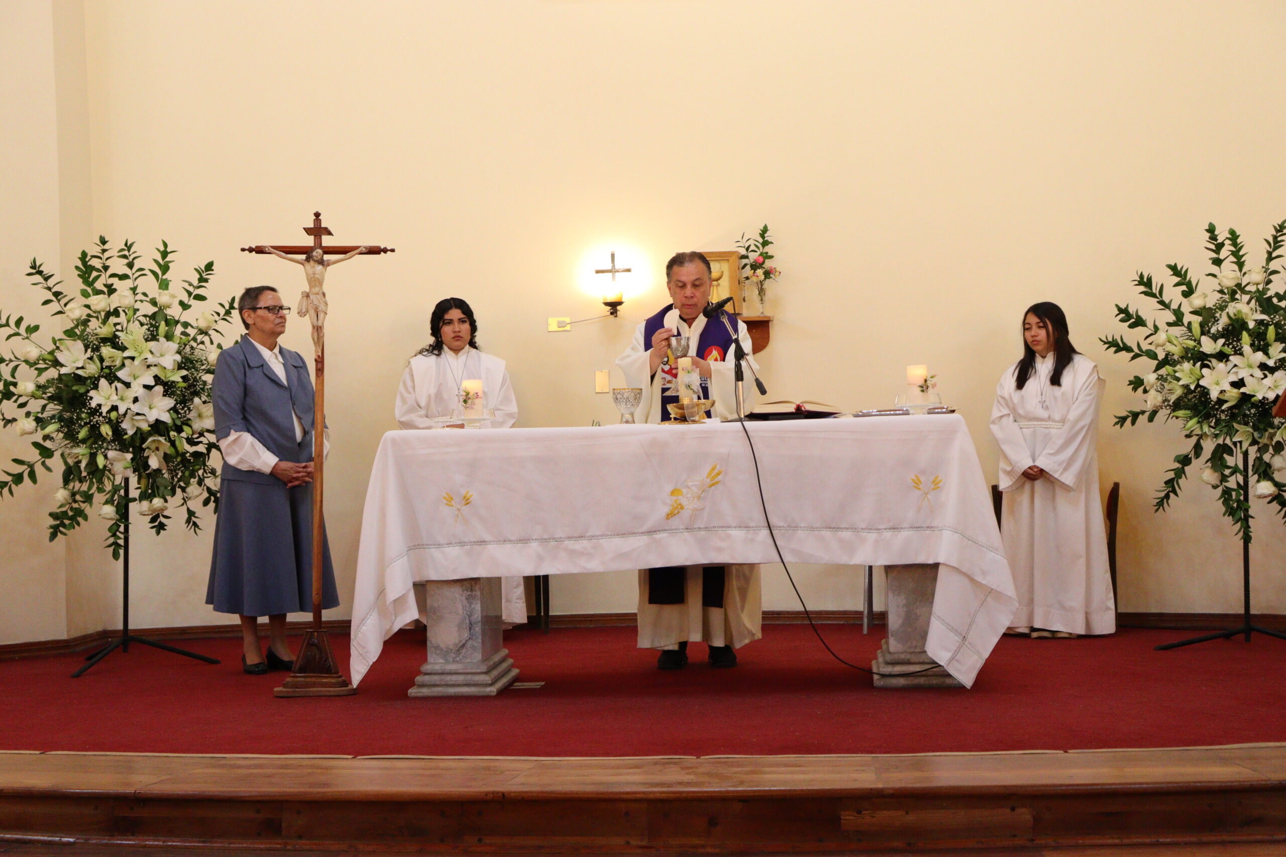 El pasado viernes, nuestra comunidad educativa vivió un momento lleno de emoción y significado con la ceremonia de paso del curso 8°A a la enseñanza media. La jornada comenzó con una Eucaristía presidida por el Padre Jorge Arancibia, quien destacó la importancia de la familia en la crianza y acompañamiento de las estudiantes, especialmente en esta etapa de crecimiento donde el apoyo y guía de los padres resulta fundamental para tomar buenas decisiones.