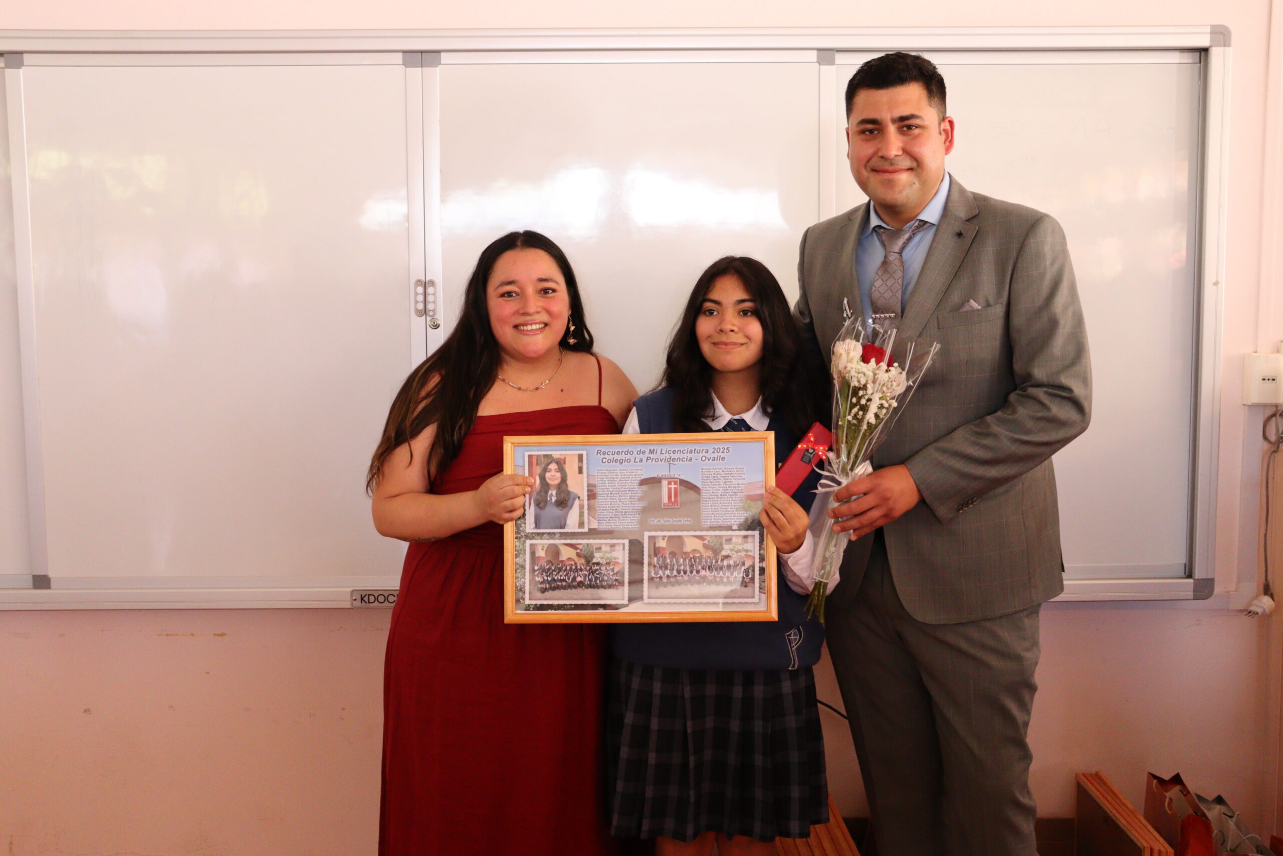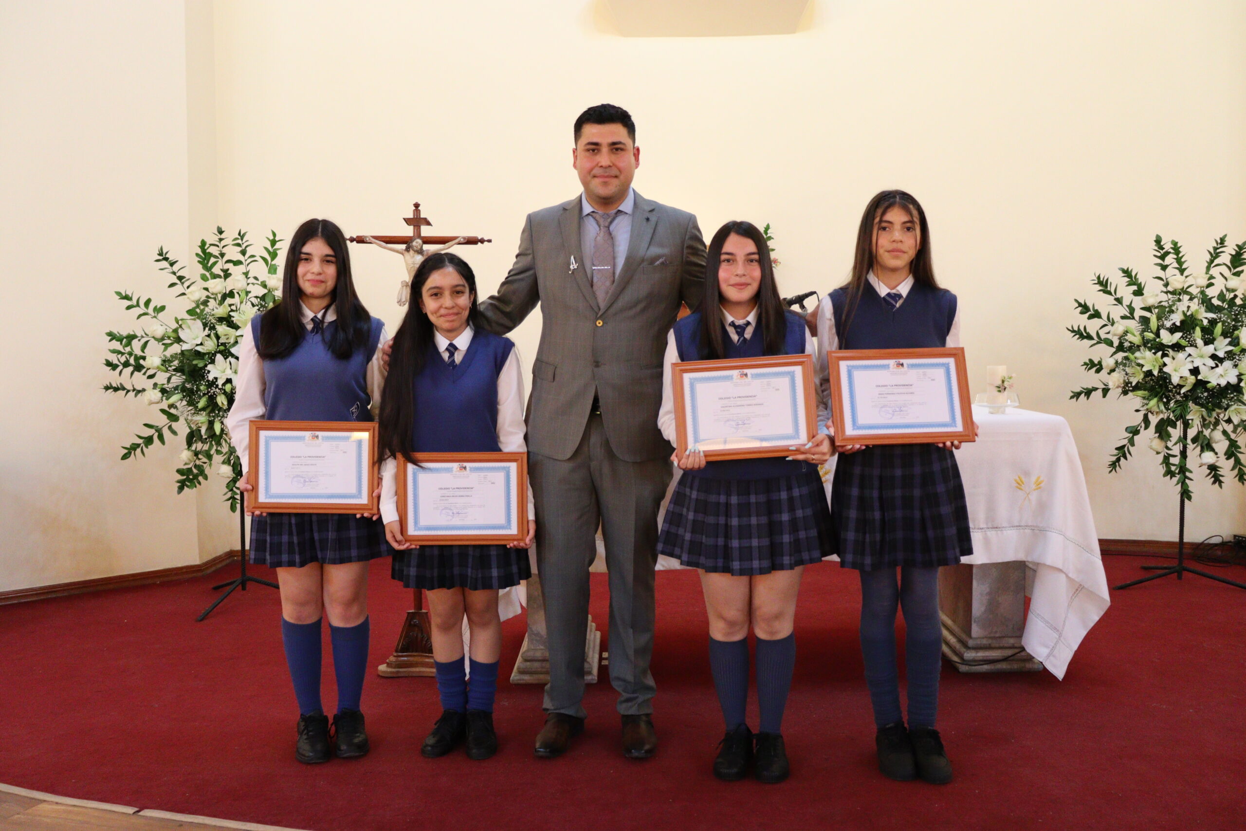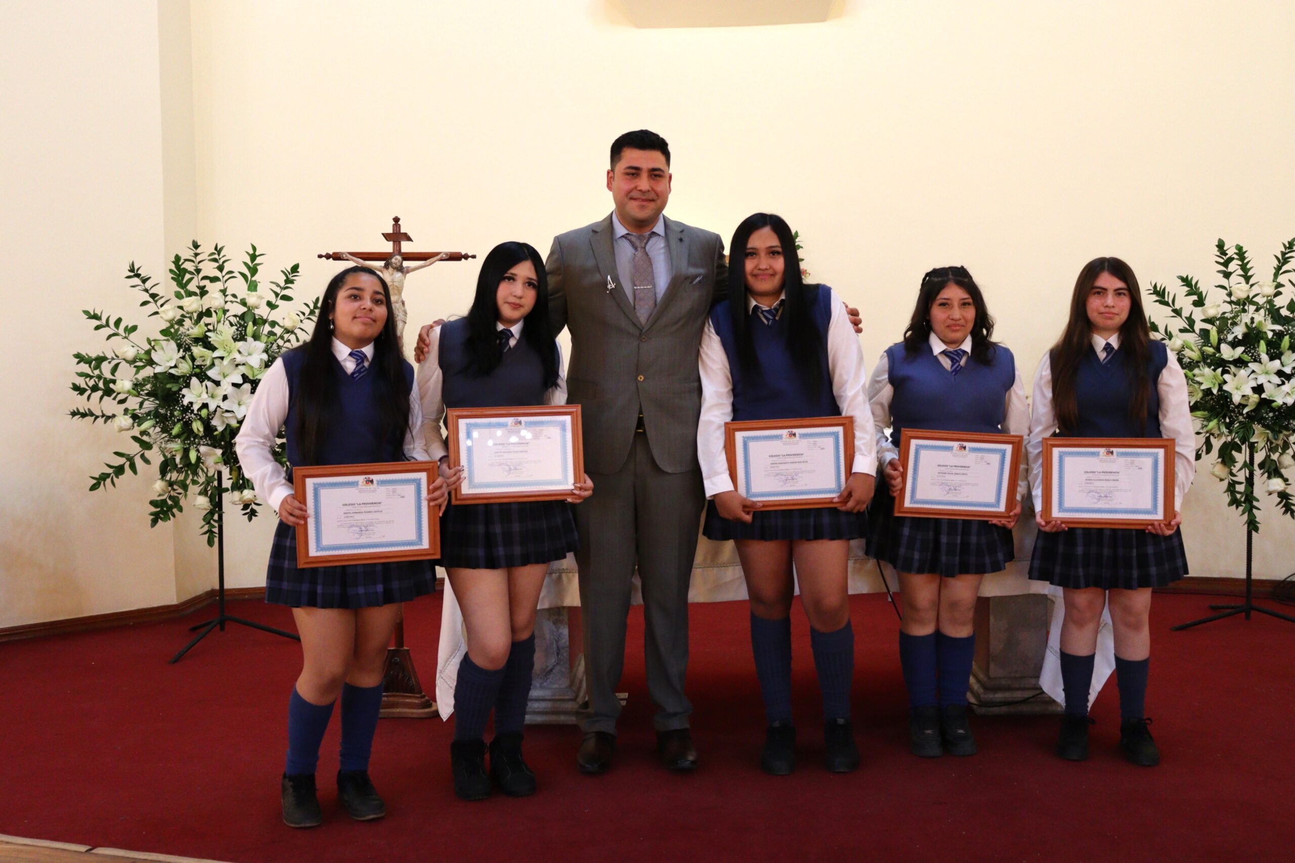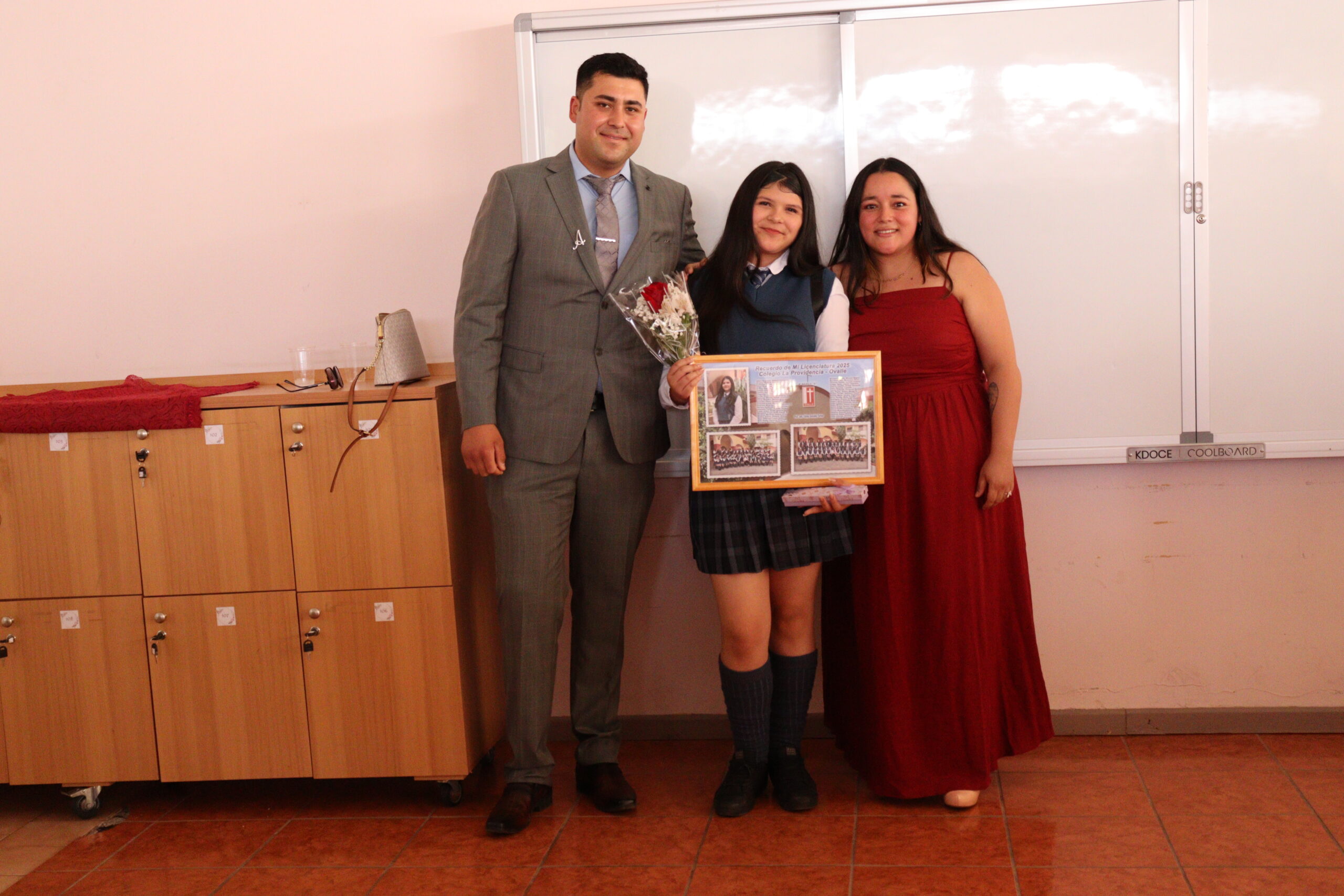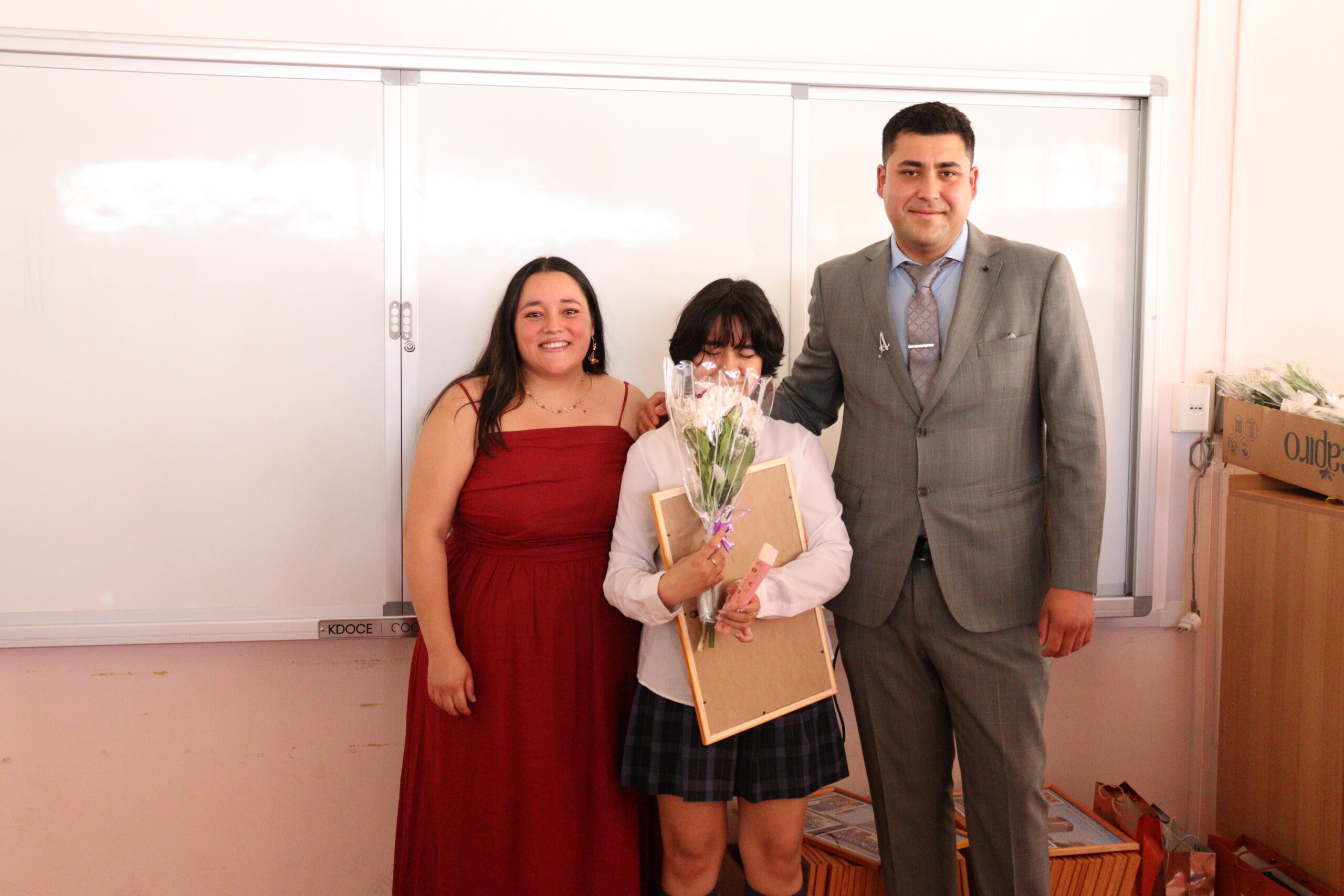 Posteriormente, las estudiantes recibieron sus diplomas en grupos, acompañadas por su profesor jefe suplente Ángelo Álvarez, quien asumió con compromiso el liderazgo del curso durante el post natal de la profesora jefe Fátima González. A pesar de encontrarse en este período, la profesora Fátima González estuvo presente para acompañar a sus estudiantes en tan importante paso, gesto que reflejó su vocación y cariño.