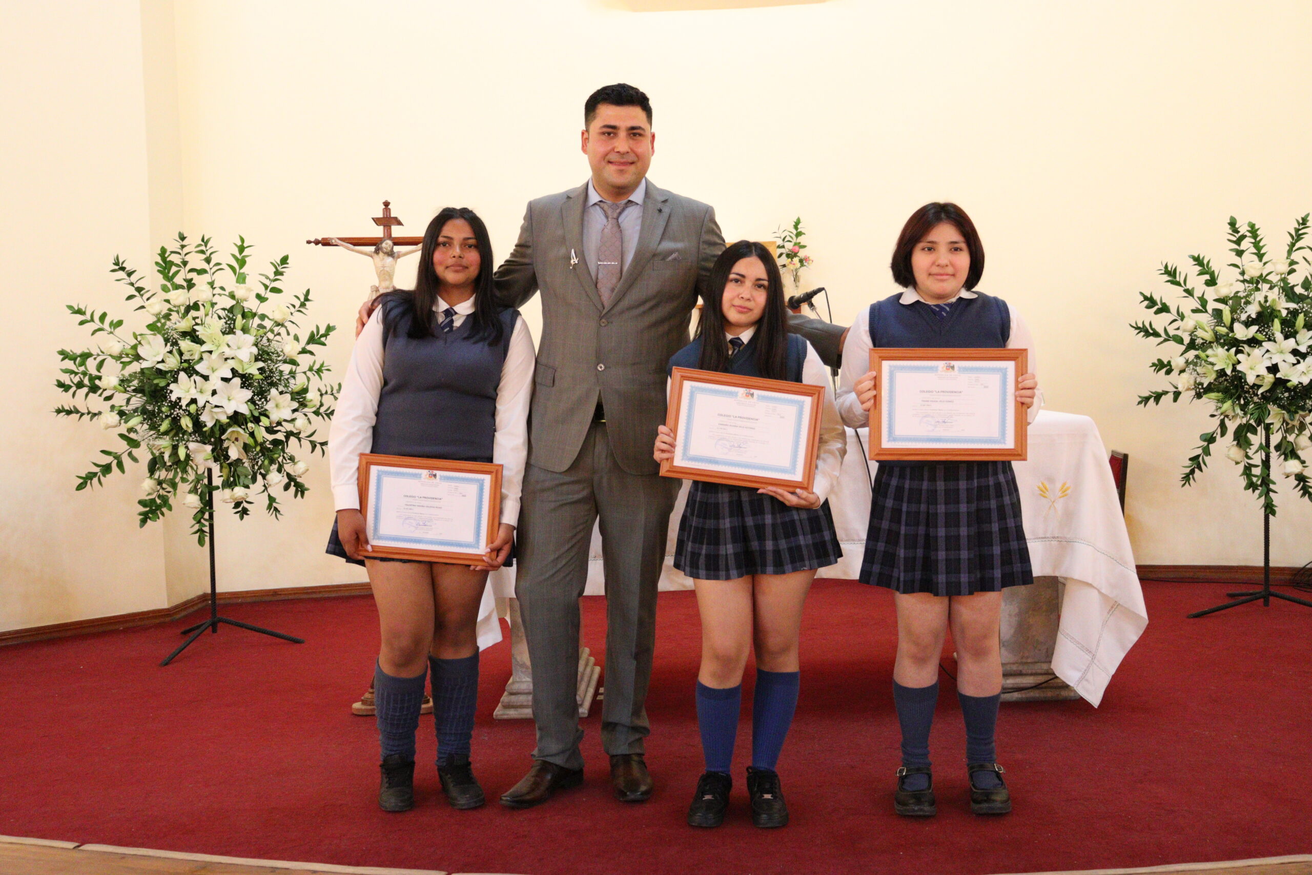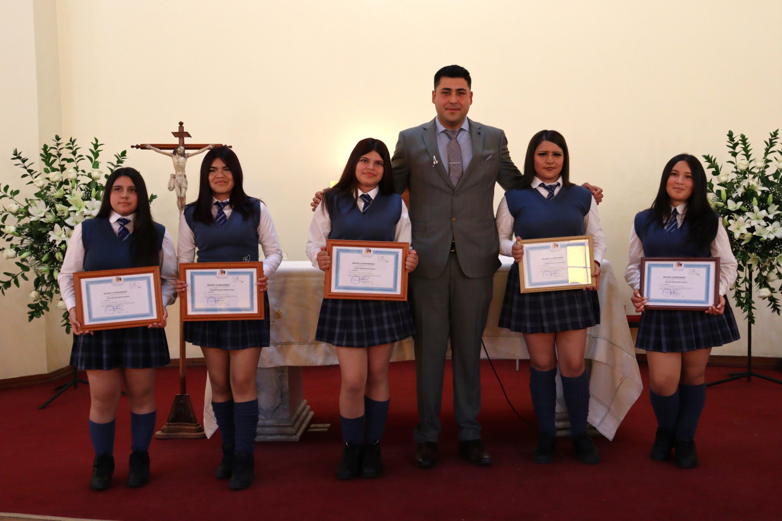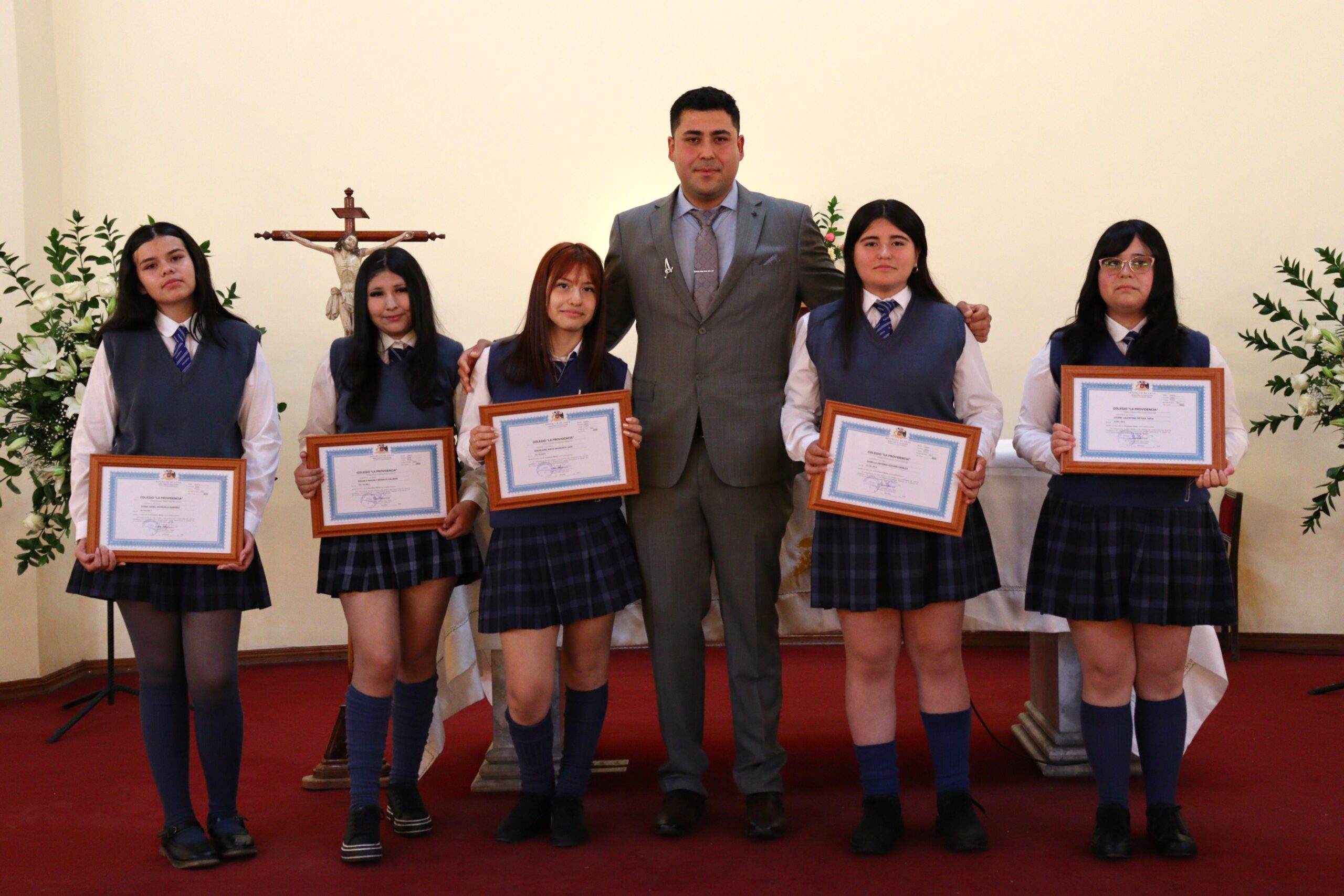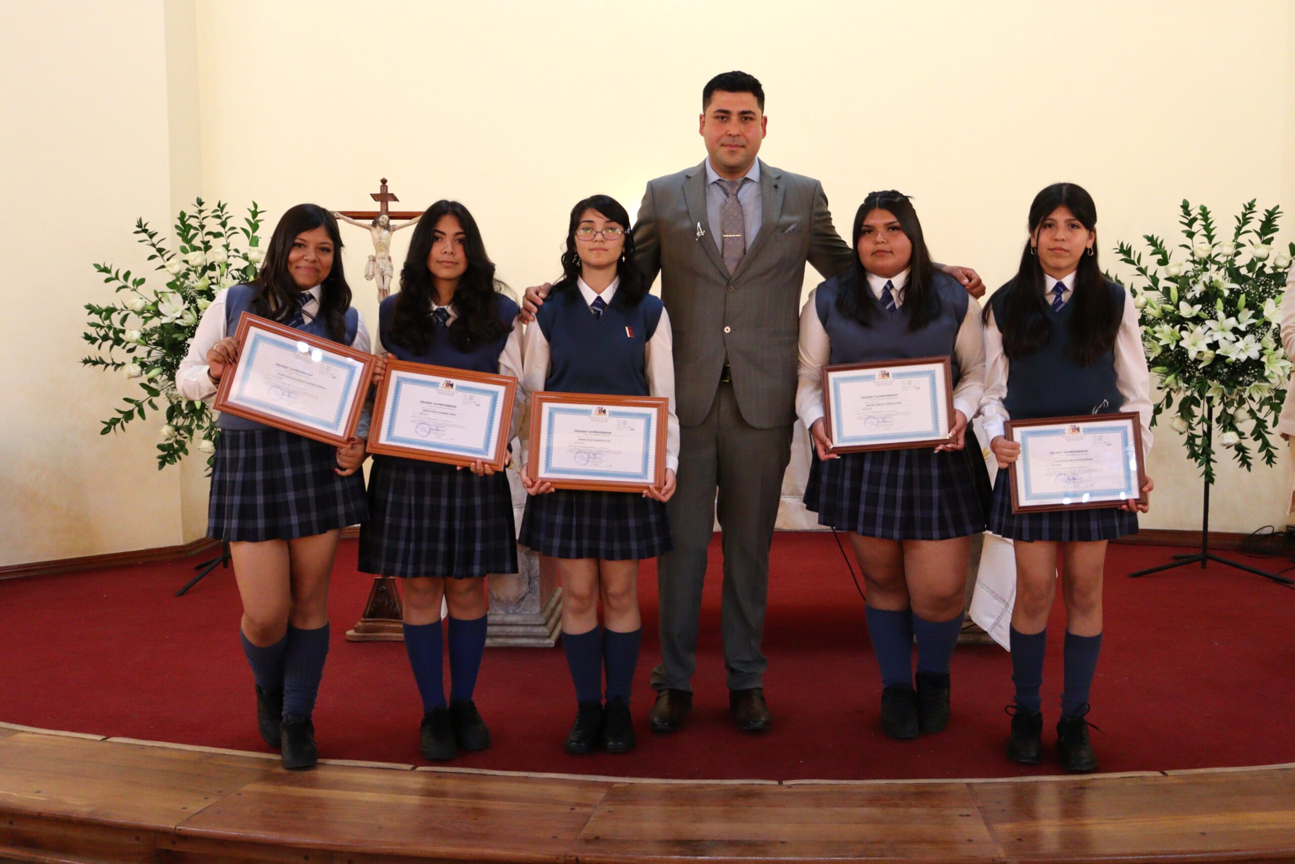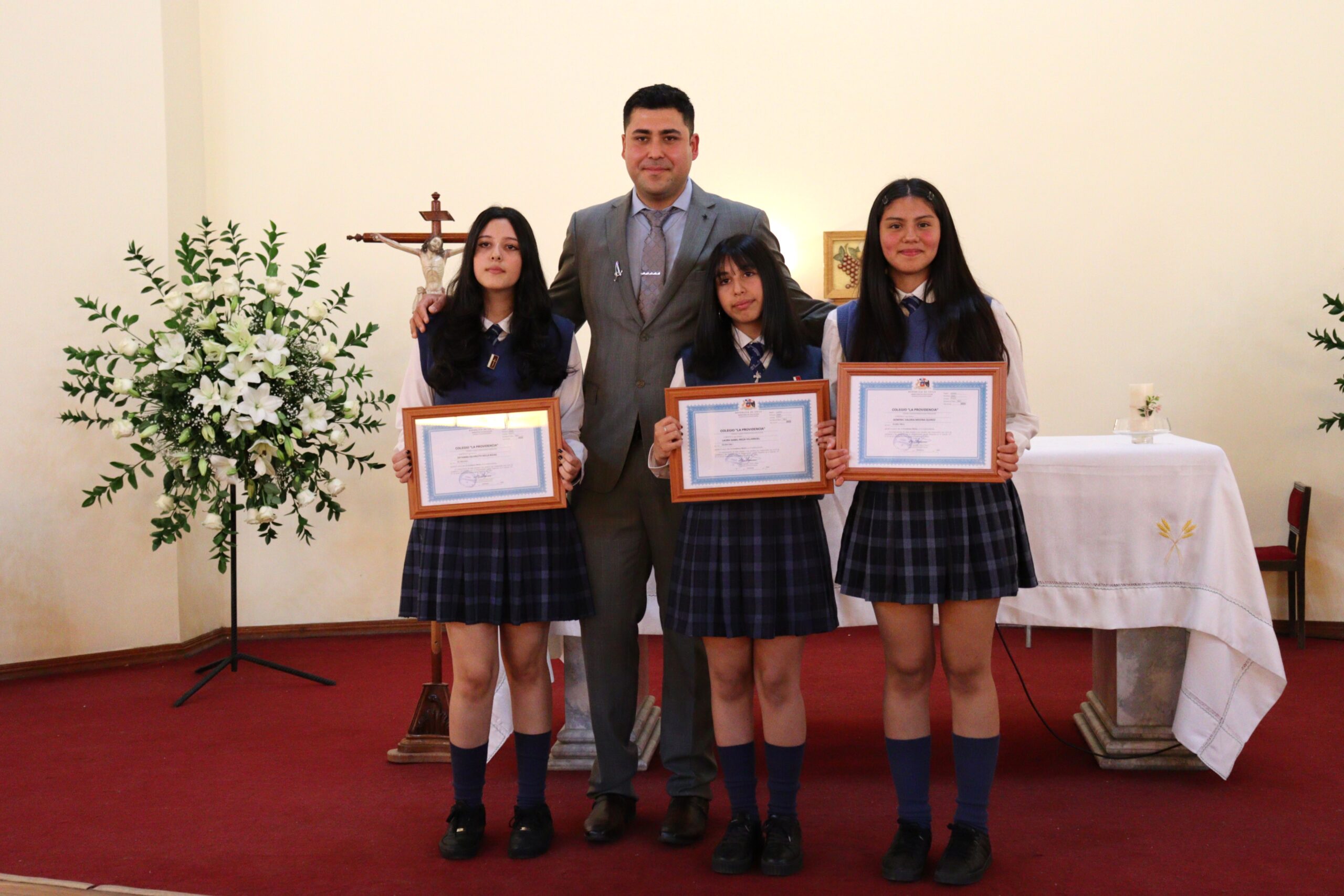 Posteriormente, las estudiantes recibieron sus diplomas en grupos, acompañadas por su profesor jefe suplente Ángelo Álvarez, quien asumió con compromiso el liderazgo del curso durante el post natal de la profesora jefe Fátima González. A pesar de encontrarse en este período, la profesora Fátima González estuvo presente para acompañar a sus estudiantes en tan importante paso, gesto que reflejó su vocación y cariño.
