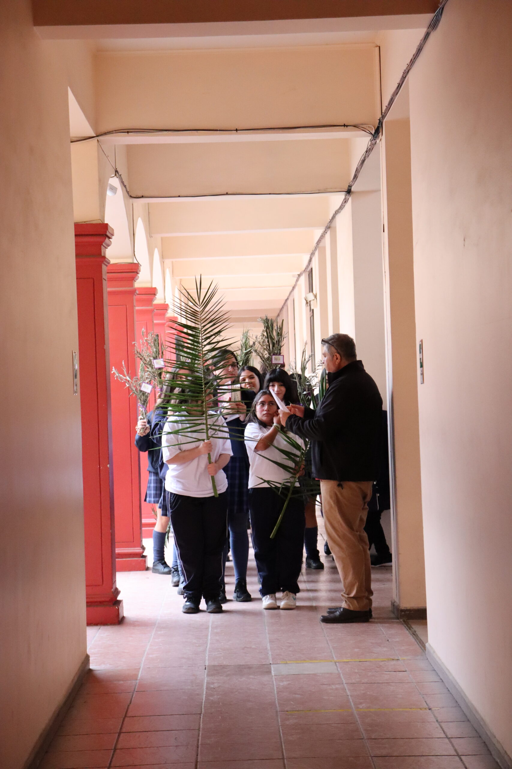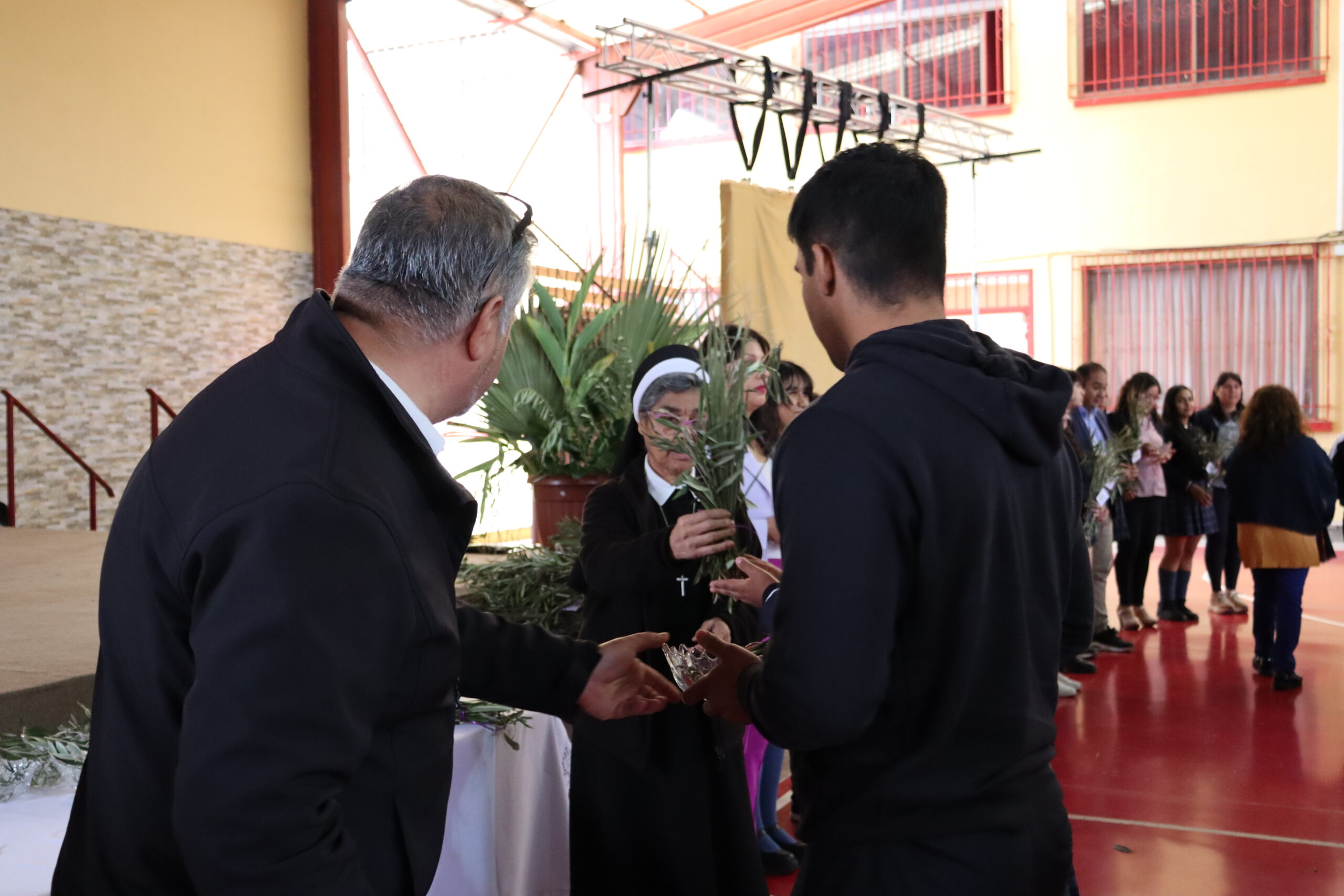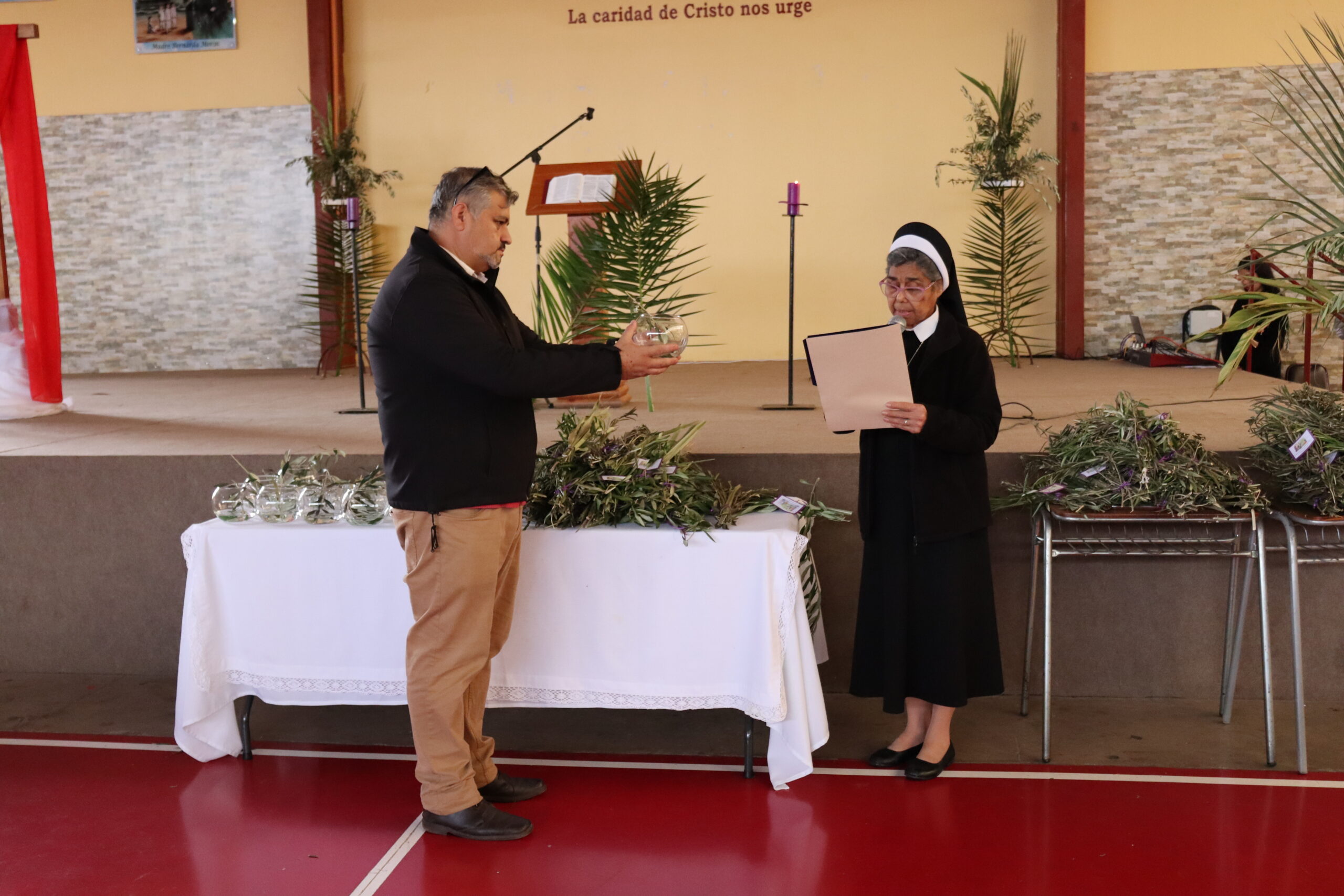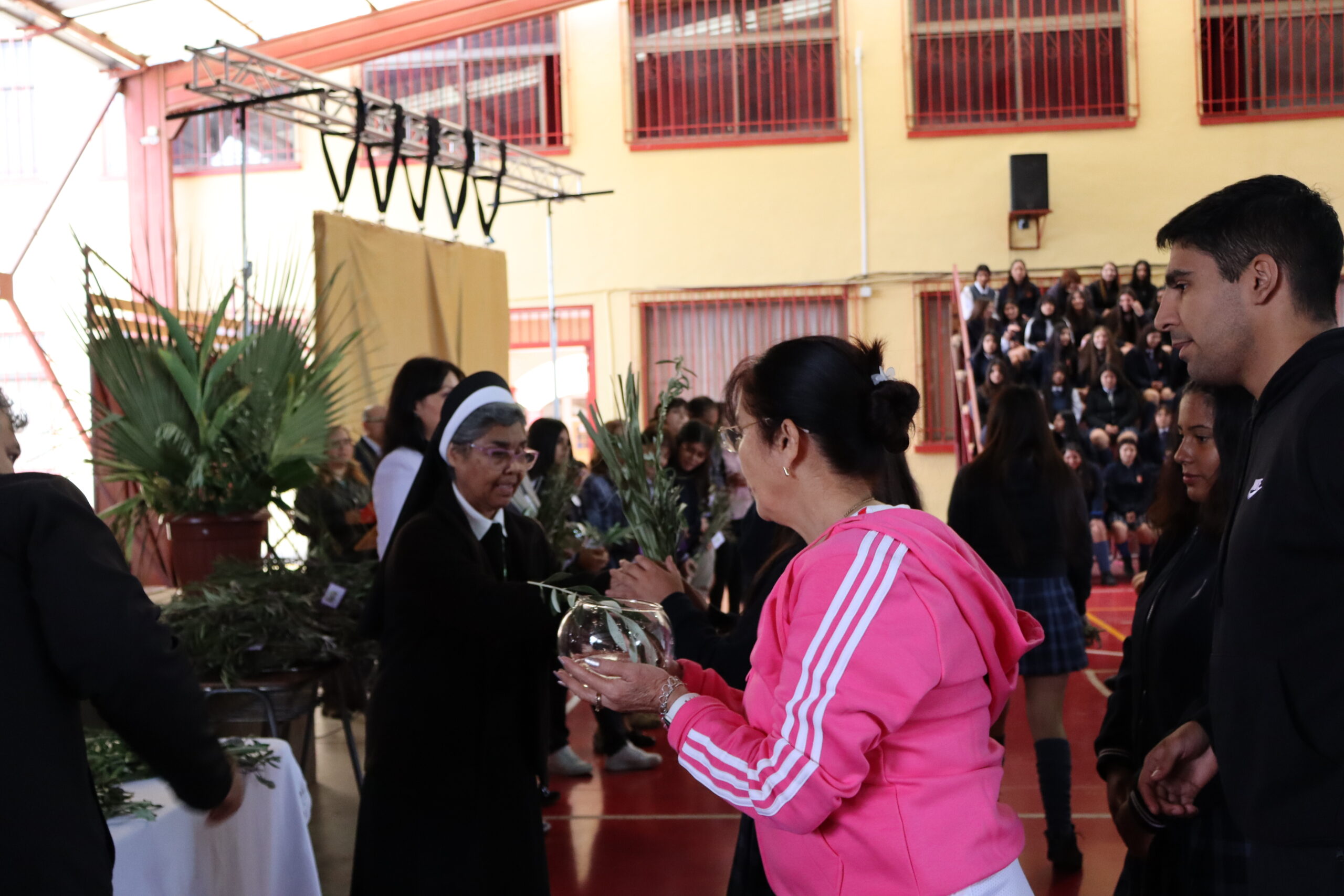 Durante la ceremonia, la Hna. Elvira Letelier bendijo e hizo entrega junto al profesor Gerardo Cortés de los ramos a cada profesor (a) Jefe con una estudiante en representación del curso, para ser puesto en la puerta de cada sala como signo de que, estamos acompañando a Jesús en su camino de muerte y resurrección.
