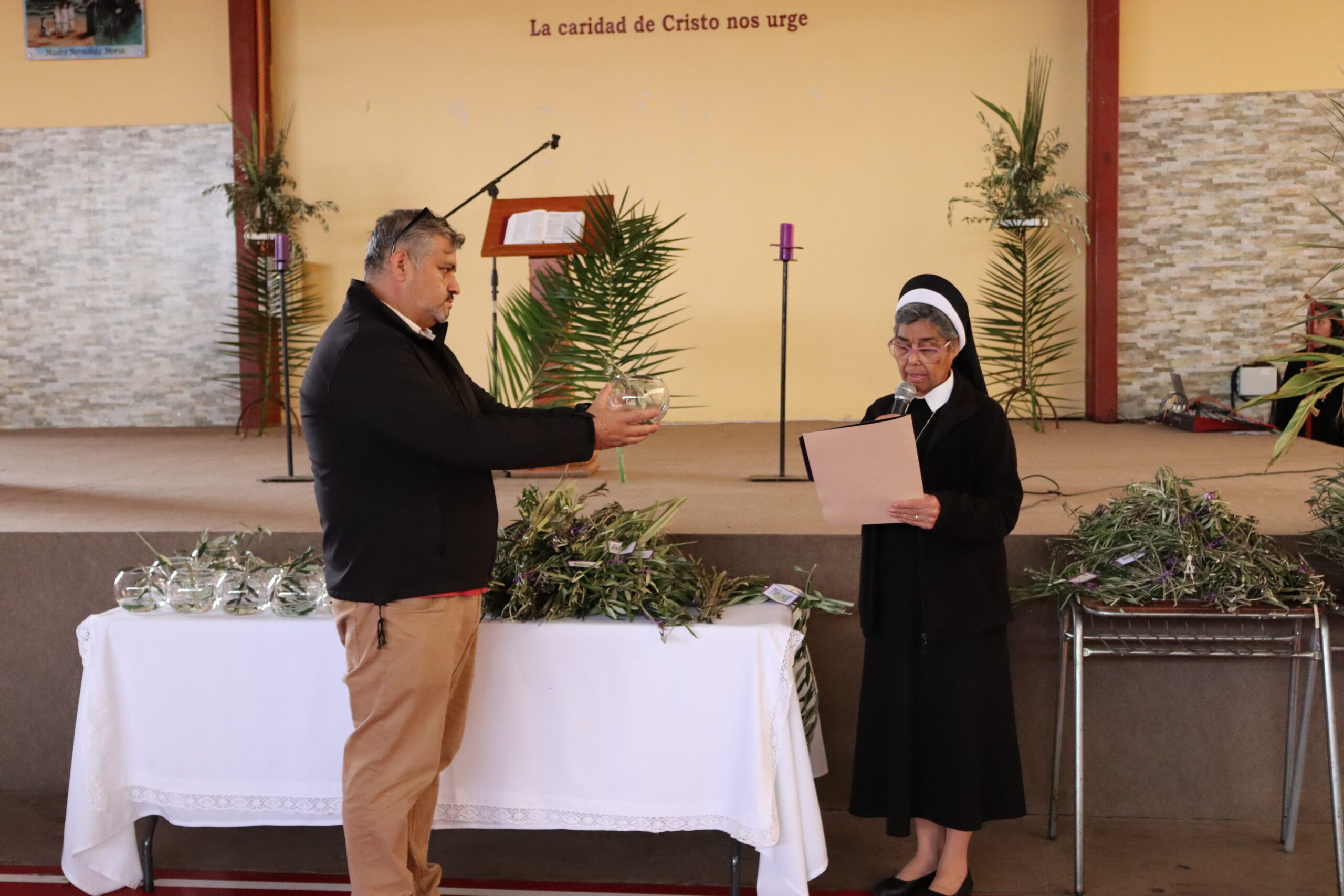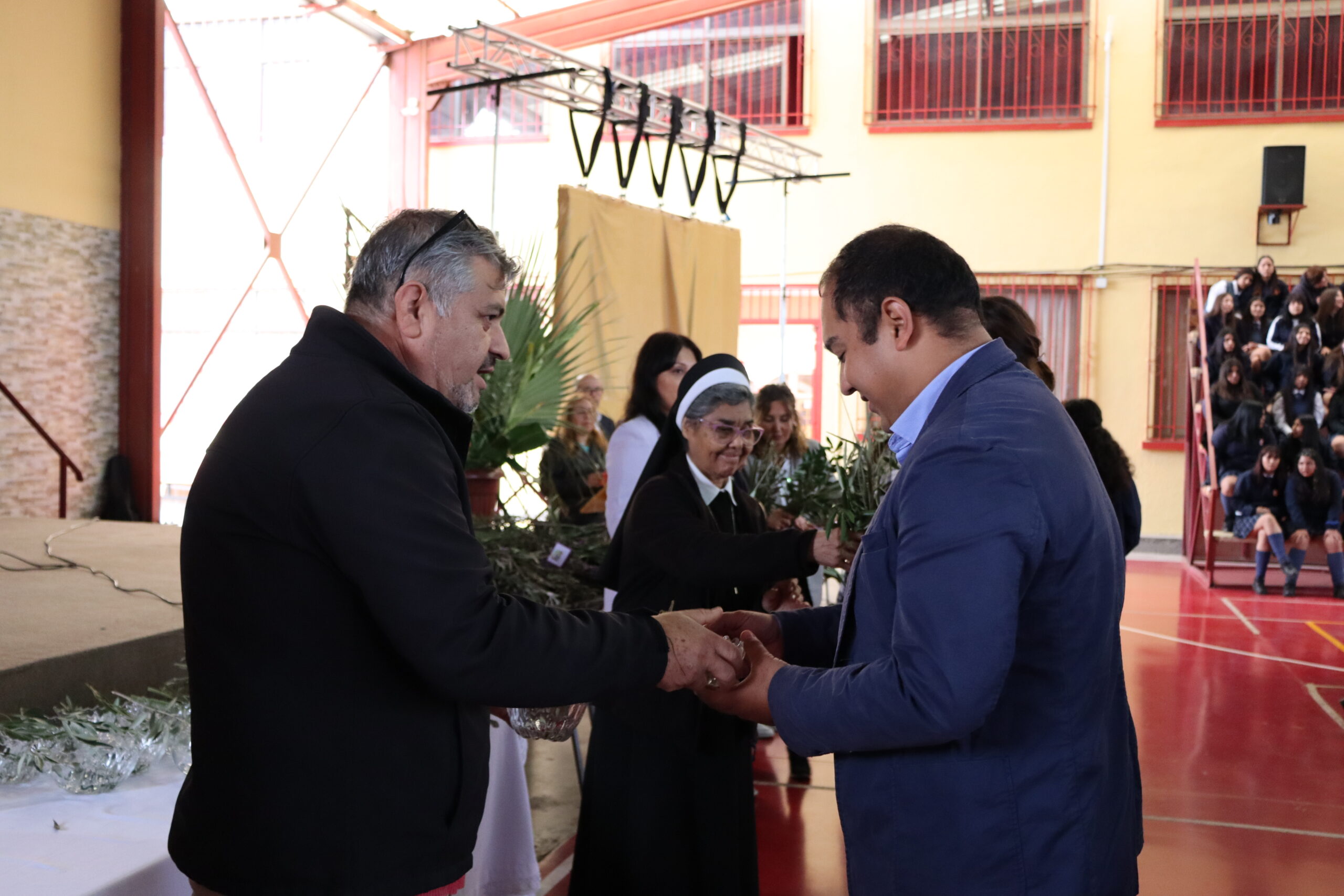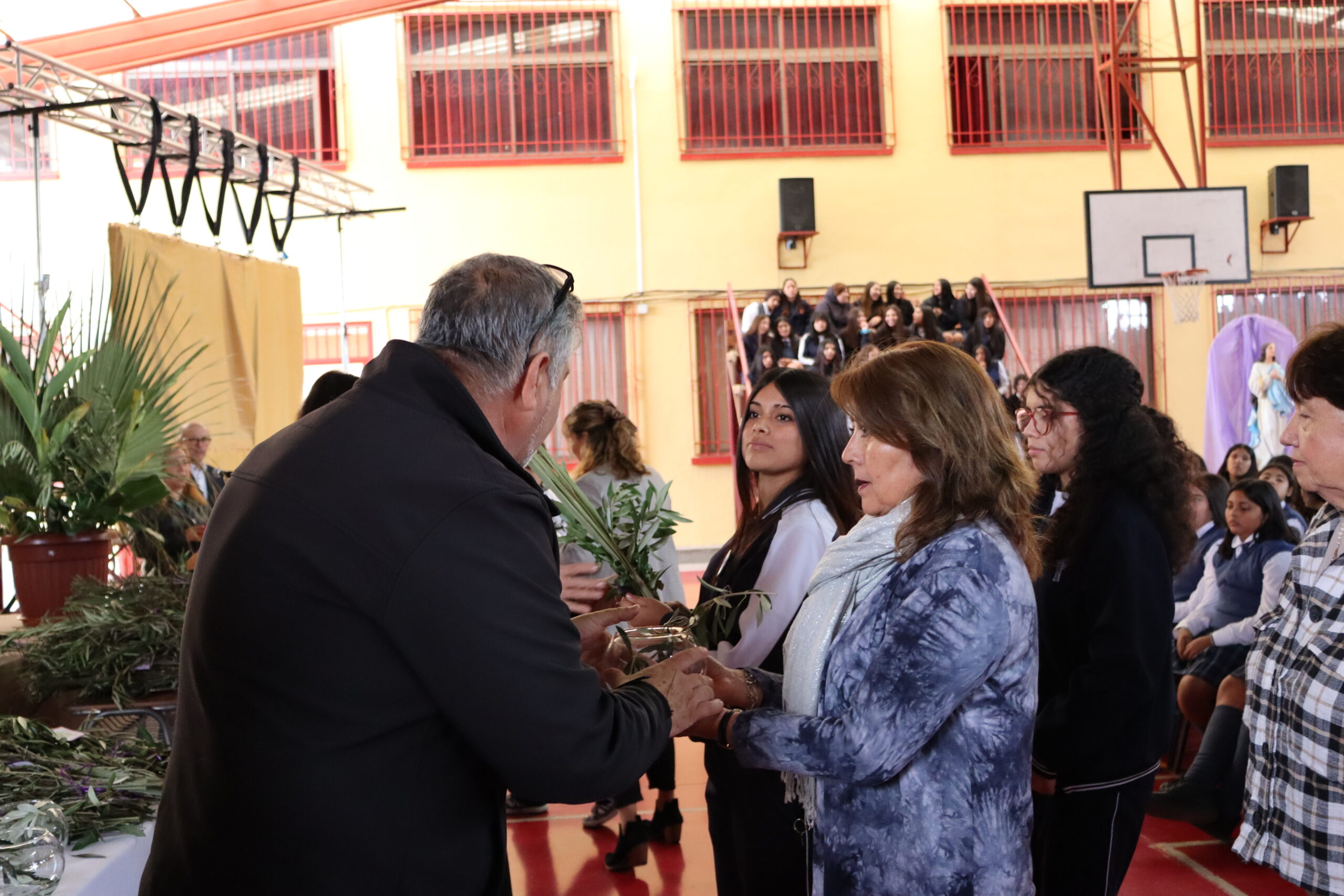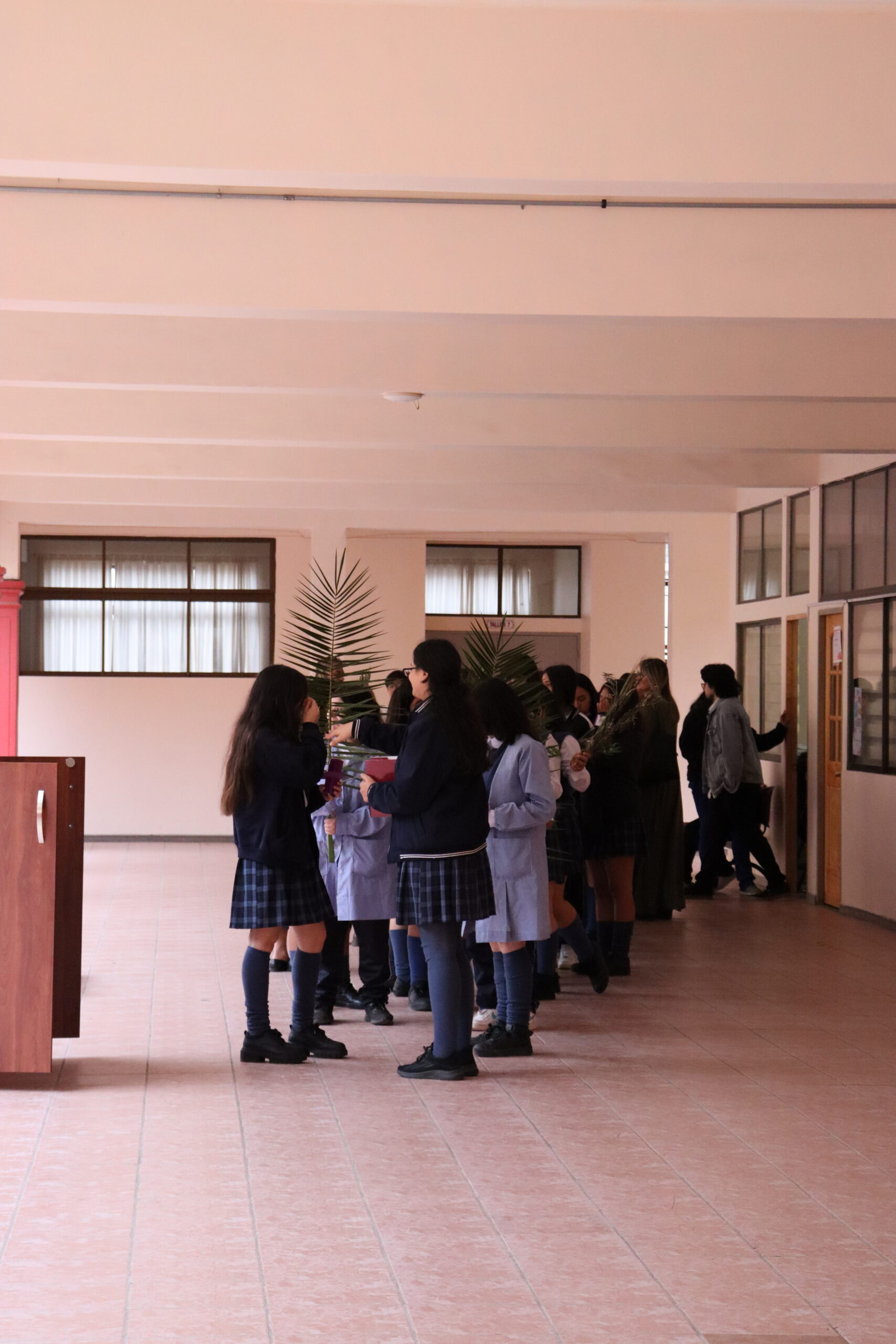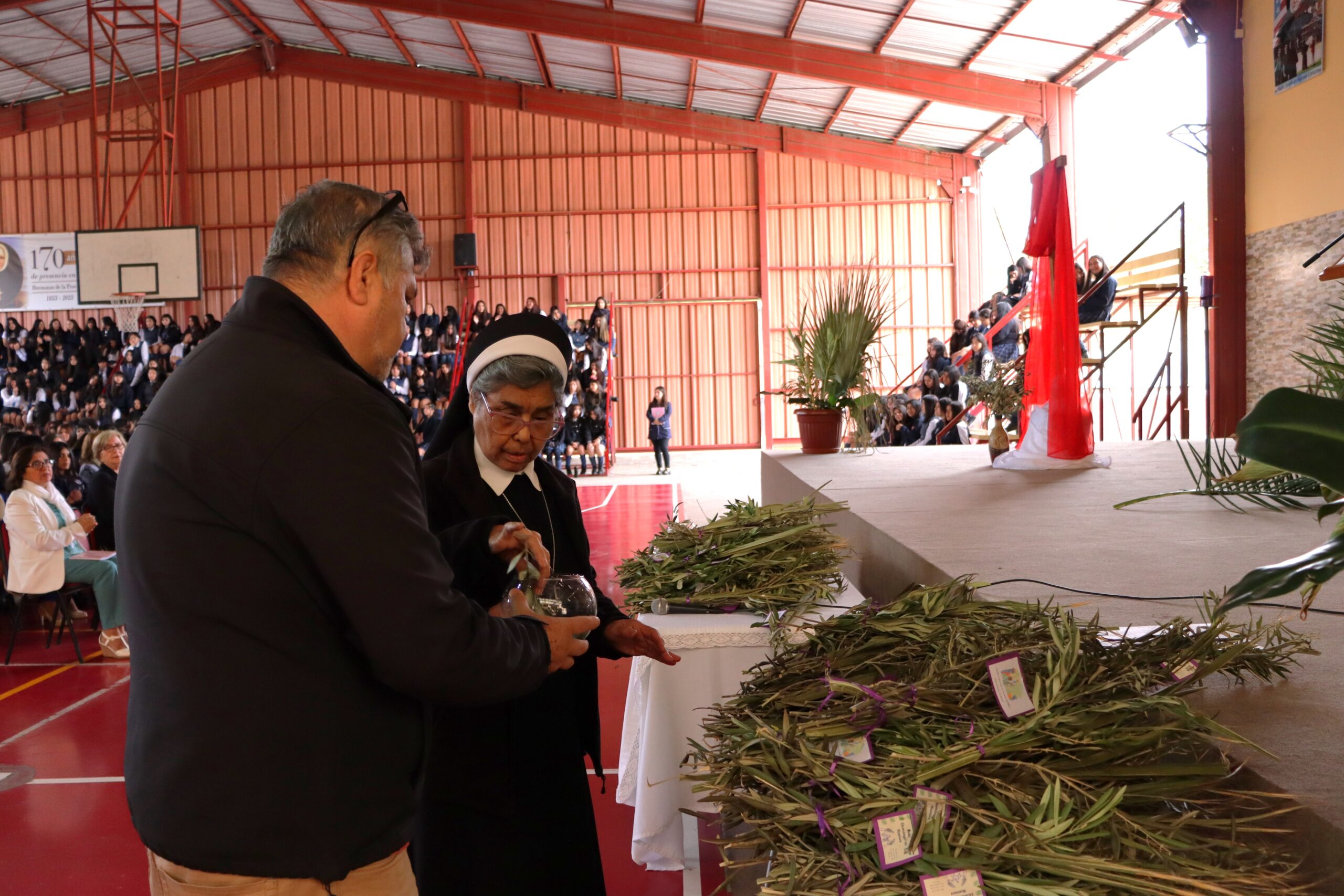 Durante la ceremonia, la Hna. Elvira Letelier bendijo e hizo entrega junto al profesor Gerardo Cortés de los ramos a cada profesor (a) Jefe con una estudiante en representación del curso, para ser puesto en la puerta de cada sala como signo de que, estamos acompañando a Jesús en su camino de muerte y resurrección.
