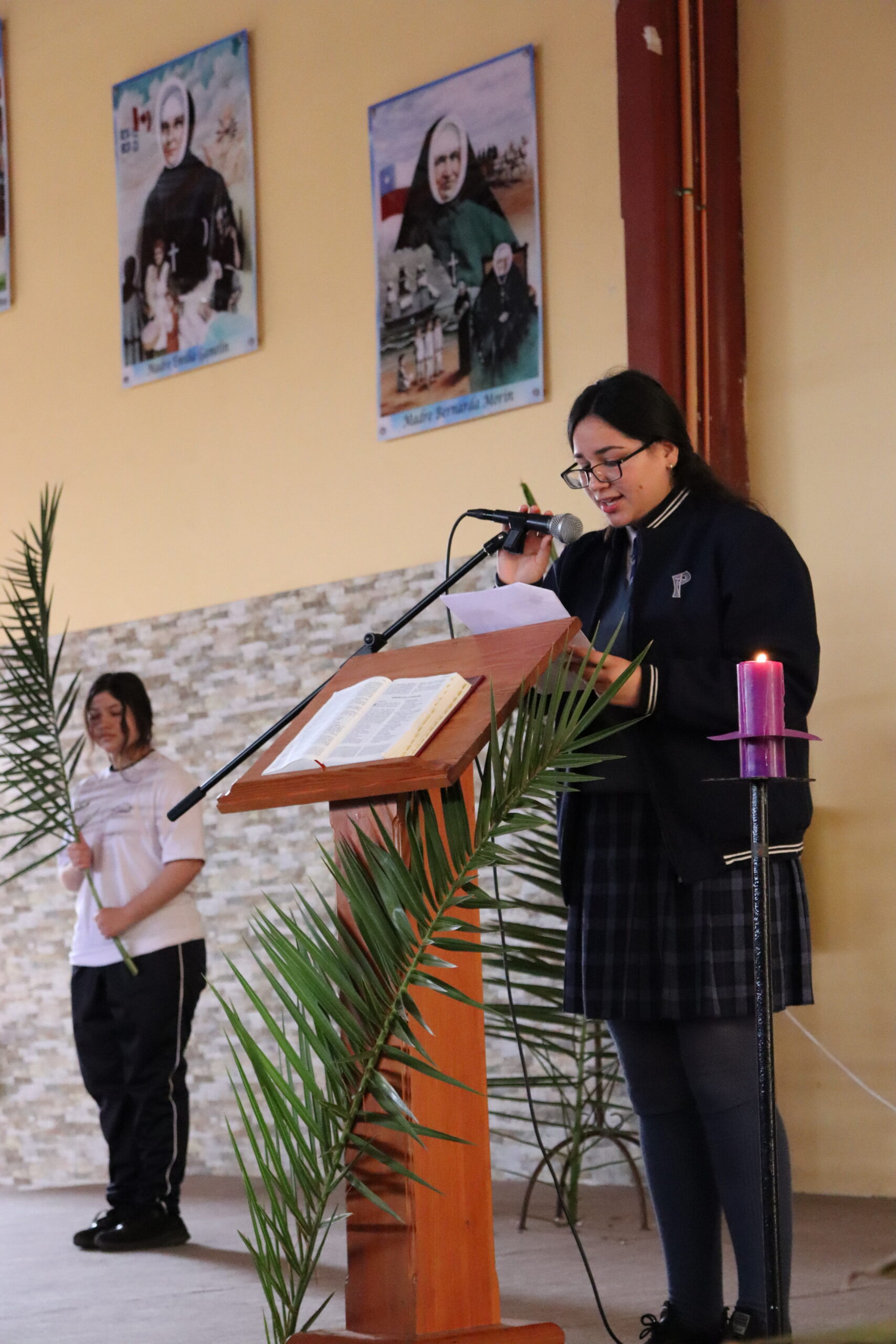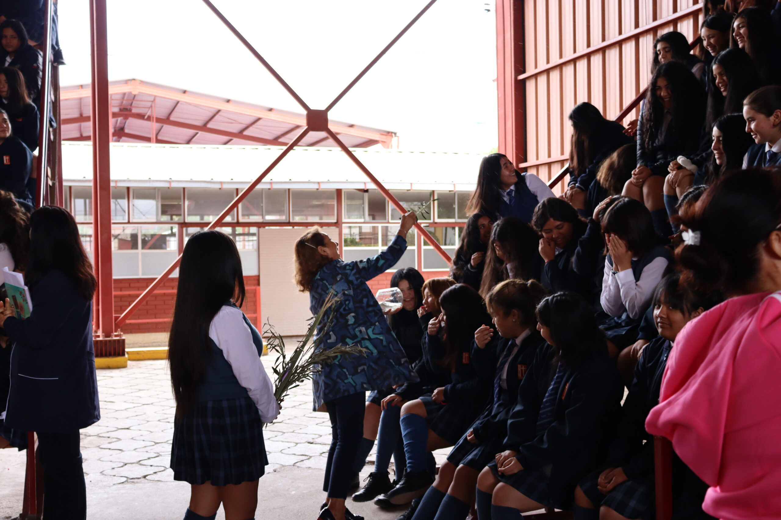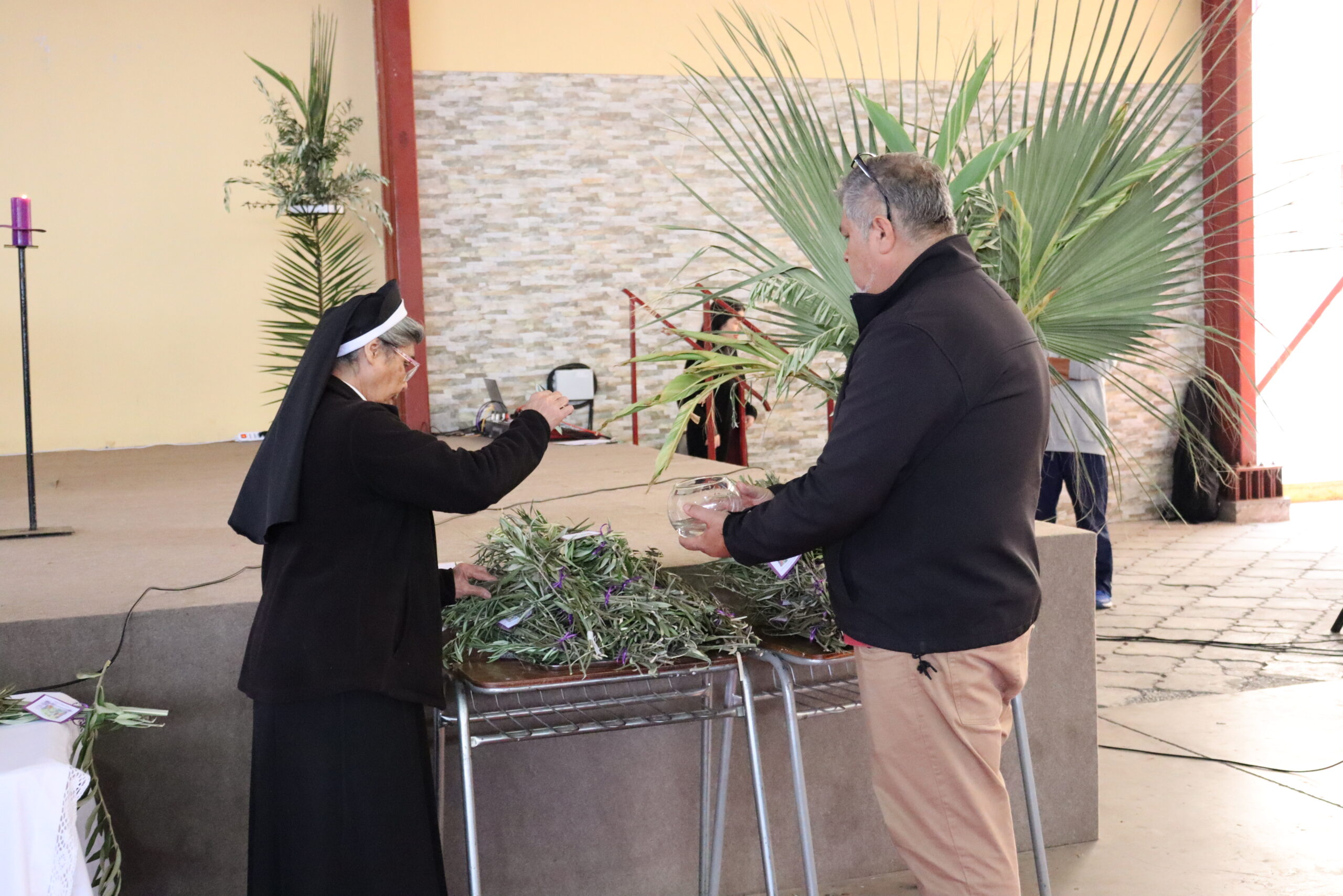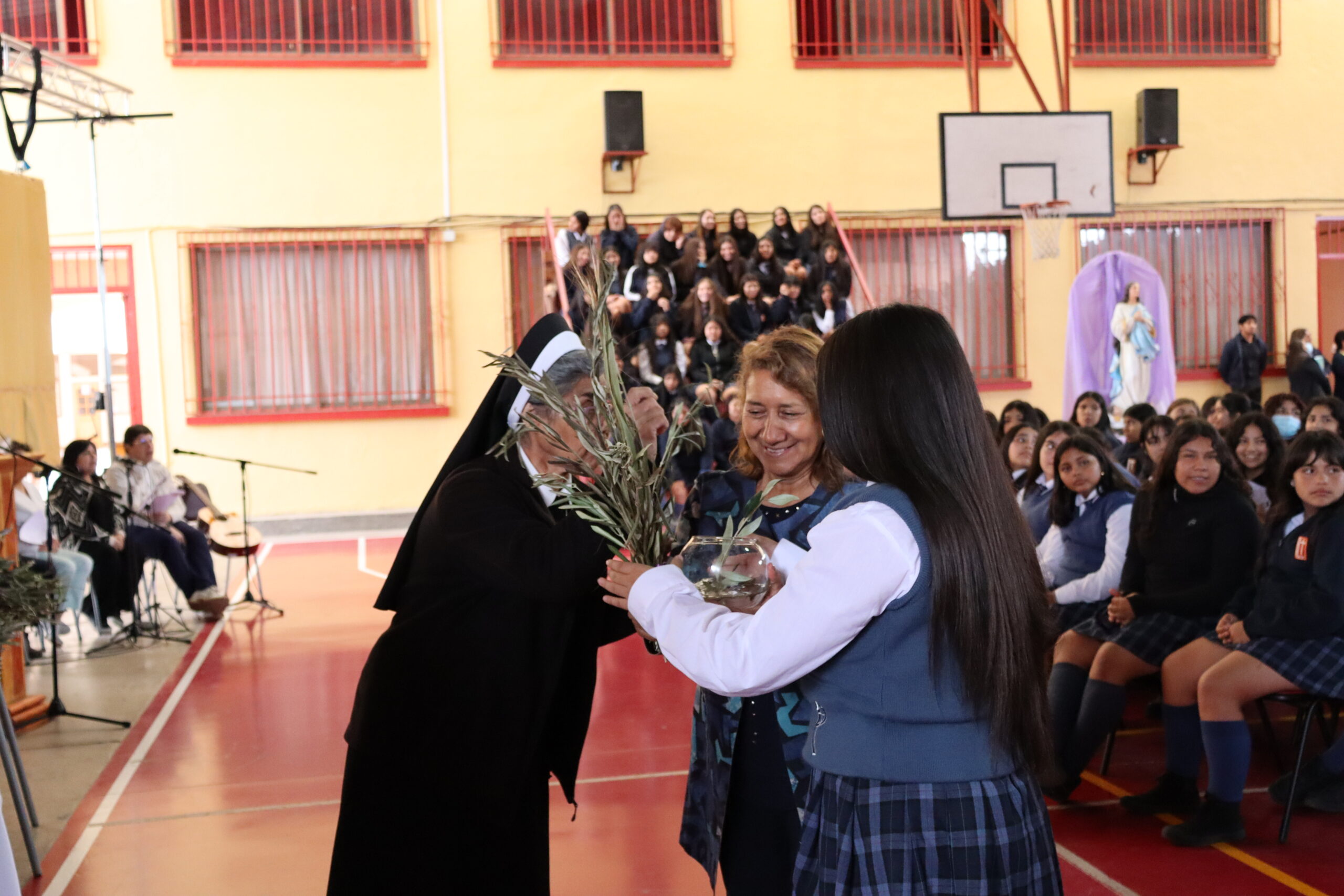 Durante la ceremonia, la Hna. Elvira Letelier bendijo e hizo entrega junto al profesor Gerardo Cortés de los ramos a cada profesor (a) Jefe con una estudiante en representación del curso, para ser puesto en la puerta de cada sala como signo de que, estamos acompañando a Jesús en su camino de muerte y resurrección.