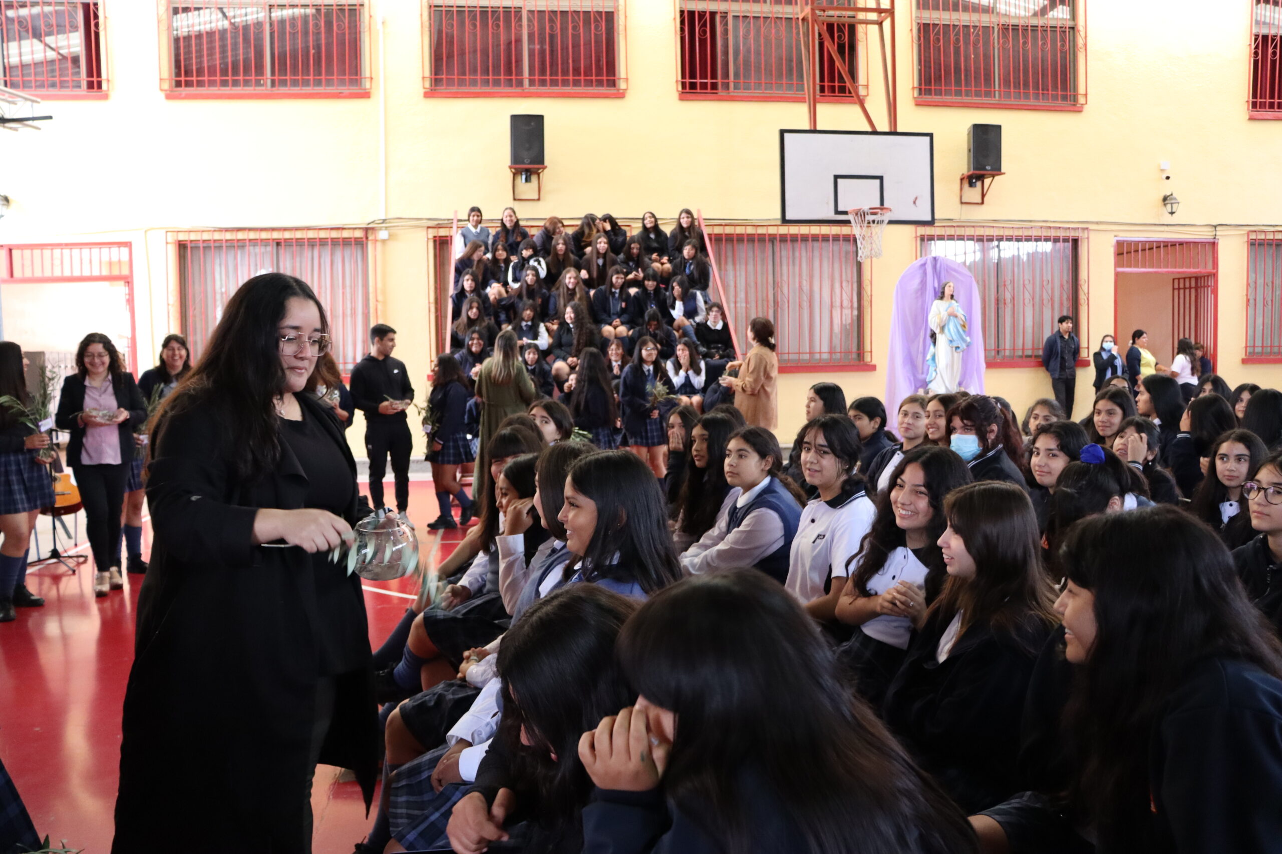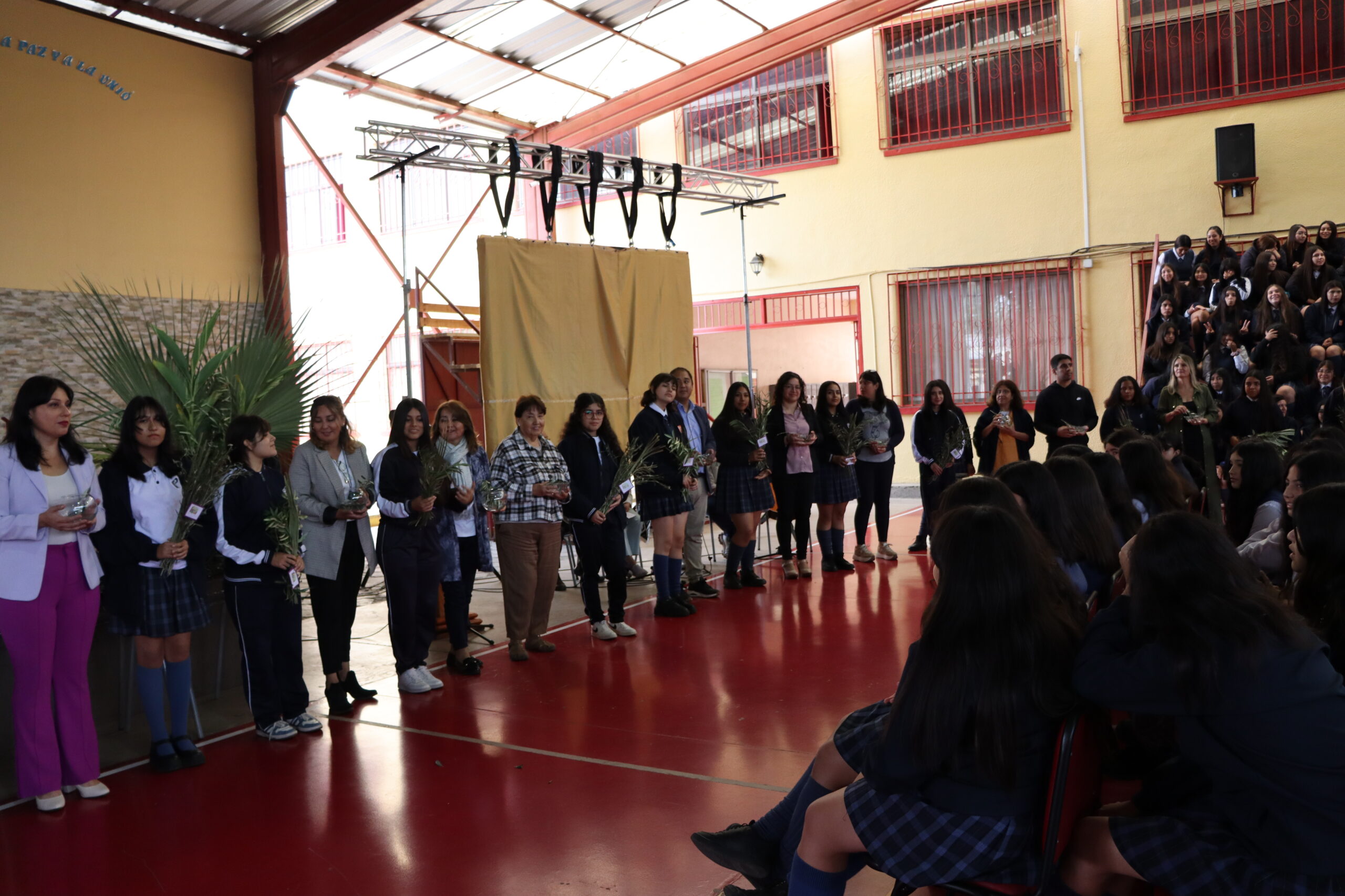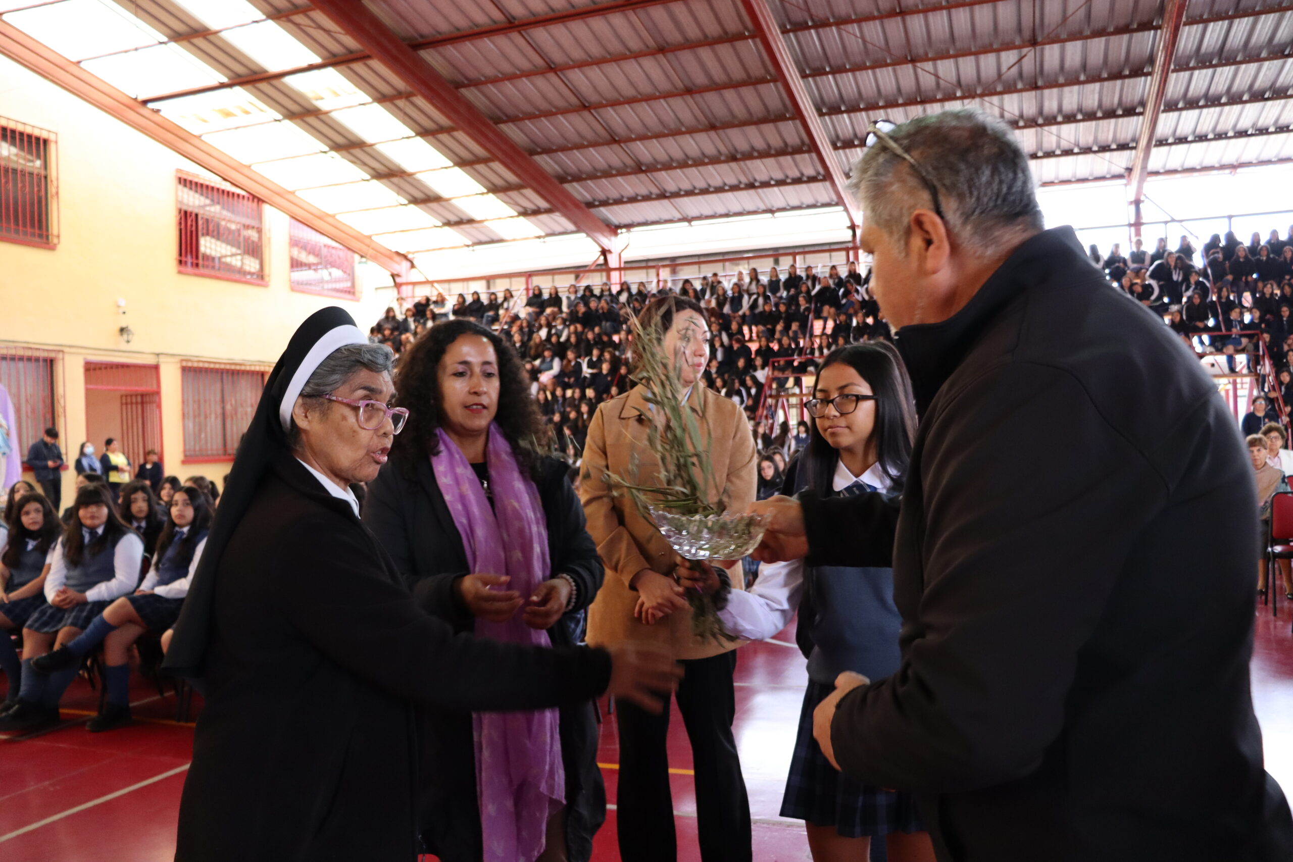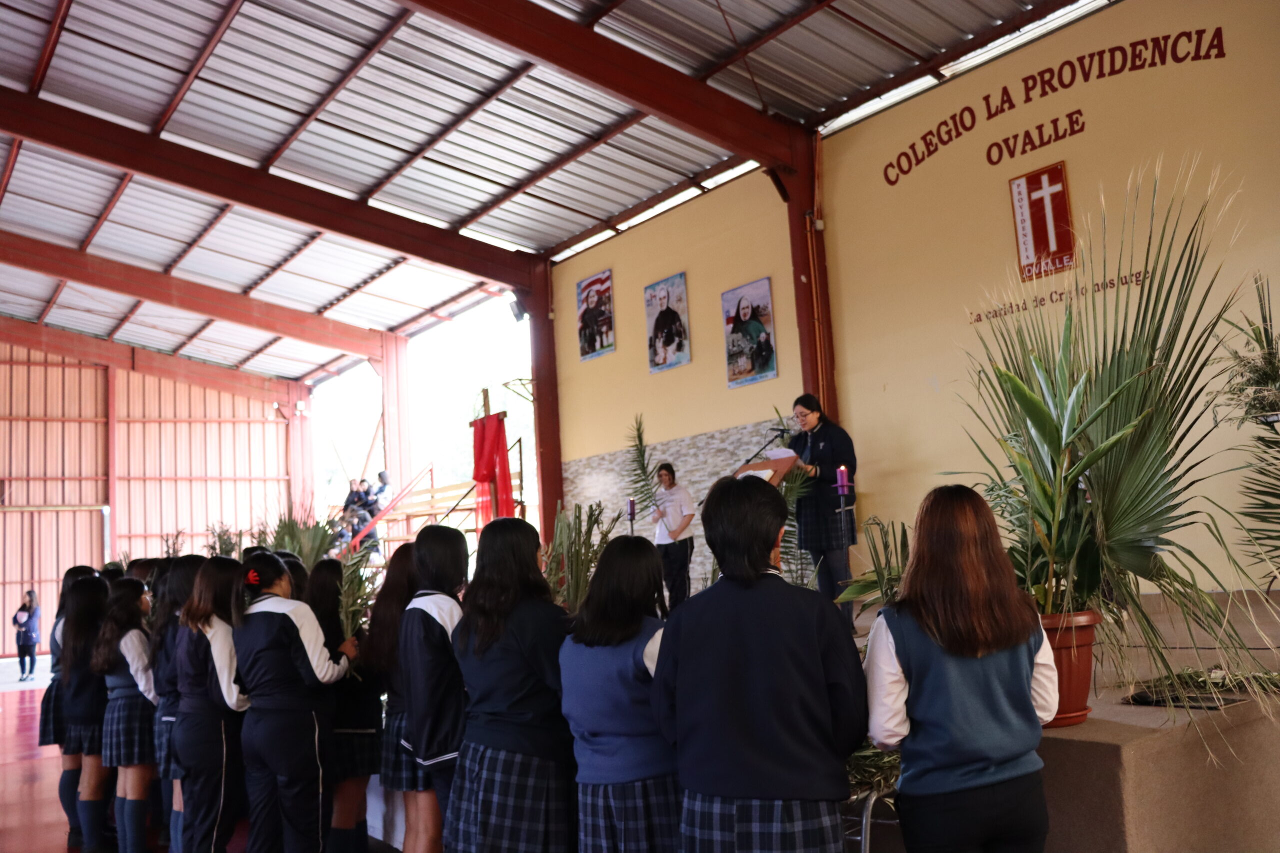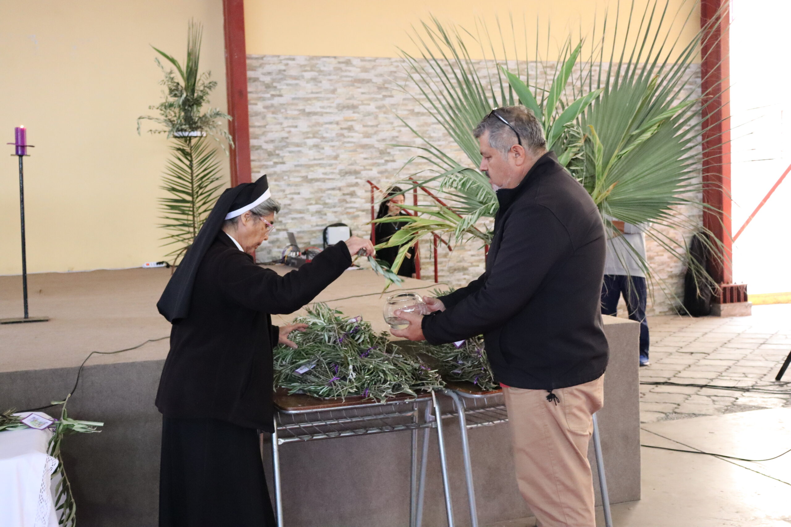 Durante la ceremonia, la Hna. Elvira Letelier bendijo e hizo entrega junto al profesor Gerardo Cortés de los ramos a cada profesor (a) Jefe con una estudiante en representación del curso, para ser puesto en la puerta de cada sala como signo de que, estamos acompañando a Jesús en su camino de muerte y resurrección.