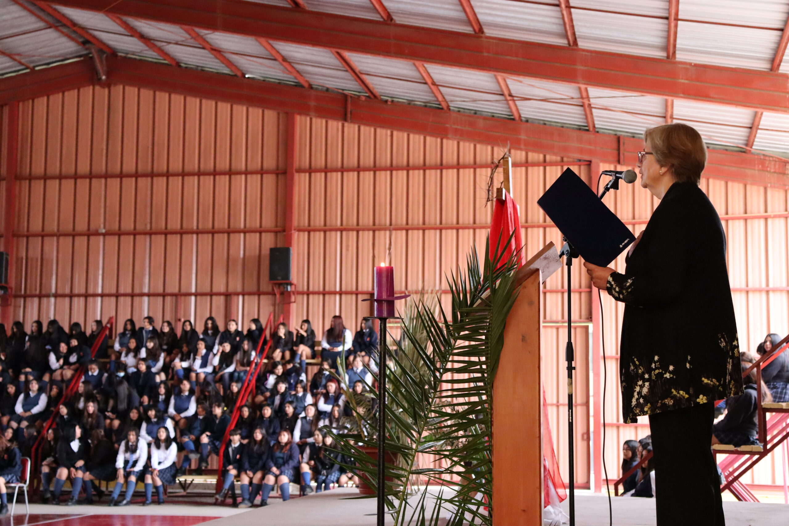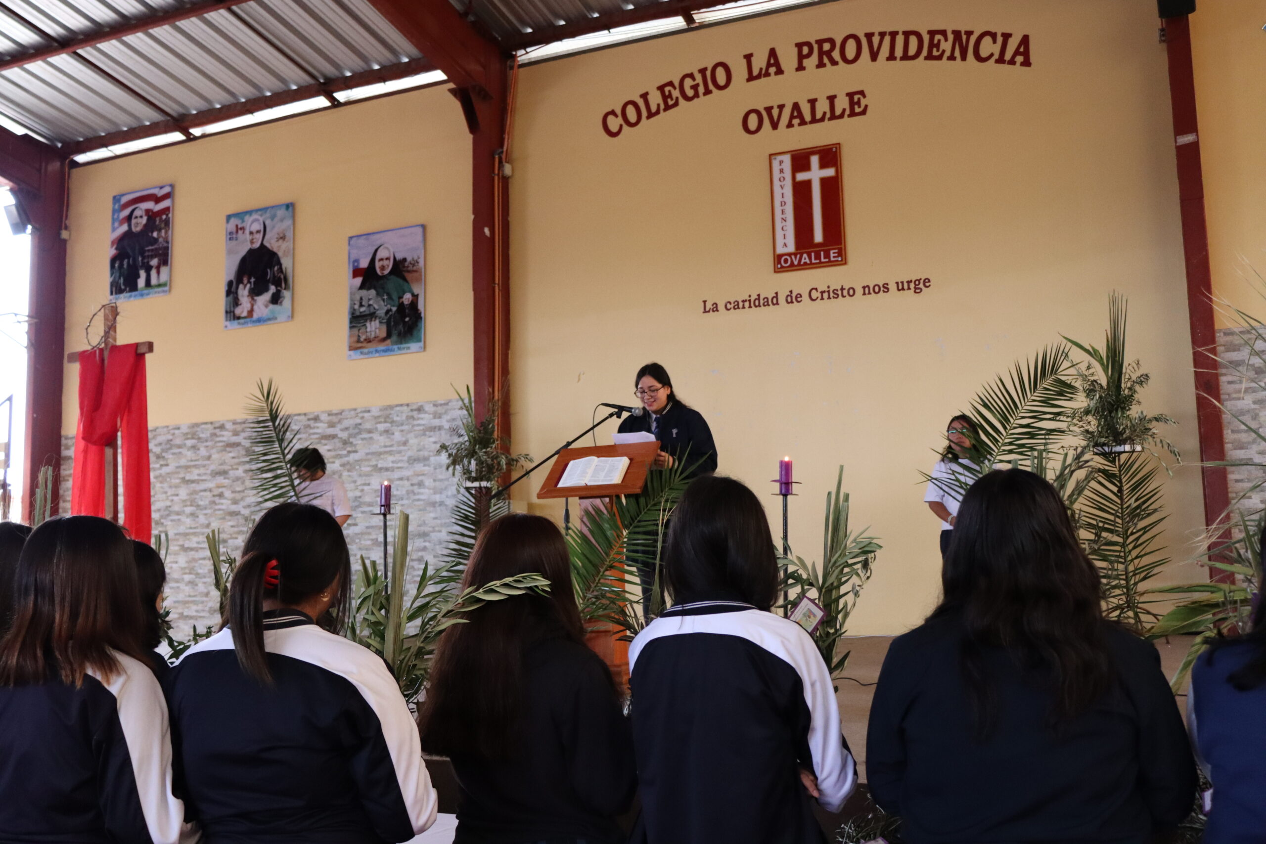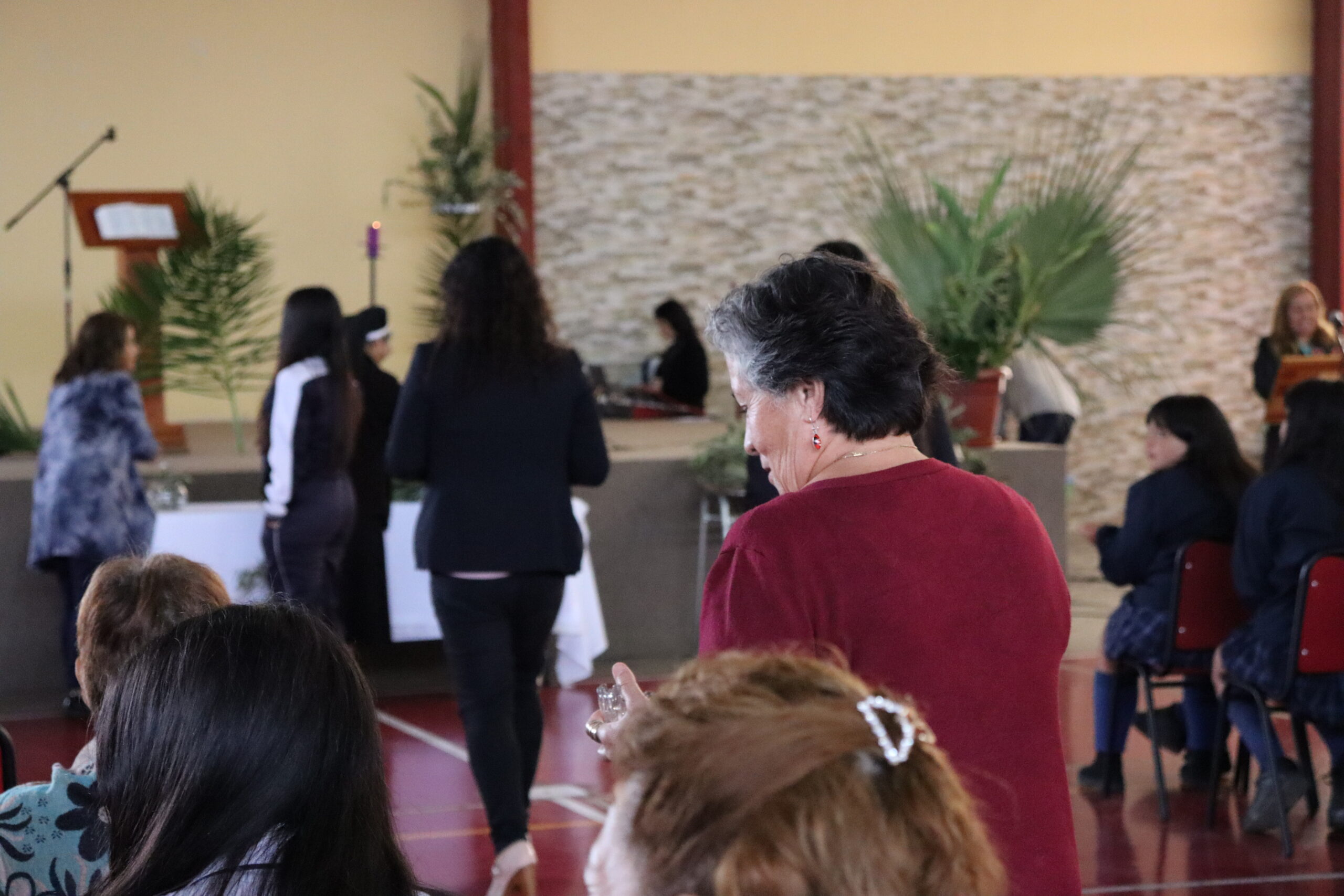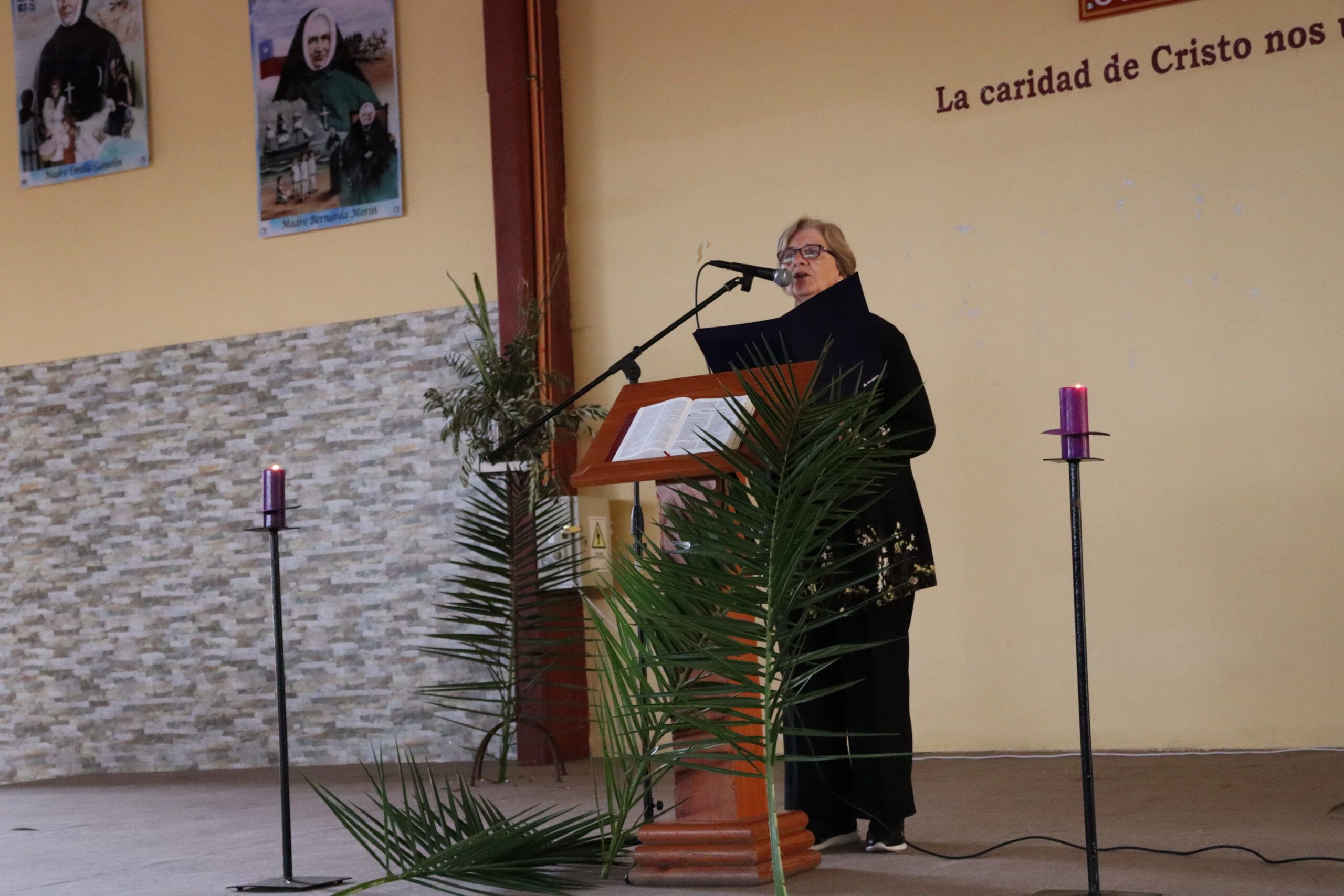 Durante la ceremonia, la Hna. Elvira Letelier bendijo e hizo entrega junto al profesor Gerardo Cortés de los ramos a cada profesor (a) Jefe con una estudiante en representación del curso, para ser puesto en la puerta de cada sala como signo de que, estamos acompañando a Jesús en su camino de muerte y resurrección.