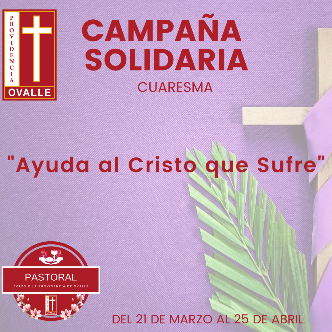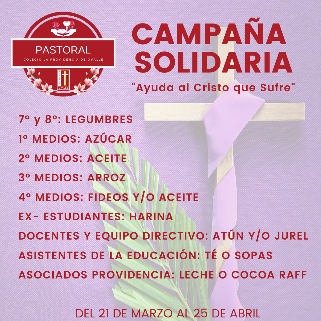 Este año la Campaña “Ayuda al Cristo que Sufre”, busca reunir alimentos y así poder armar canastas básicas, los alimentos se podrán recolectar desde el de marzo al de abril, en un carrito ubicado en la entrada principal de nuestro colegio.