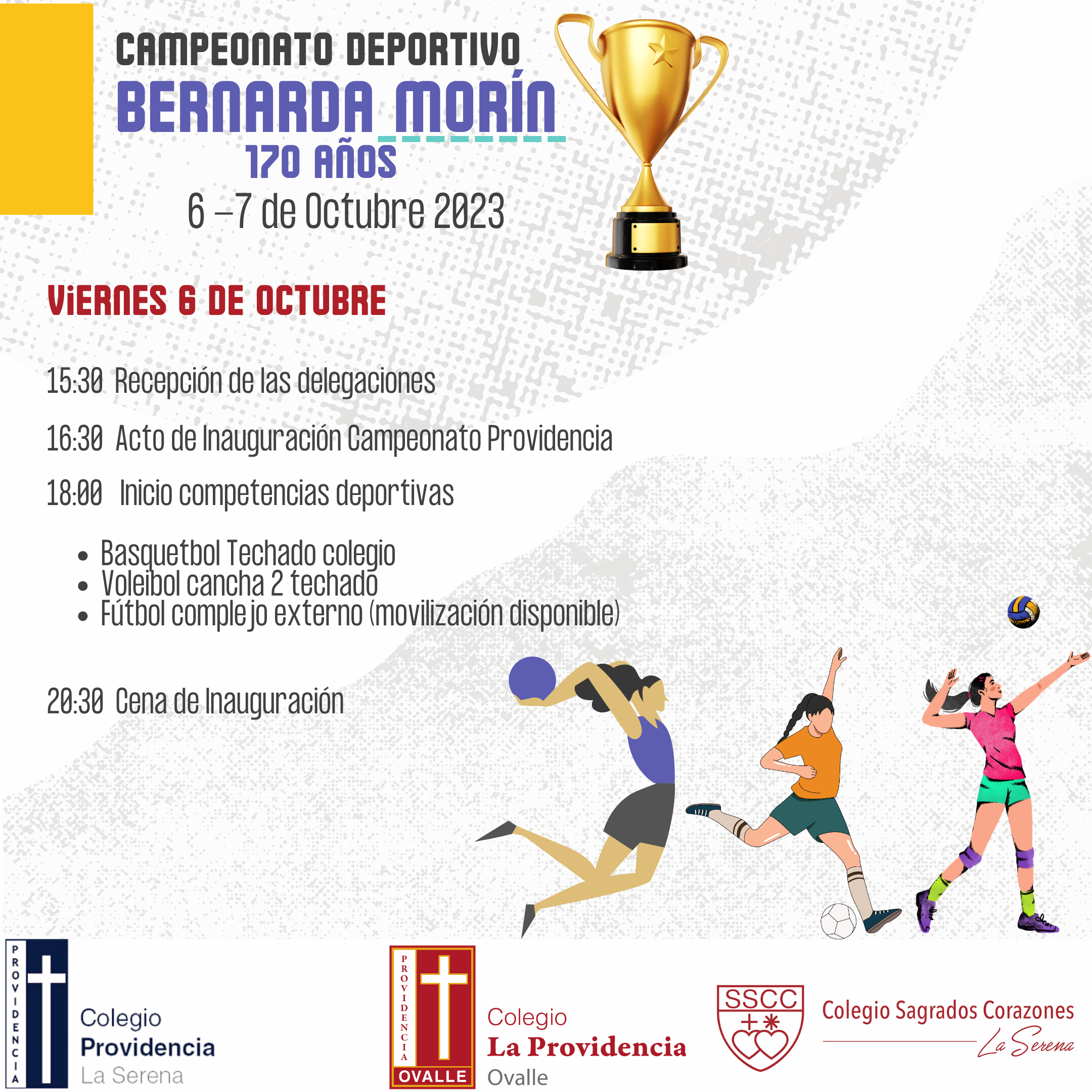 Querida Comunidad Providente, este viernes 6 y sábado 7 de octubre, tendremos el Campeonato Deportivo “Bernarda Morín” de la Zona Norte, así es, este viernes tendremos el honor de recibir las delegaciones de los Colegios Sagrados Corazones y Providencia de La Serena 🫶actividad que se enmarca en la celebración de los 170 años de la llegada de las Hermanas de la Providencia a Chile.