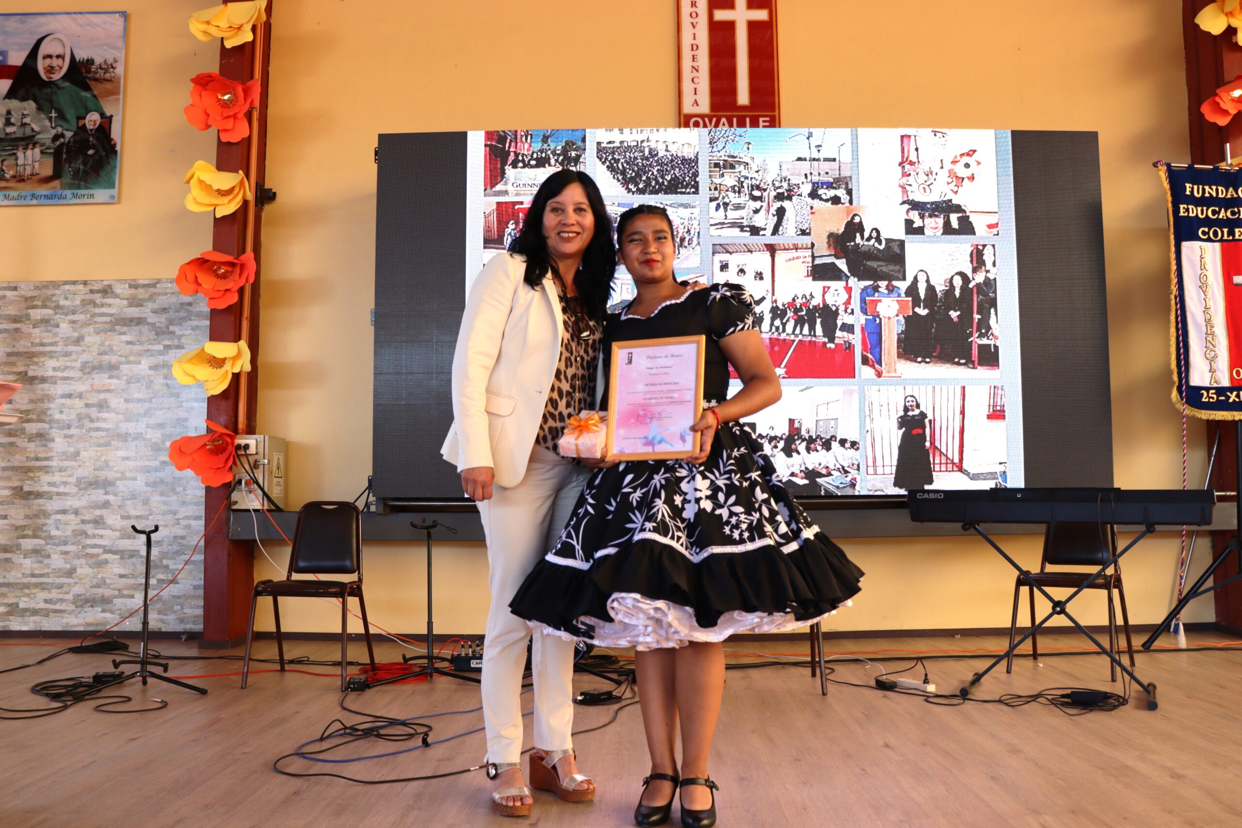 La jornada comenzó con la entrega del premio a la Mejor asistencia, distinción que simboliza la constancia y el compromiso, realizada por la Inspectora General Laura Rojas Henríquez a una estudiante por curso. Posteriormente, la Directora María Cecilia Martínez Salas otorgó el reconocimiento al Mérito Académico, que destacó a quienes alcanzaron los mejores promedios del año, demostrando excelencia en cada asignatura.