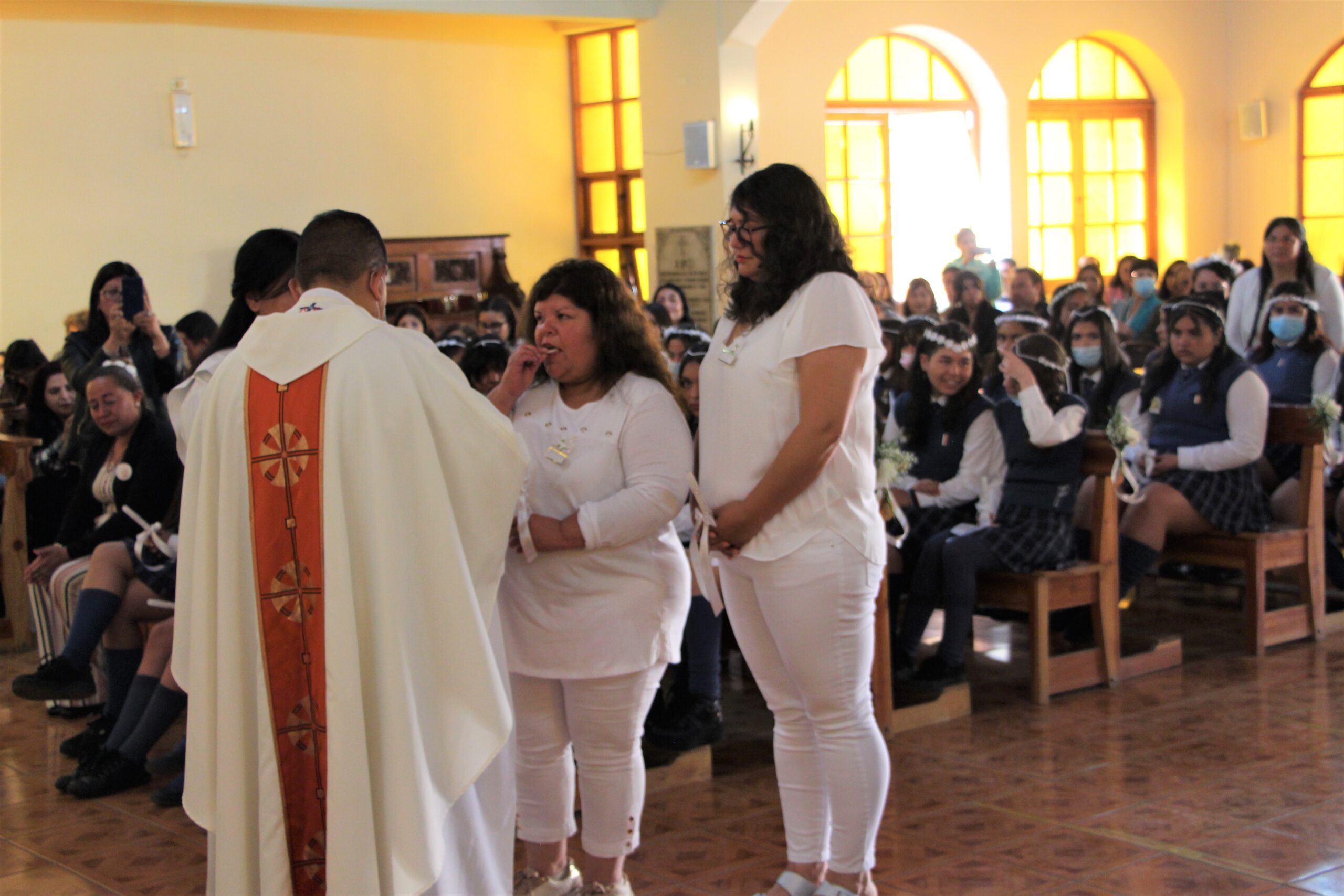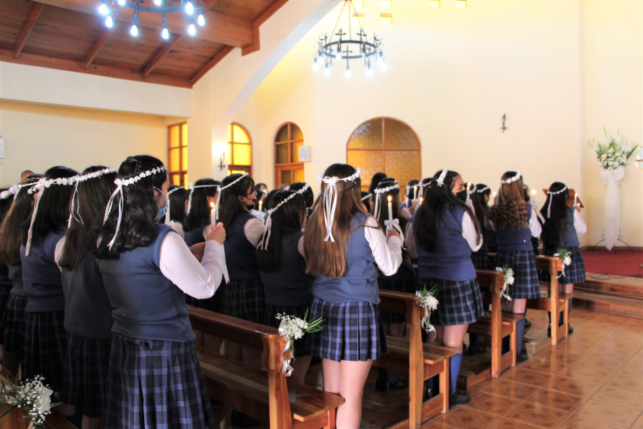 En la capilla de nuestro colegio, este pasado 02 de diciembre se celebró la misa para otorgar el Sacramento de Primera Comunión a un grupo de 56 estudiantes, dos funcionarias y 4 adultos de la Parroquia San Vicente Ferrrer con apoyo del equipo Pastoral y catequistas compuesto por la Hna. María Antonieta Trimpay, Encargada de Pastoral, Pilar Rojas y los catequistas Cindy Esquivel y Claudio Huichacura.