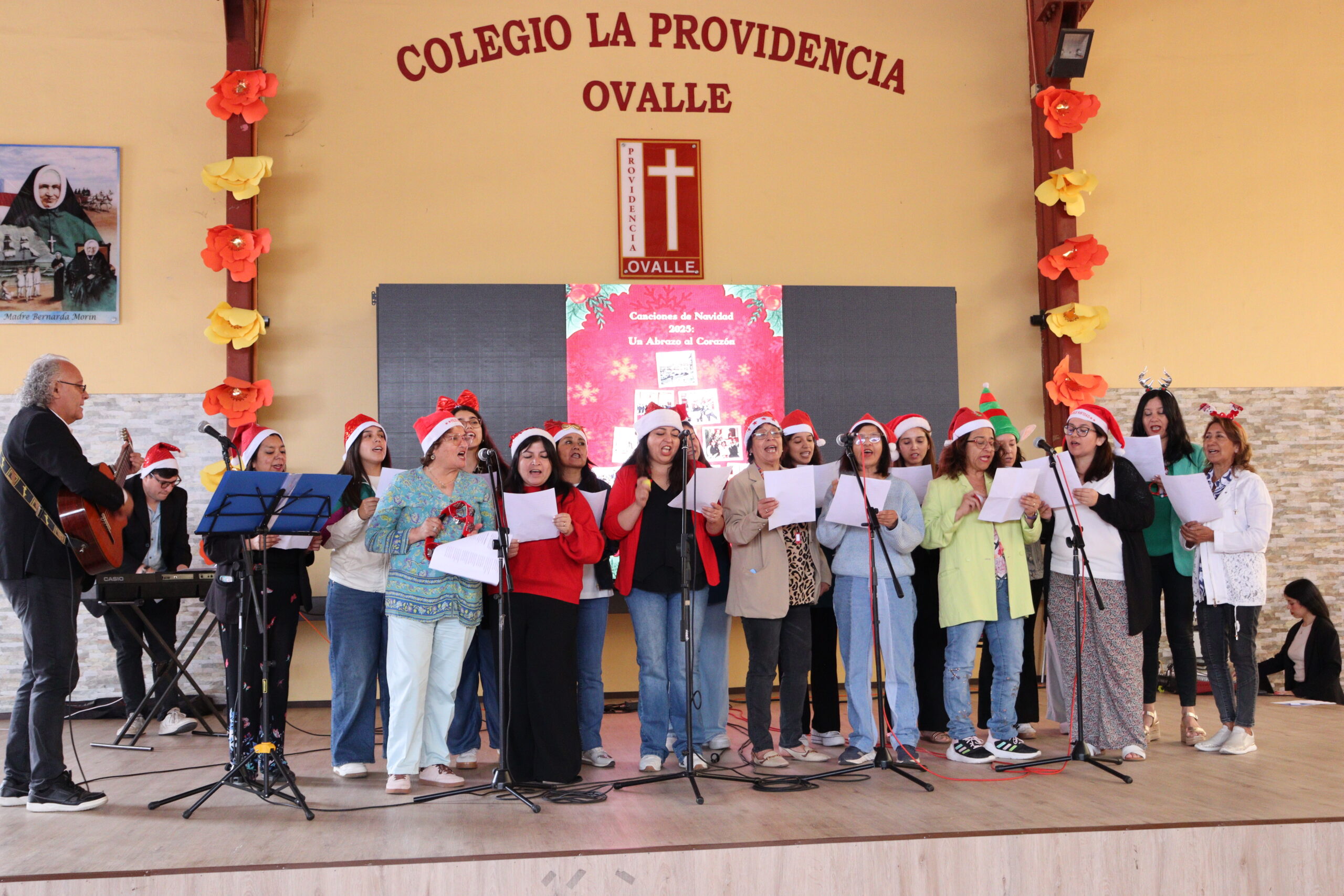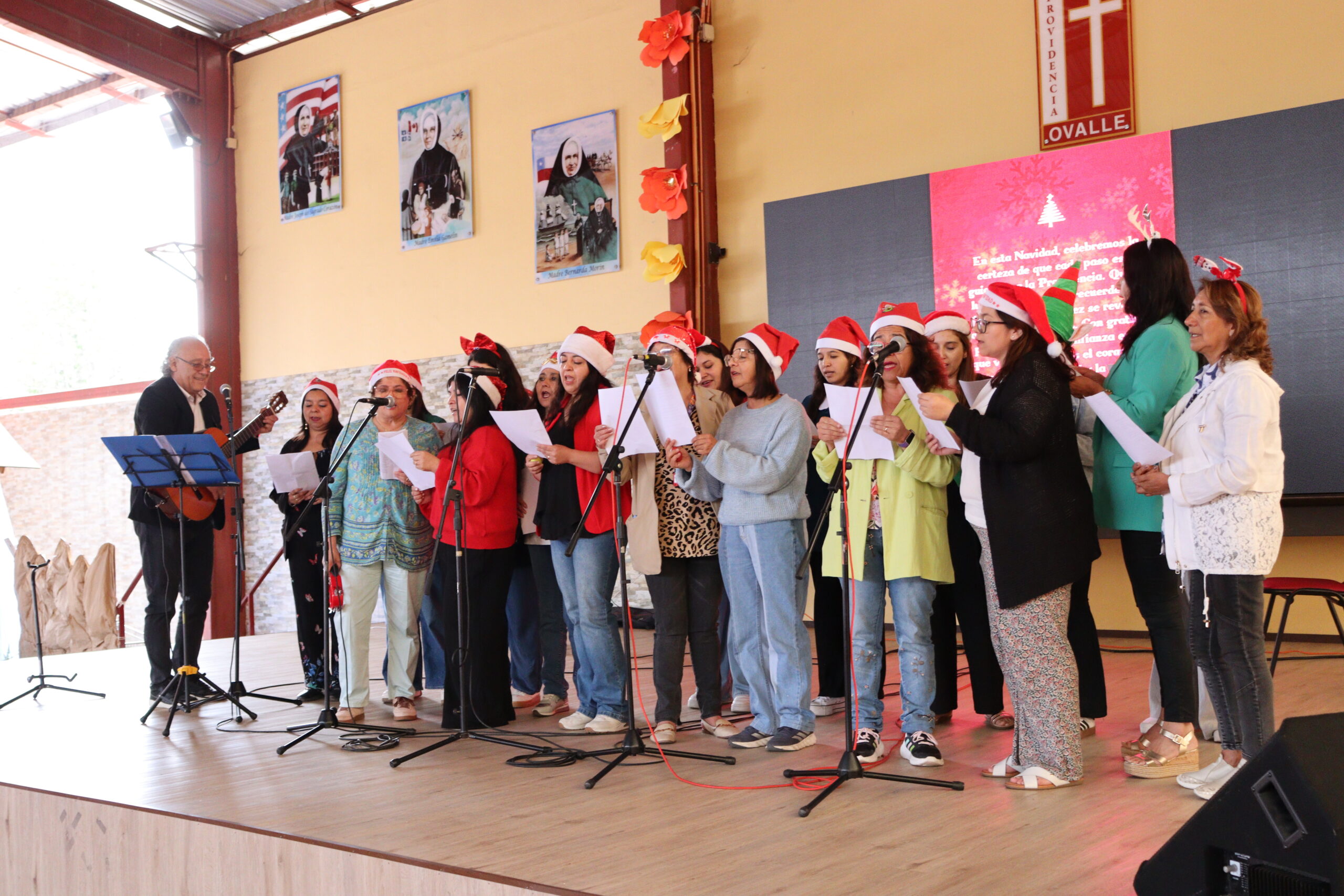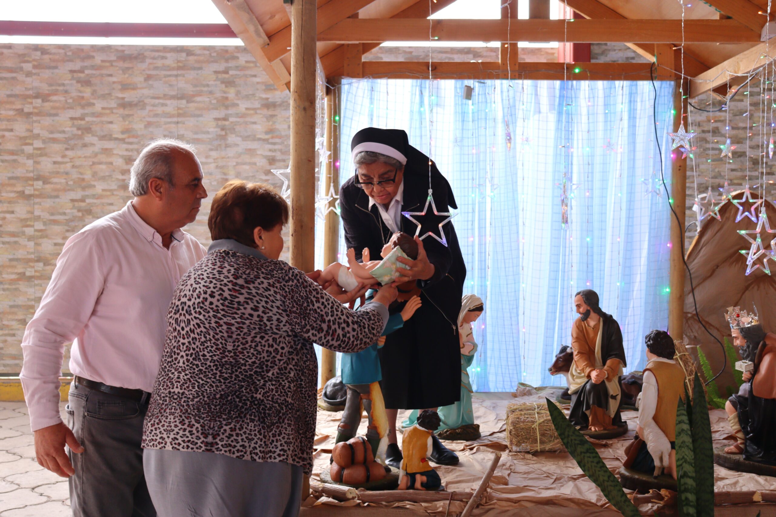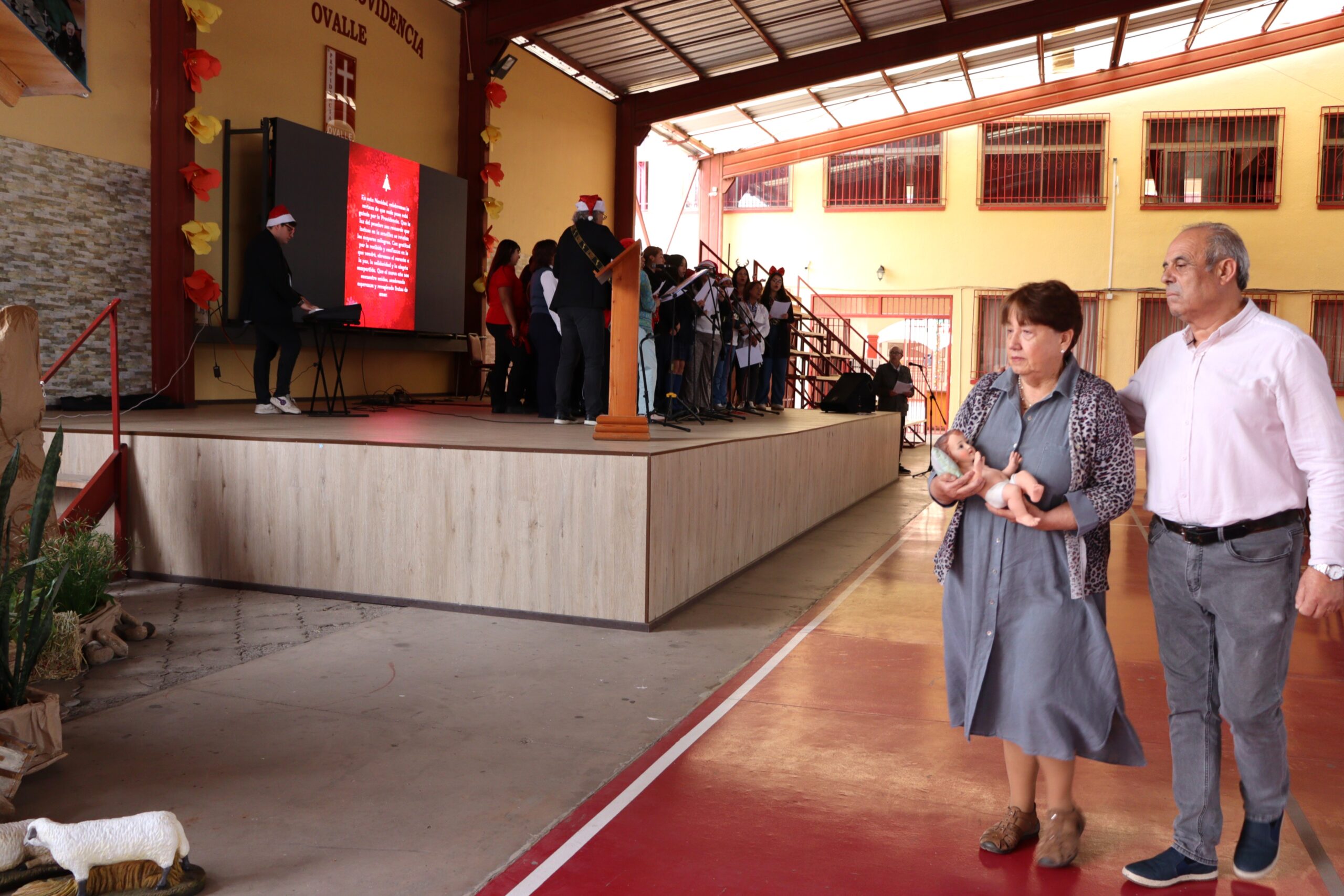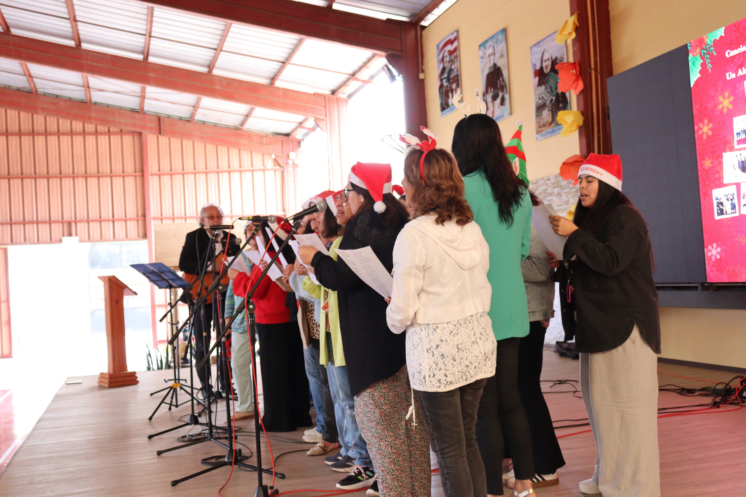 Posteriormente, se dio paso a los villancicos, iniciando con la academia de inglés, seguida por la academia de coro y la academia de banda. La sorpresa la entregó el coro de funcionarios, quienes interpretaron villancicos con alegría y unidad. Finalmente, todos los grupos se unieron para cantar Noche de Paz, mientras la imagen del Niño Jesús era llevada al pesebre y recibida por la Hna. Elvira Letelier, quien la posó en el lugar central.