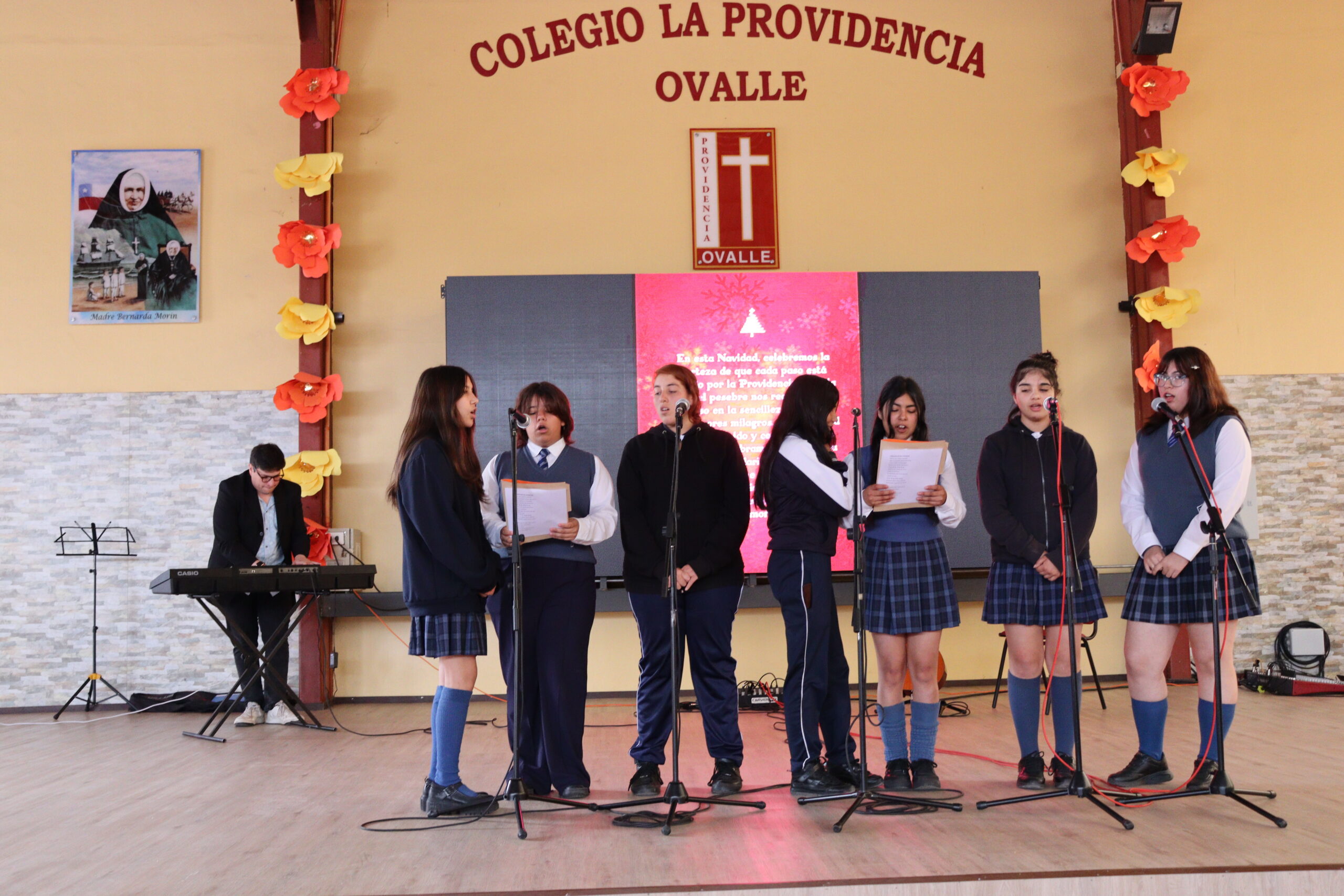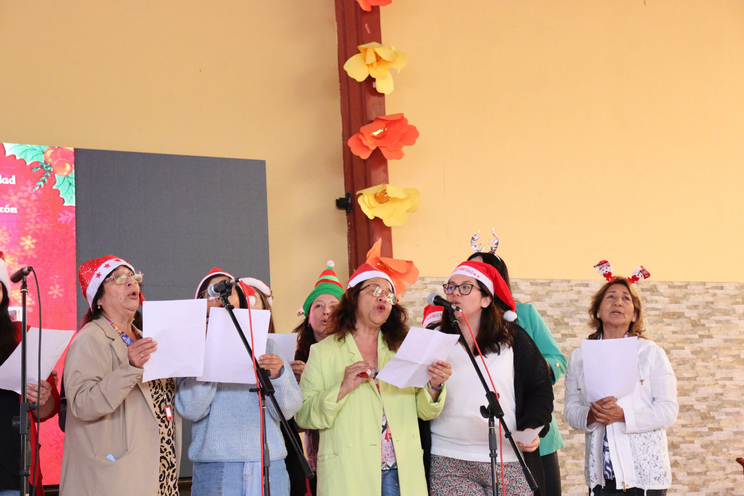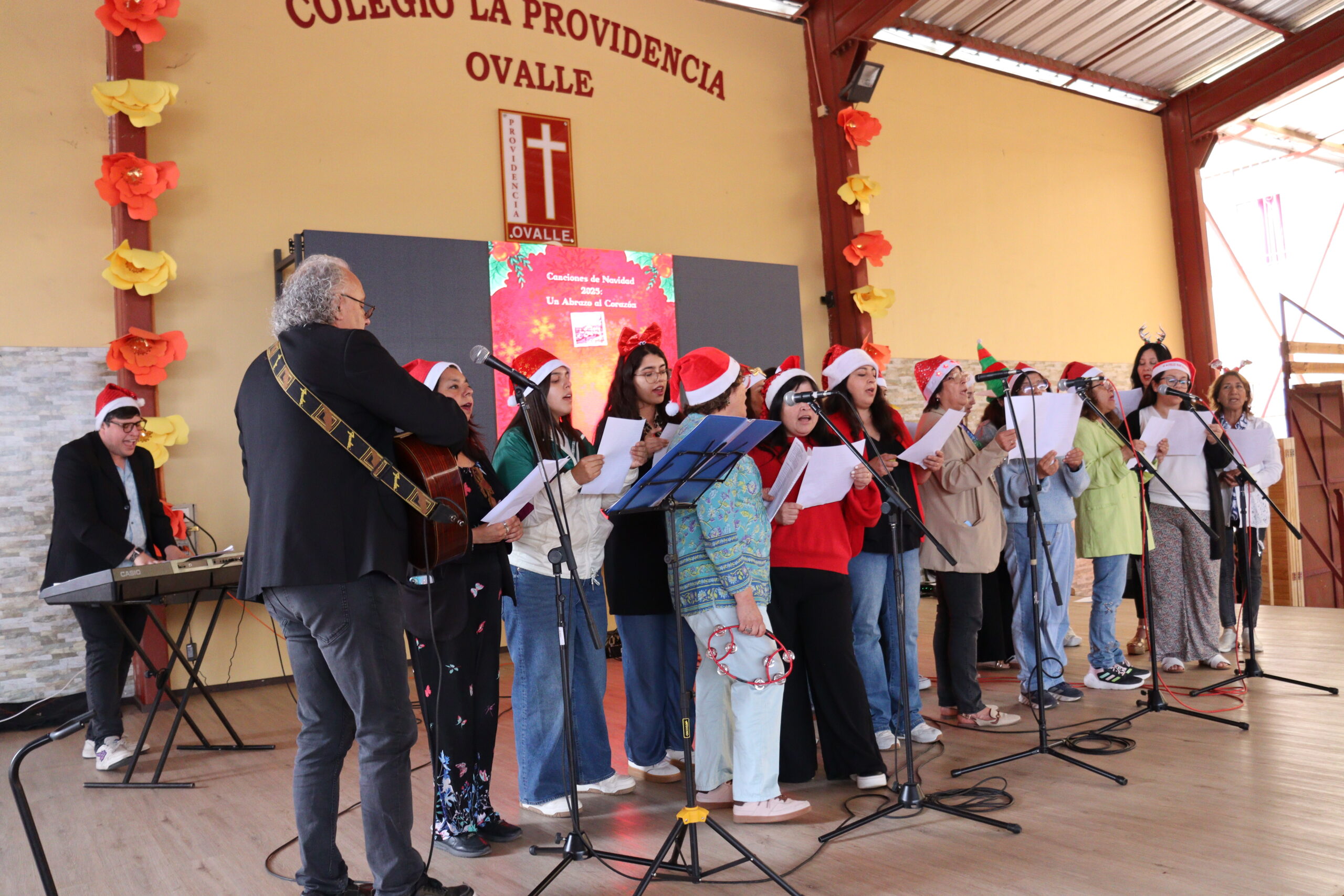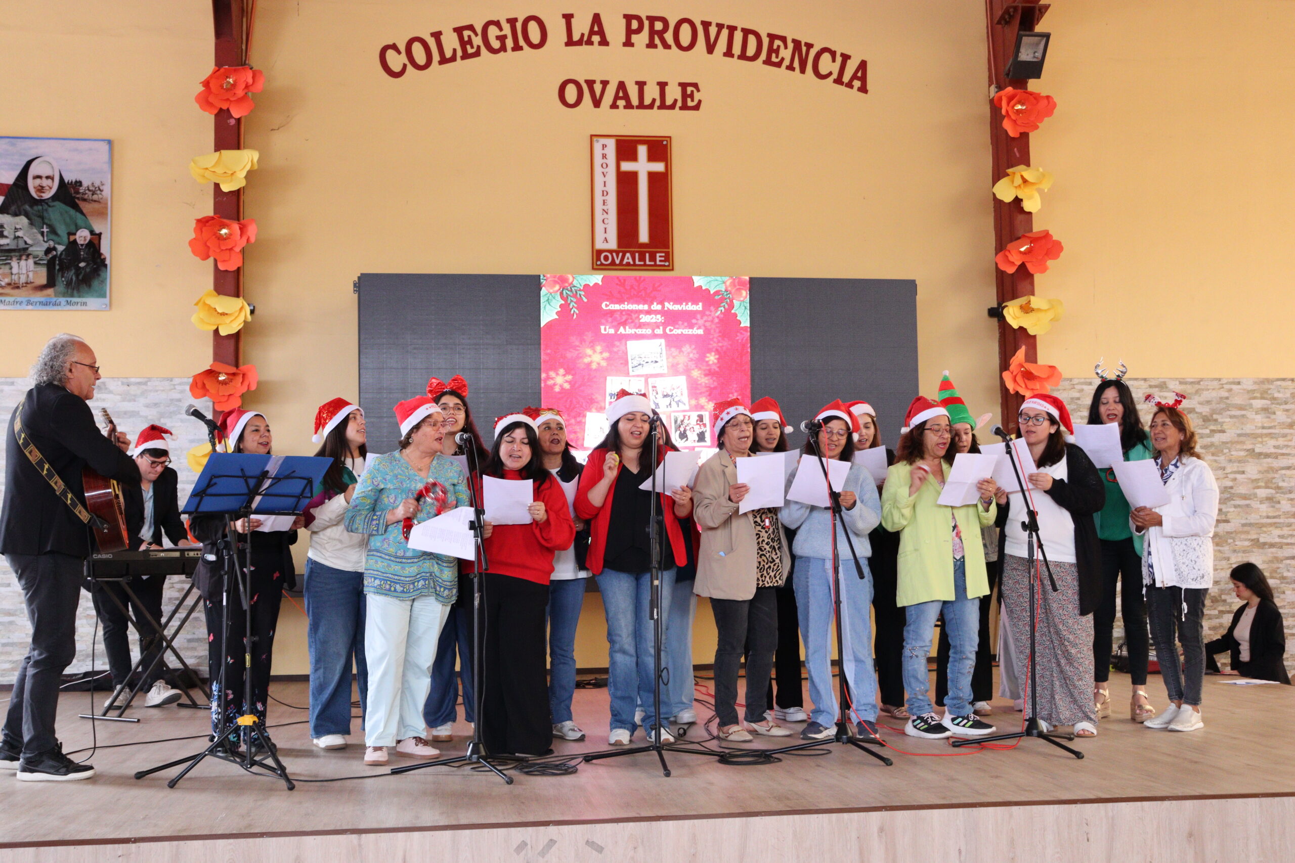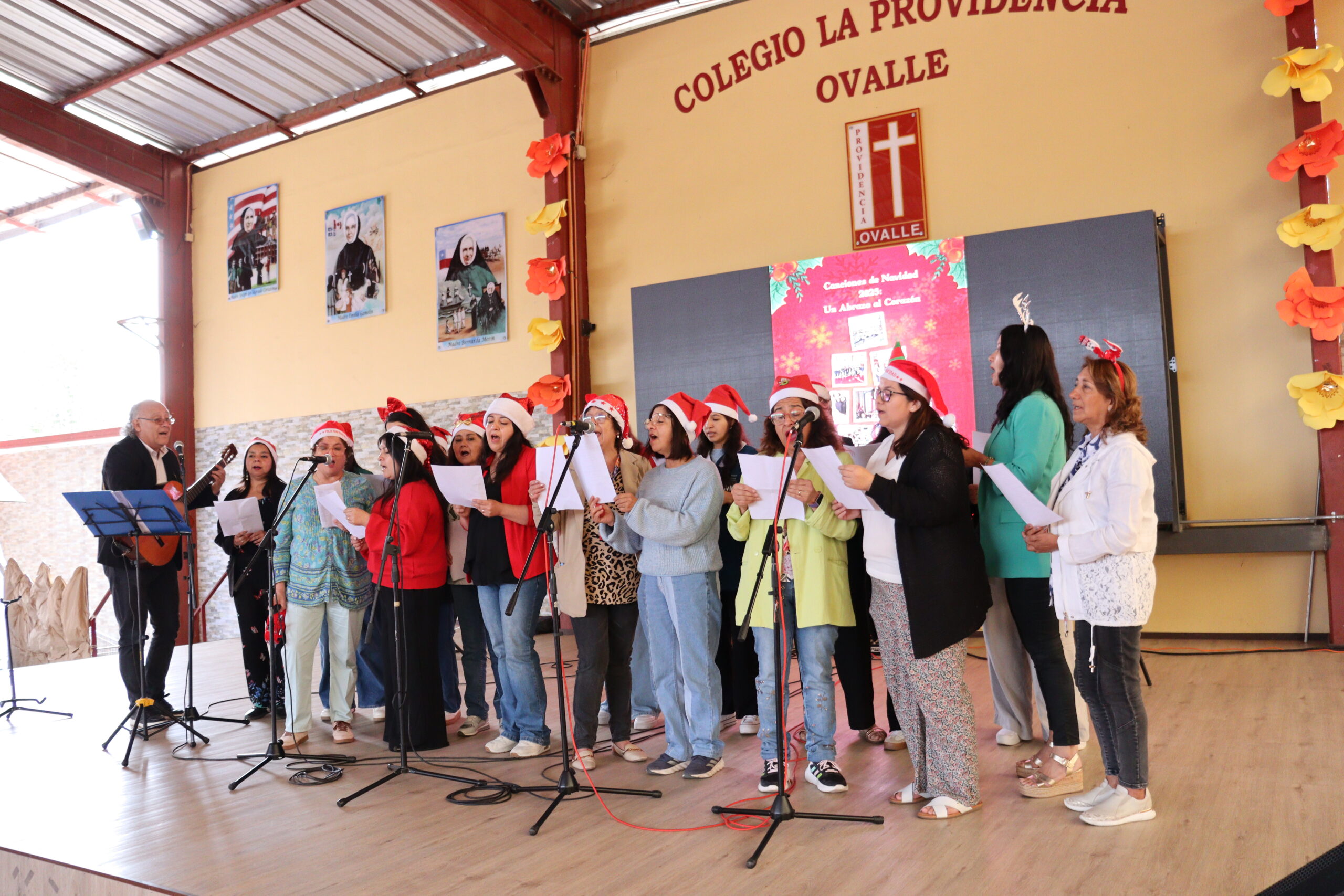 Posteriormente, se dio paso a los villancicos, iniciando con la academia de inglés, seguida por la academia de coro y la academia de banda. La sorpresa la entregó el coro de funcionarios, quienes interpretaron villancicos con alegría y unidad. Finalmente, todos los grupos se unieron para cantar Noche de Paz, mientras la imagen del Niño Jesús era llevada al pesebre y recibida por la Hna. Elvira Letelier, quien la posó en el lugar central.