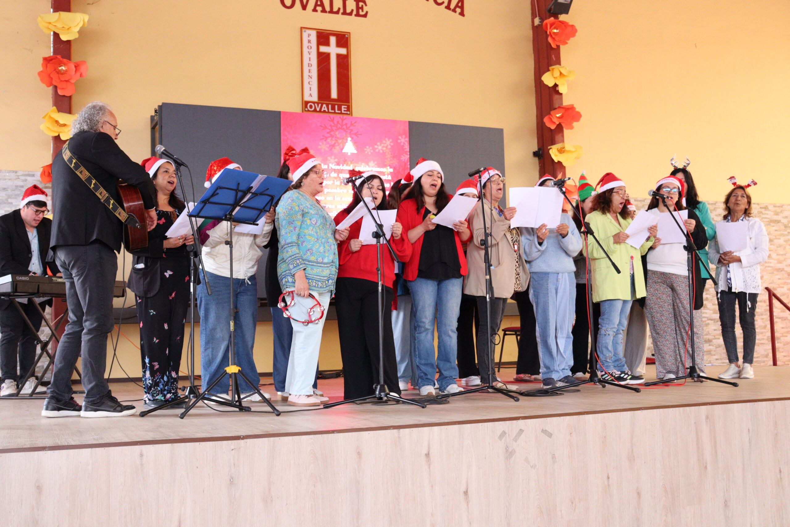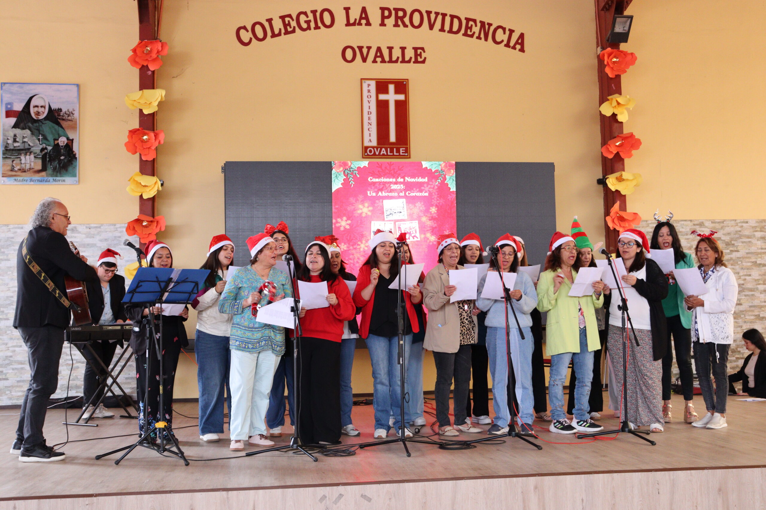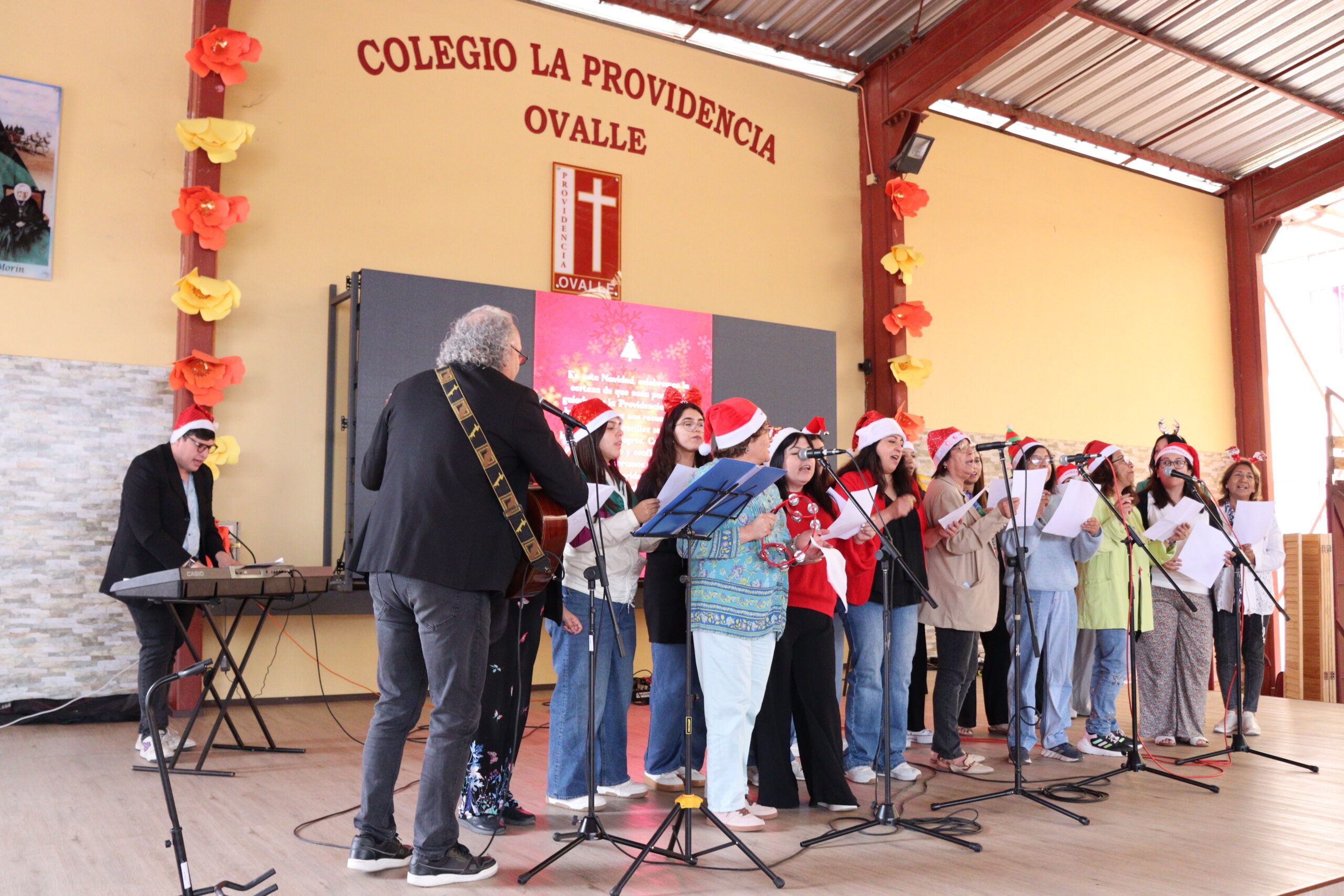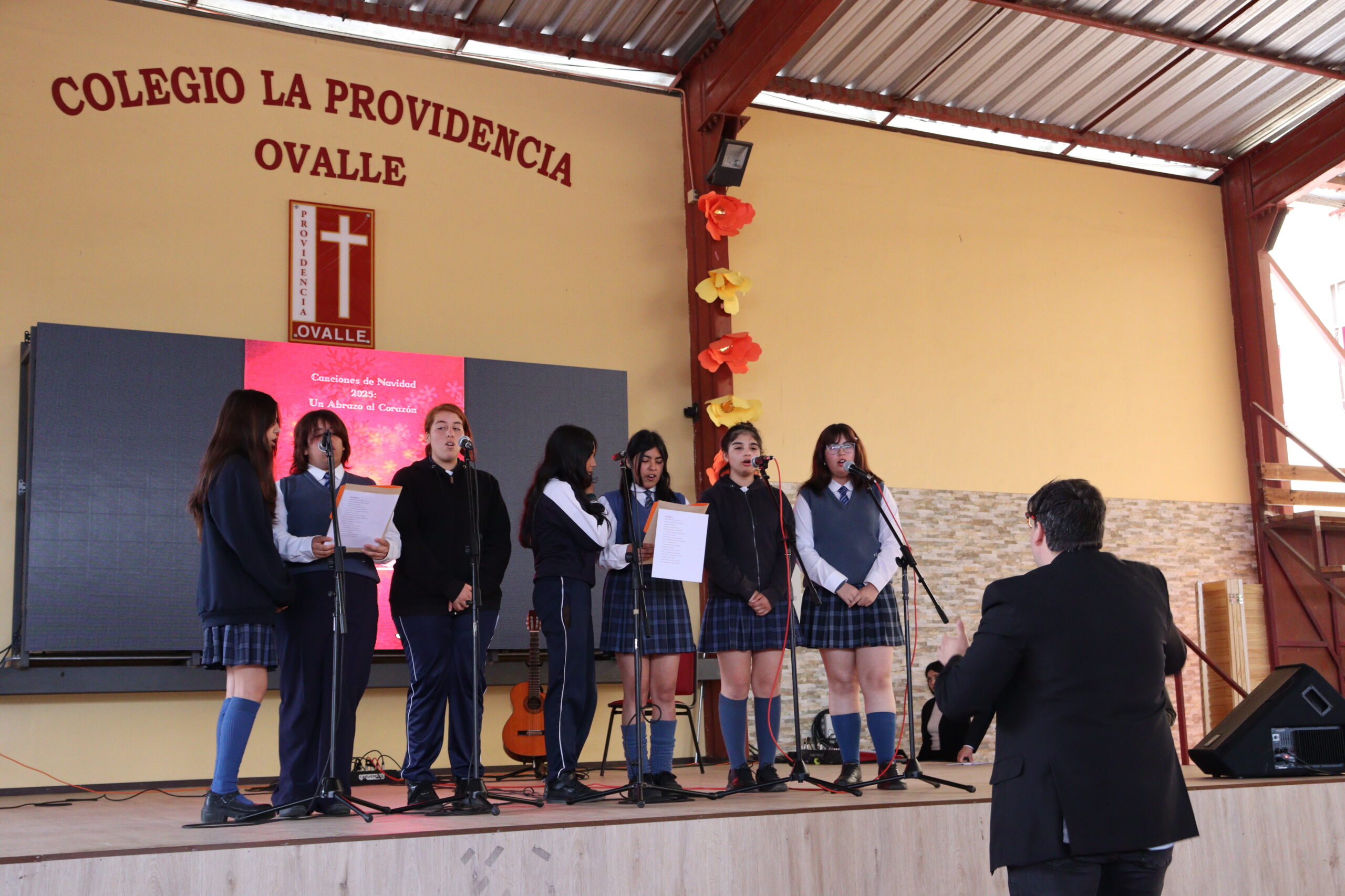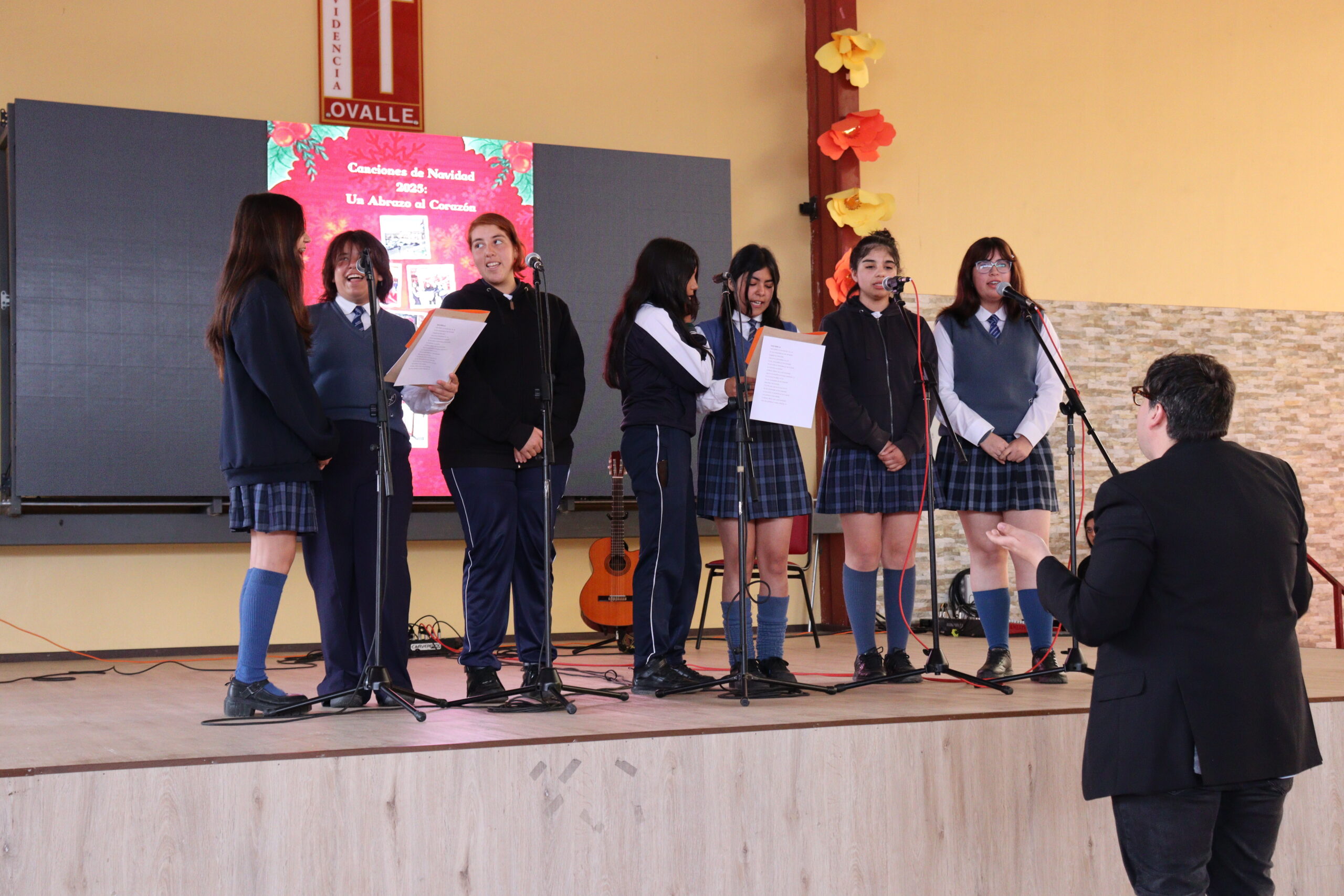 Posteriormente, se dio paso a los villancicos, iniciando con la academia de inglés, seguida por la academia de coro y la academia de banda. La sorpresa la entregó el coro de funcionarios, quienes interpretaron villancicos con alegría y unidad. Finalmente, todos los grupos se unieron para cantar Noche de Paz, mientras la imagen del Niño Jesús era llevada al pesebre y recibida por la Hna. Elvira Letelier, quien la posó en el lugar central.