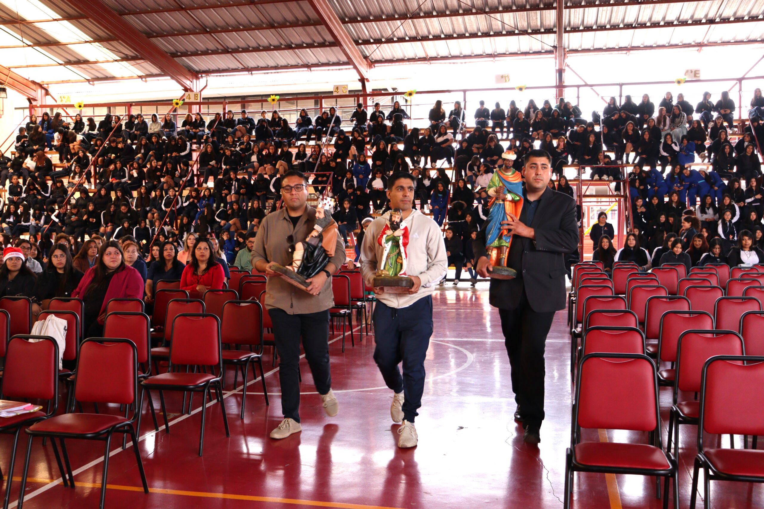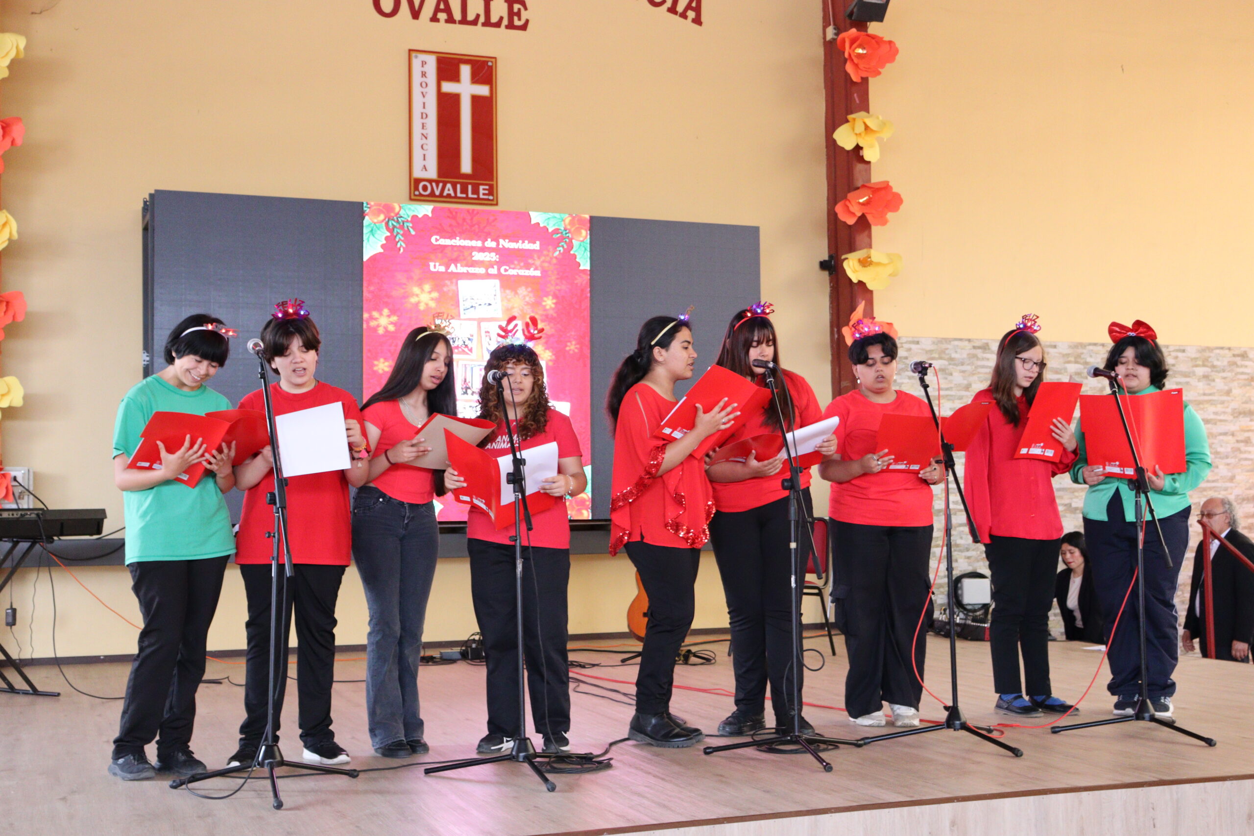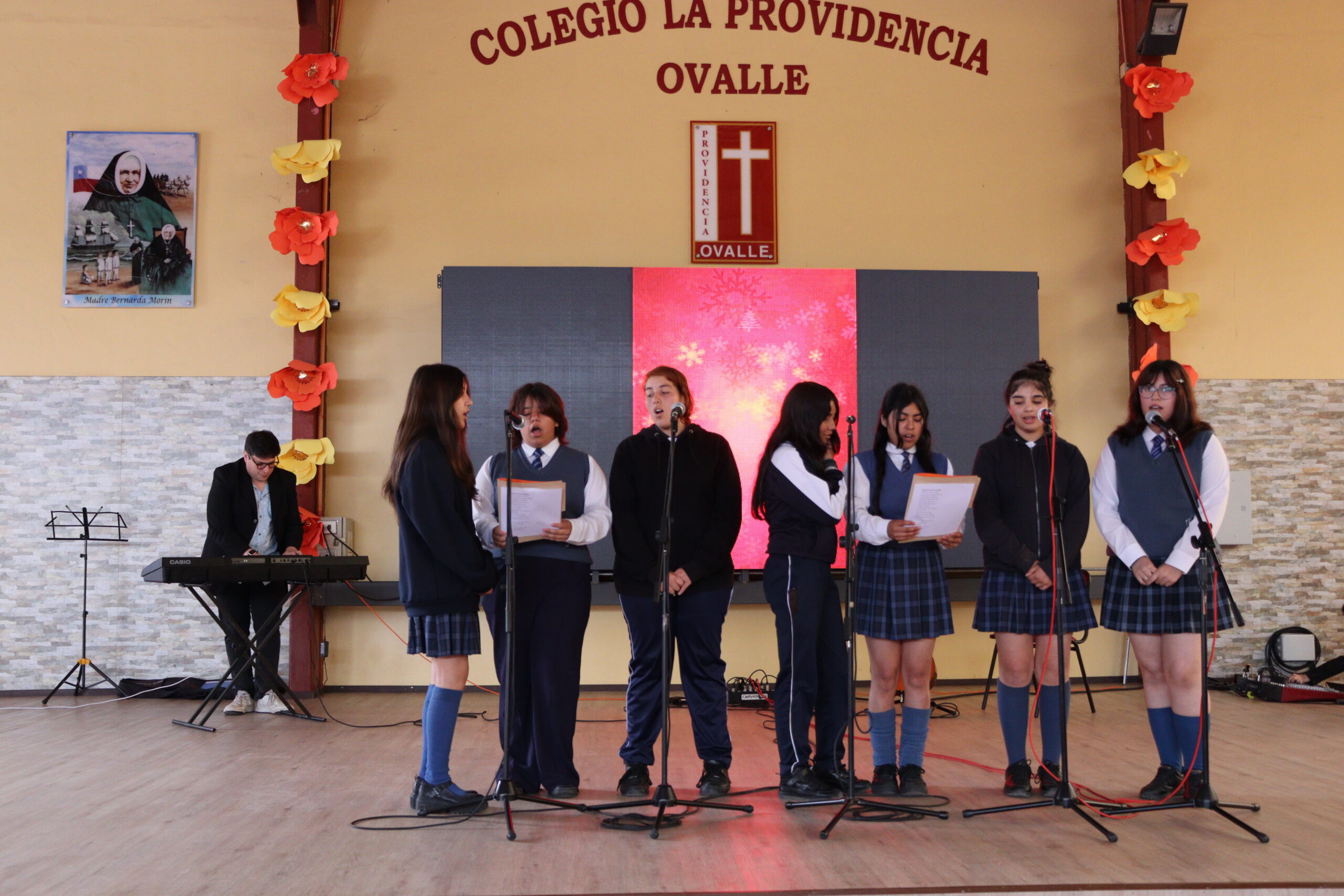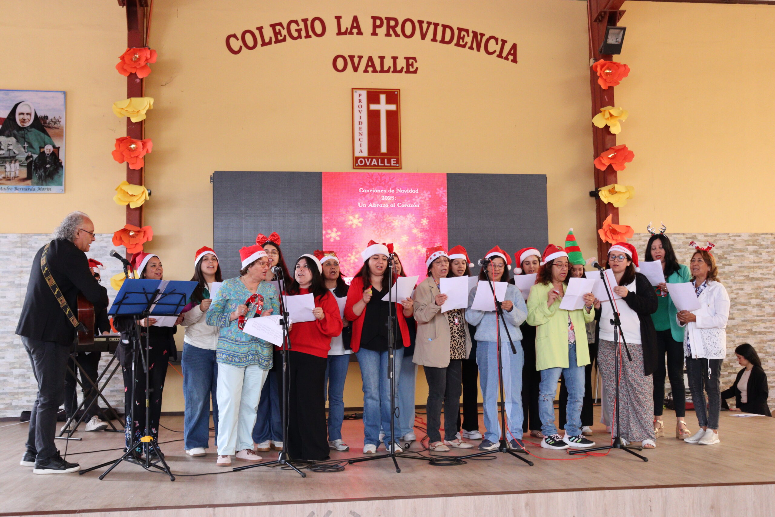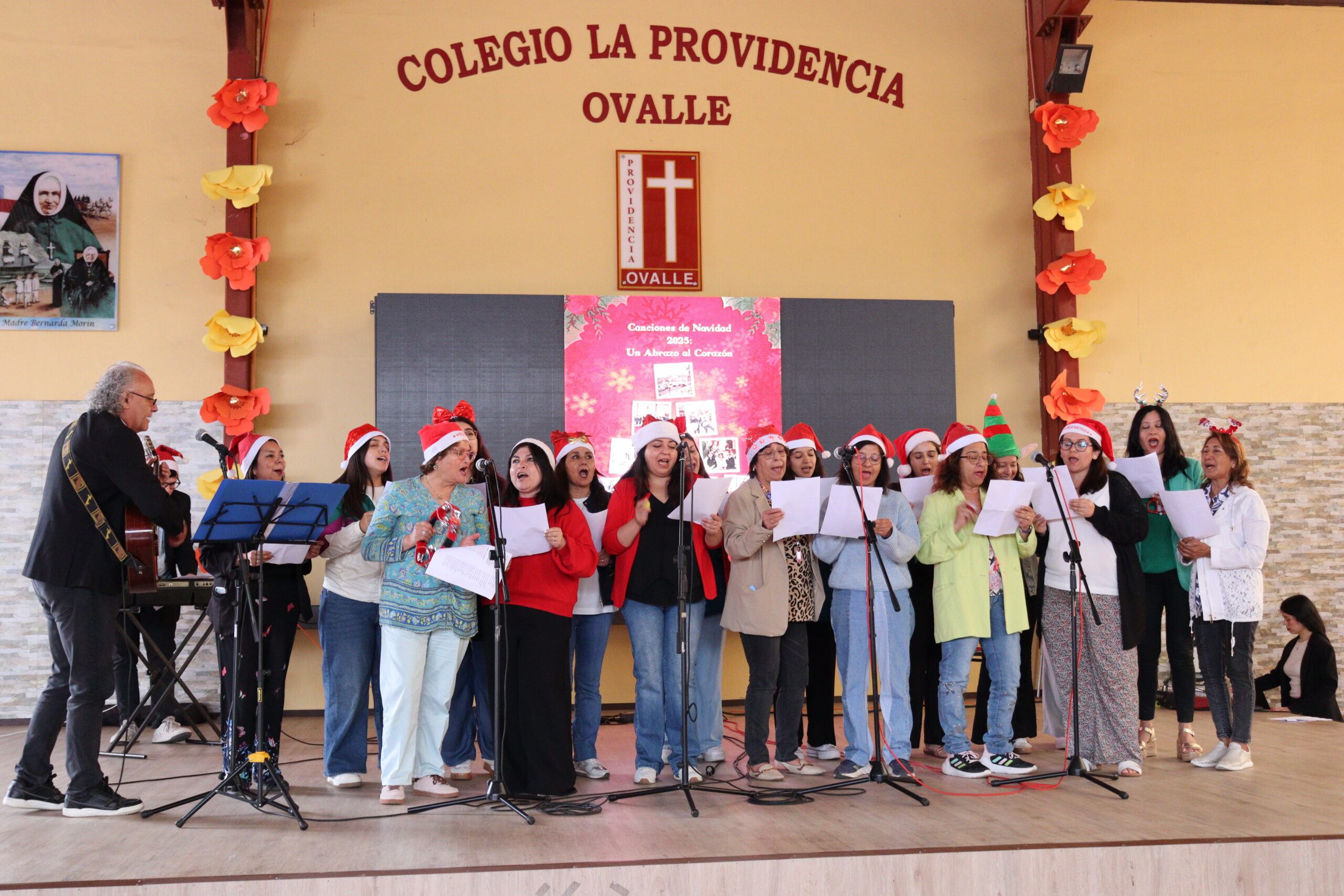 Posteriormente, se dio paso a los villancicos, iniciando con la academia de inglés, seguida por la academia de coro y la academia de banda. La sorpresa la entregó el coro de funcionarios, quienes interpretaron villancicos con alegría y unidad. Finalmente, todos los grupos se unieron para cantar Noche de Paz, mientras la imagen del Niño Jesús era llevada al pesebre y recibida por la Hna. Elvira Letelier, quien la posó en el lugar central.