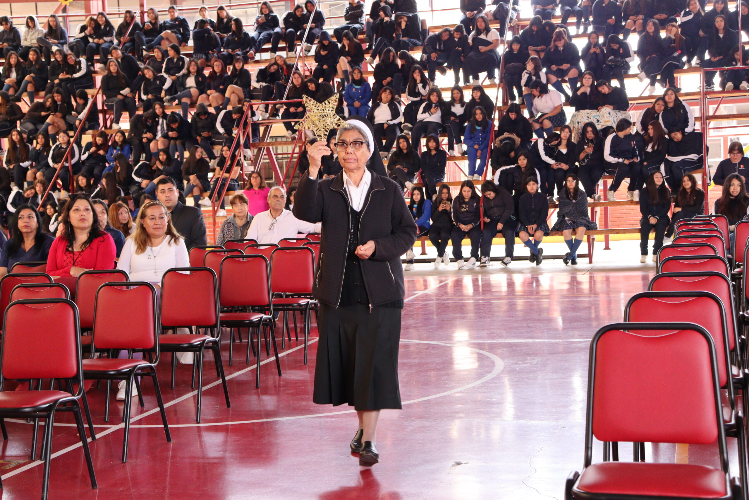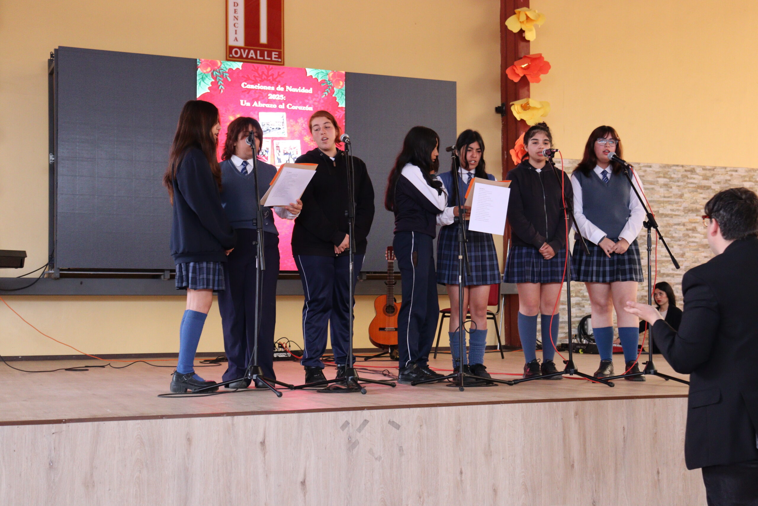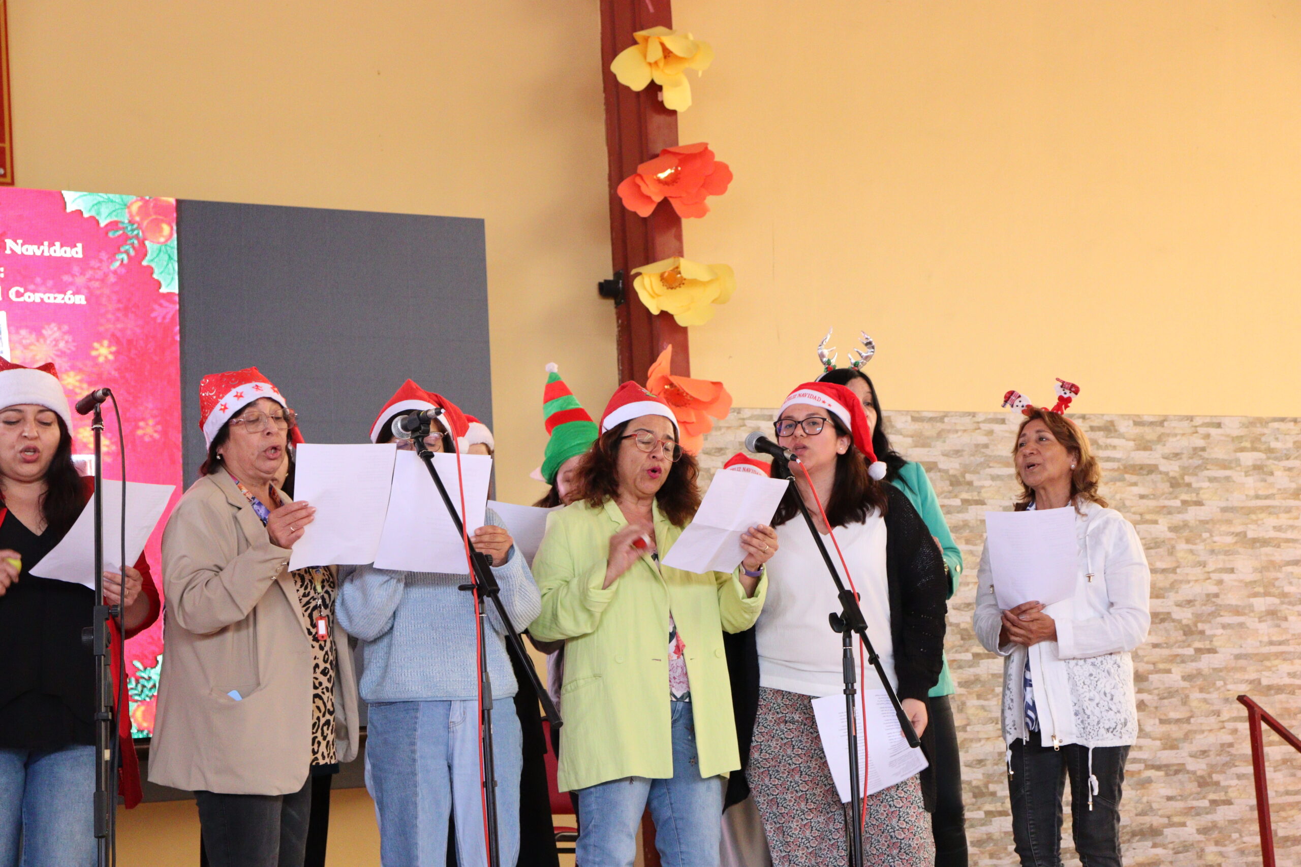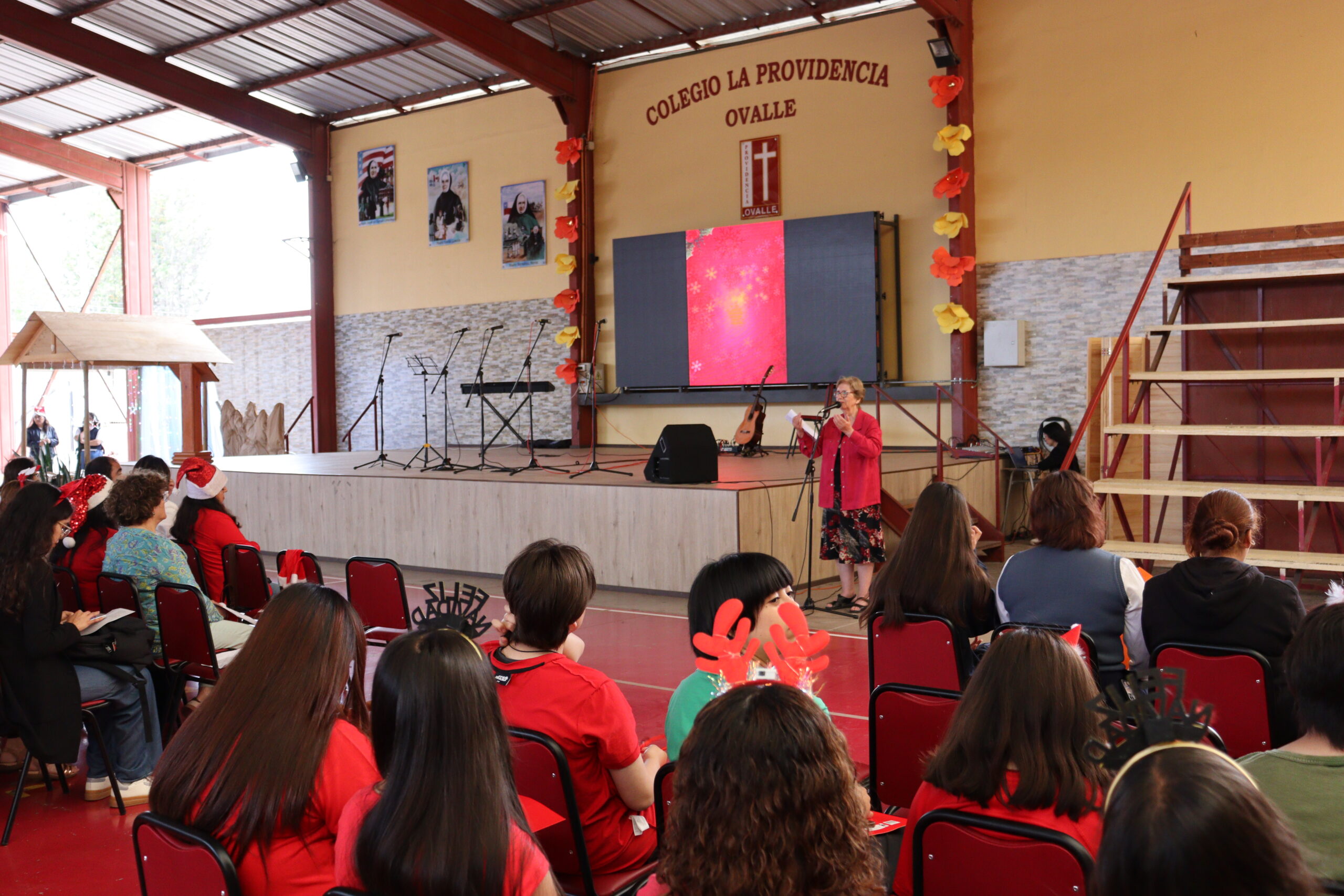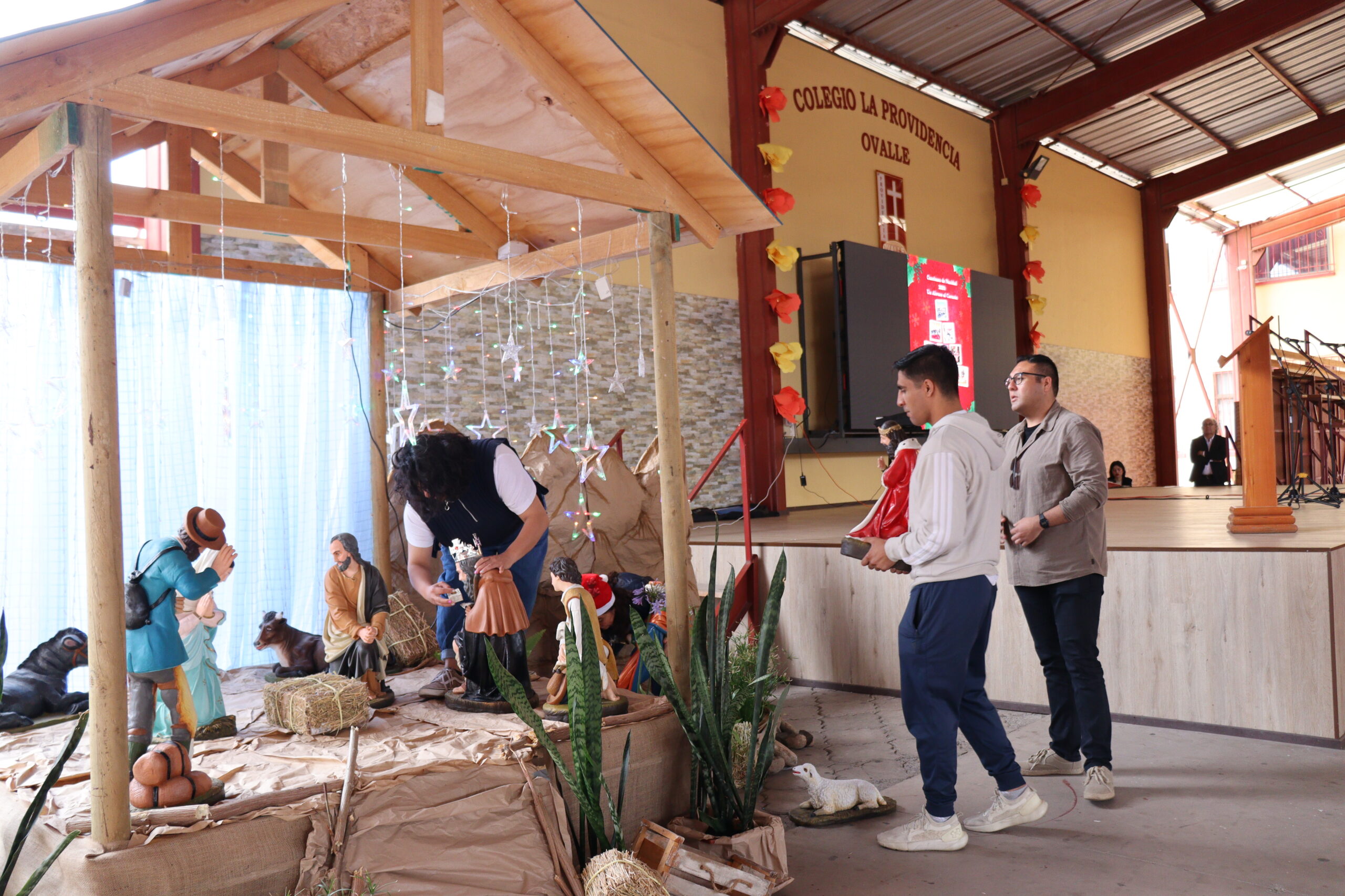 Posteriormente, se dio paso a los villancicos, iniciando con la academia de inglés, seguida por la academia de coro y la academia de banda. La sorpresa la entregó el coro de funcionarios, quienes interpretaron villancicos con alegría y unidad. Finalmente, todos los grupos se unieron para cantar Noche de Paz, mientras la imagen del Niño Jesús era llevada al pesebre y recibida por la Hna. Elvira Letelier, quien la posó en el lugar central.