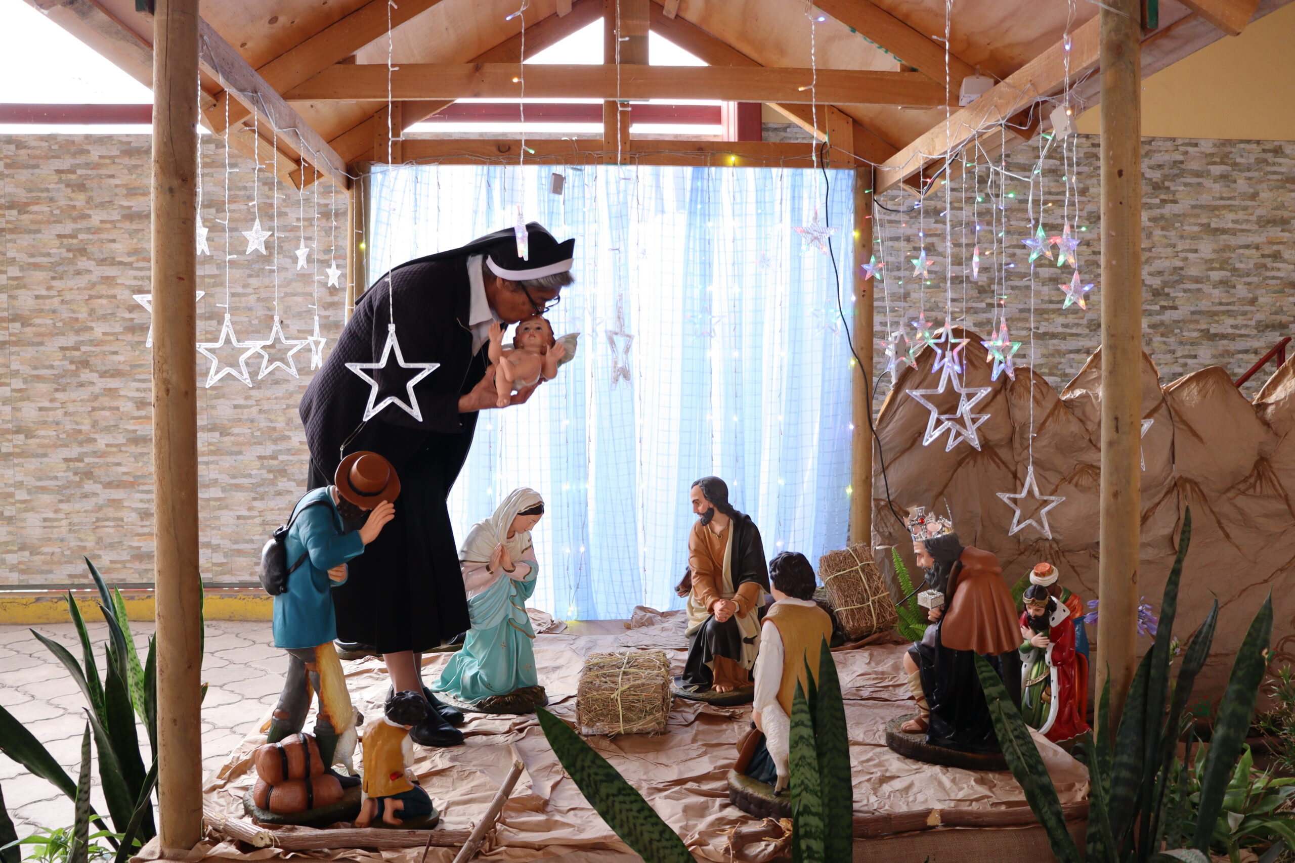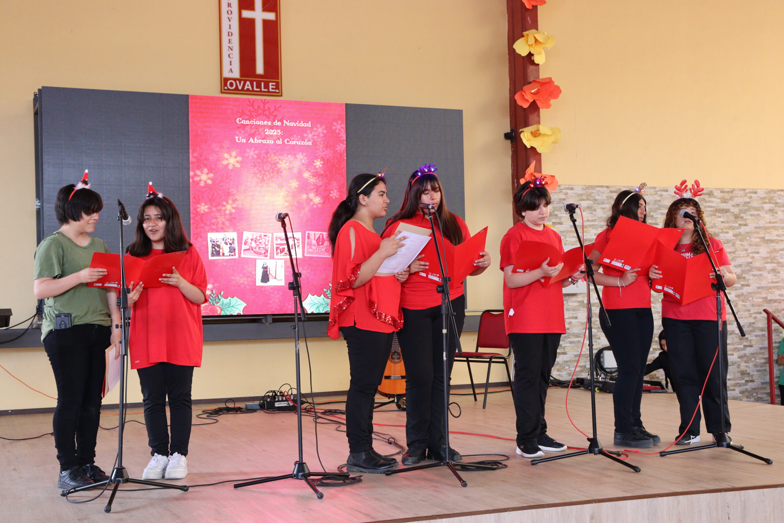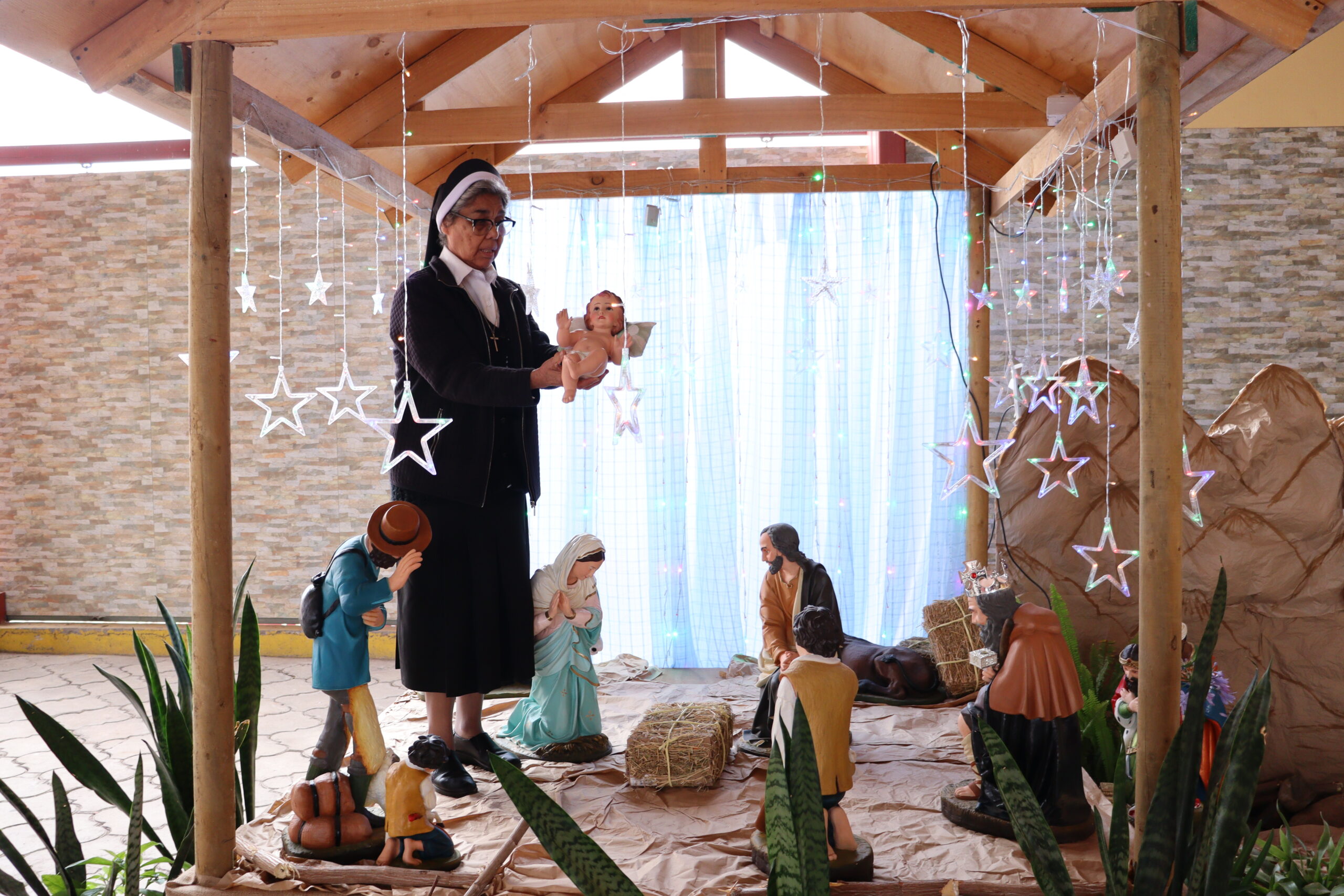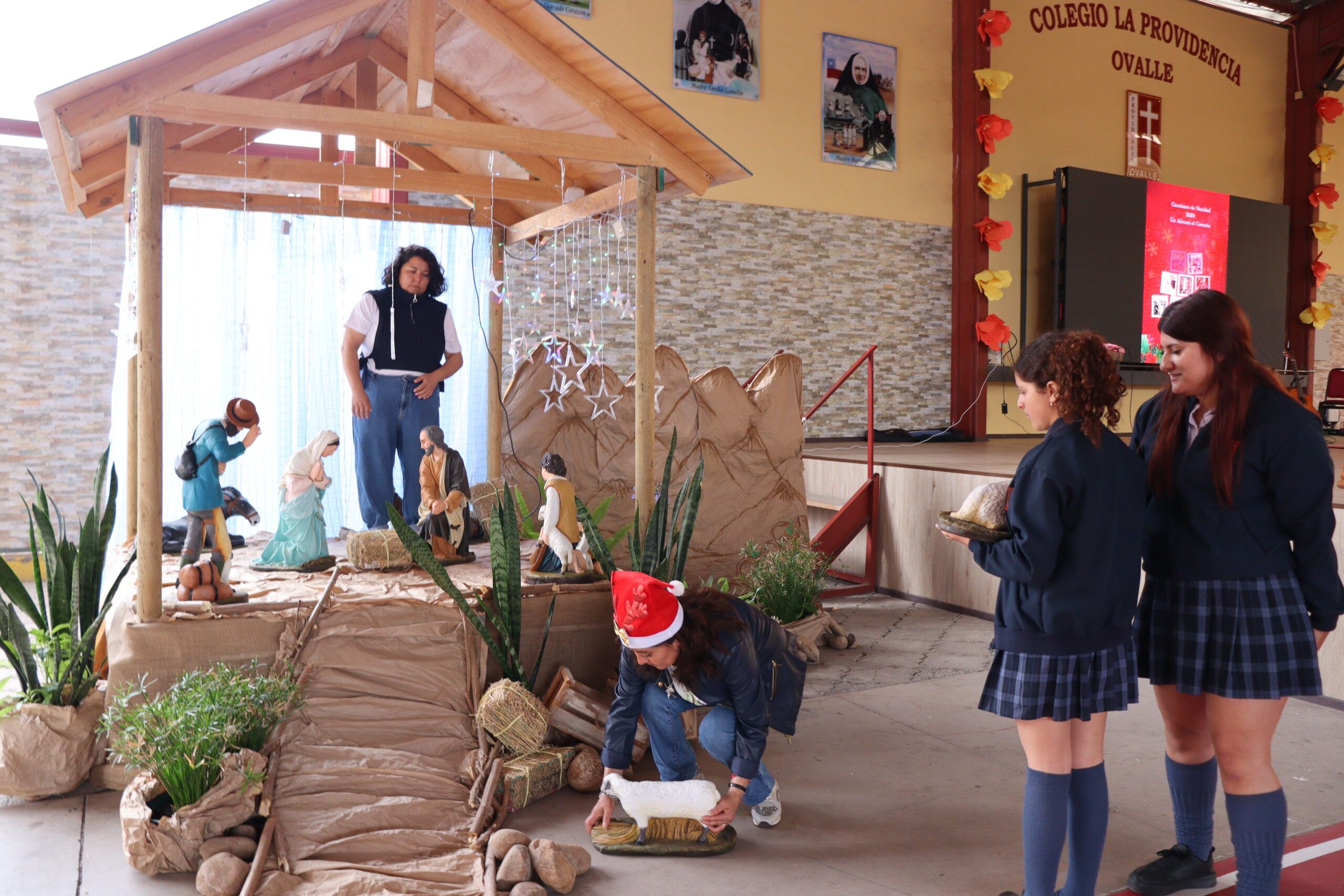 Posteriormente, se dio paso a los villancicos, iniciando con la academia de inglés, seguida por la academia de coro y la academia de banda. La sorpresa la entregó el coro de funcionarios, quienes interpretaron villancicos con alegría y unidad. Finalmente, todos los grupos se unieron para cantar Noche de Paz, mientras la imagen del Niño Jesús era llevada al pesebre y recibida por la Hna. Elvira Letelier, quien la posó en el lugar central.