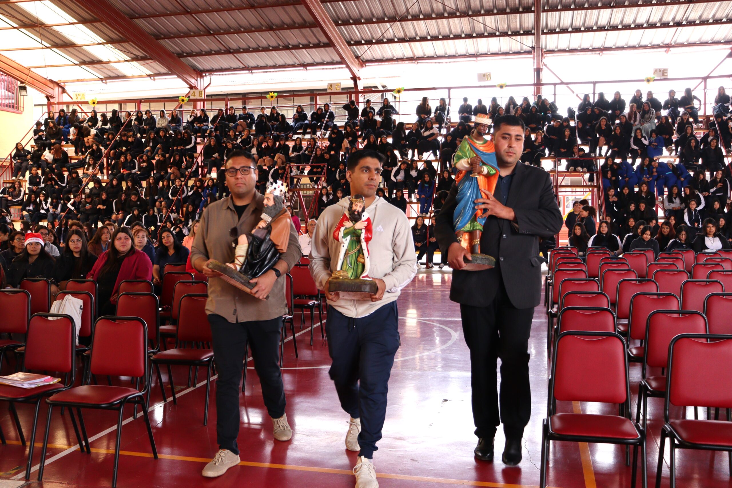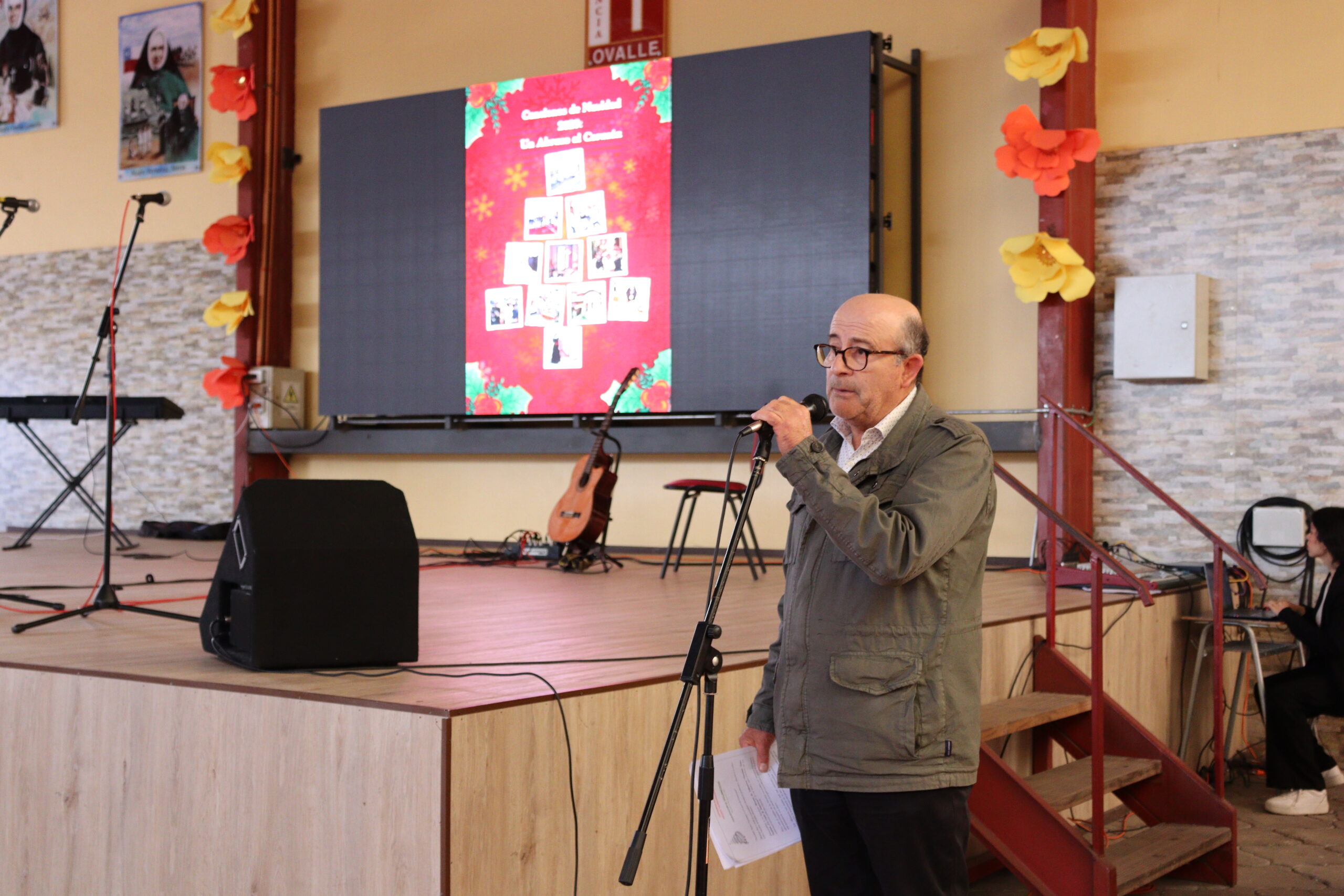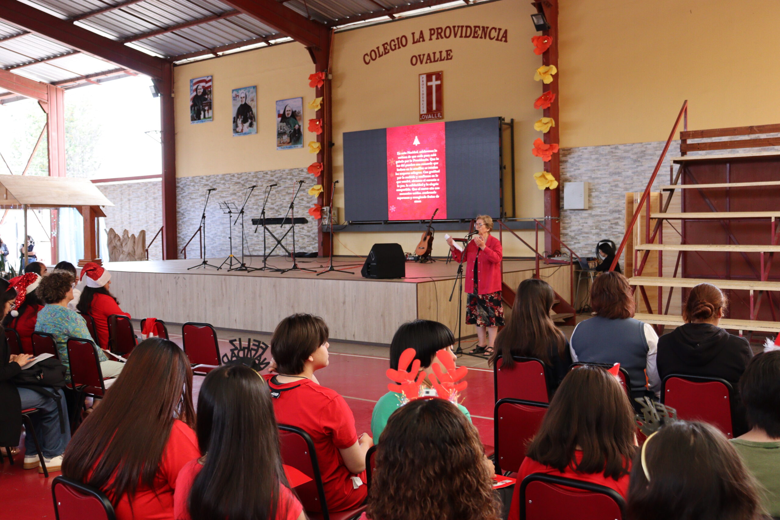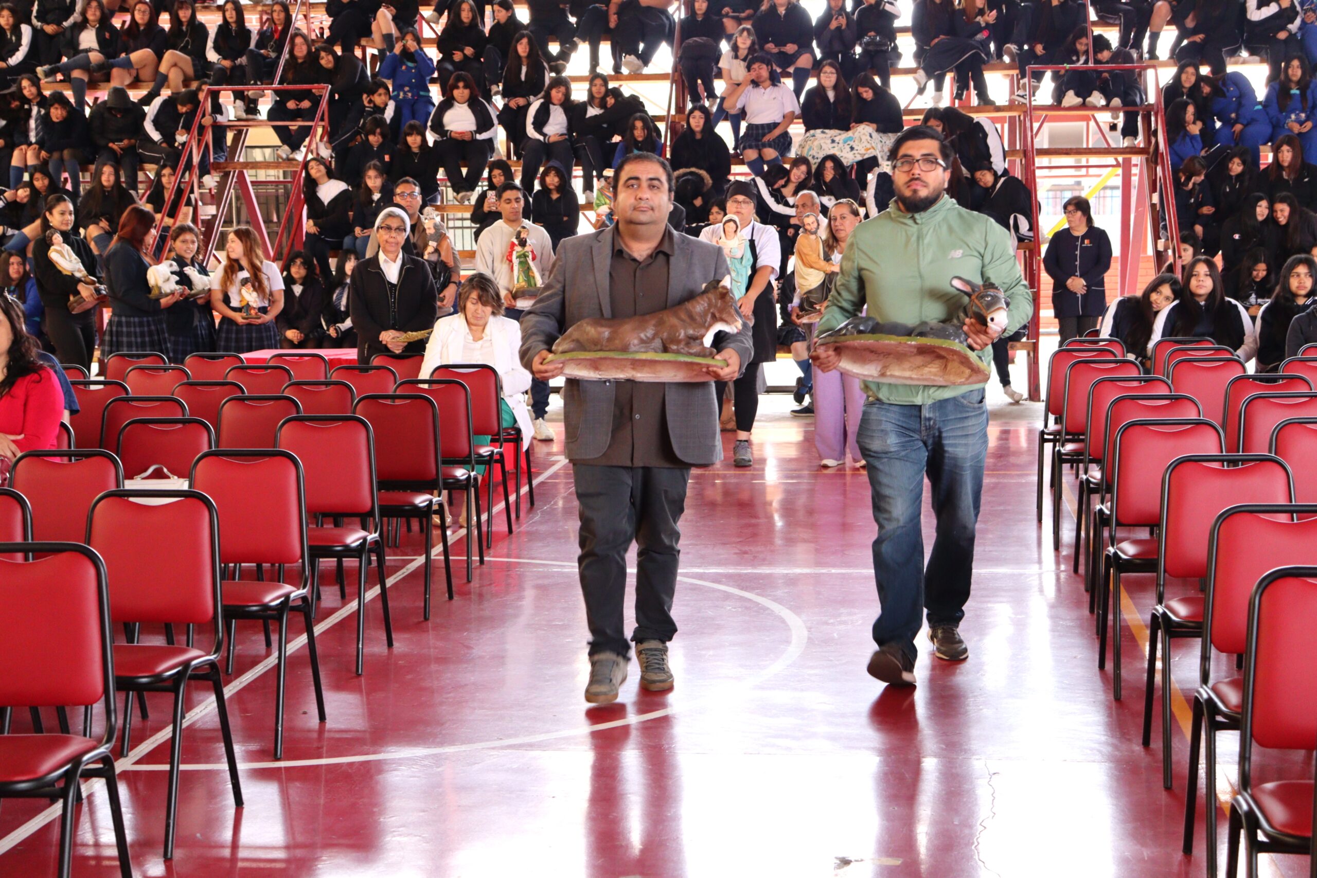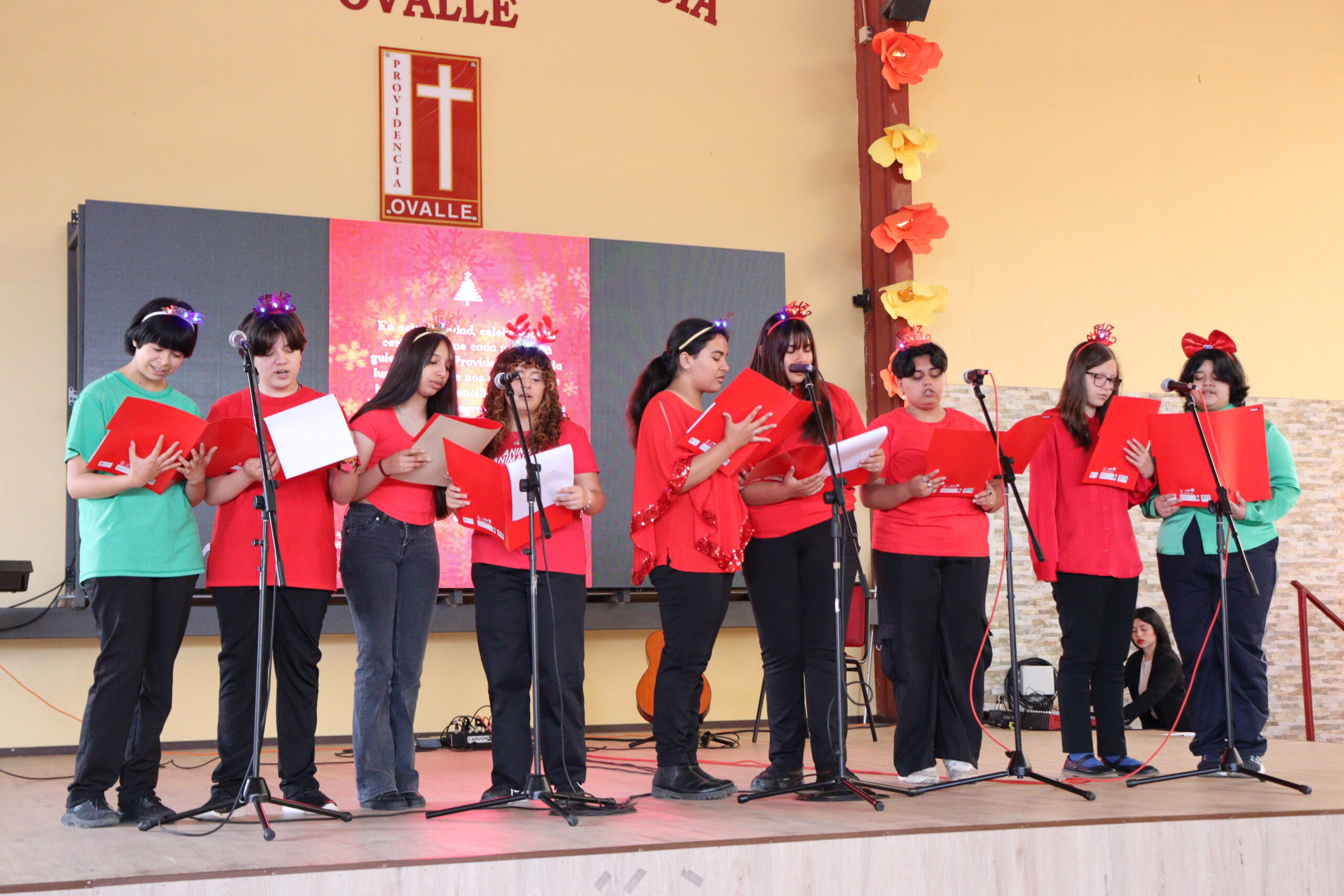 Posteriormente, se dio paso a los villancicos, iniciando con la academia de inglés, seguida por la academia de coro y la academia de banda. La sorpresa la entregó el coro de funcionarios, quienes interpretaron villancicos con alegría y unidad. Finalmente, todos los grupos se unieron para cantar Noche de Paz, mientras la imagen del Niño Jesús era llevada al pesebre y recibida por la Hna. Elvira Letelier, quien la posó en el lugar central.