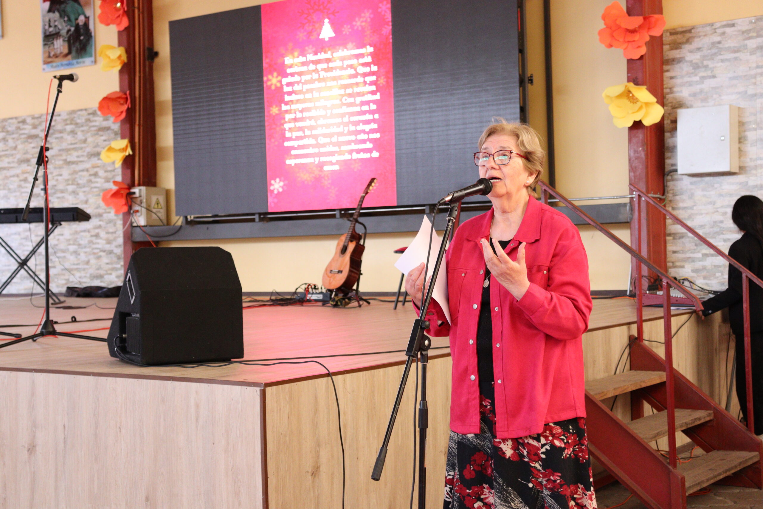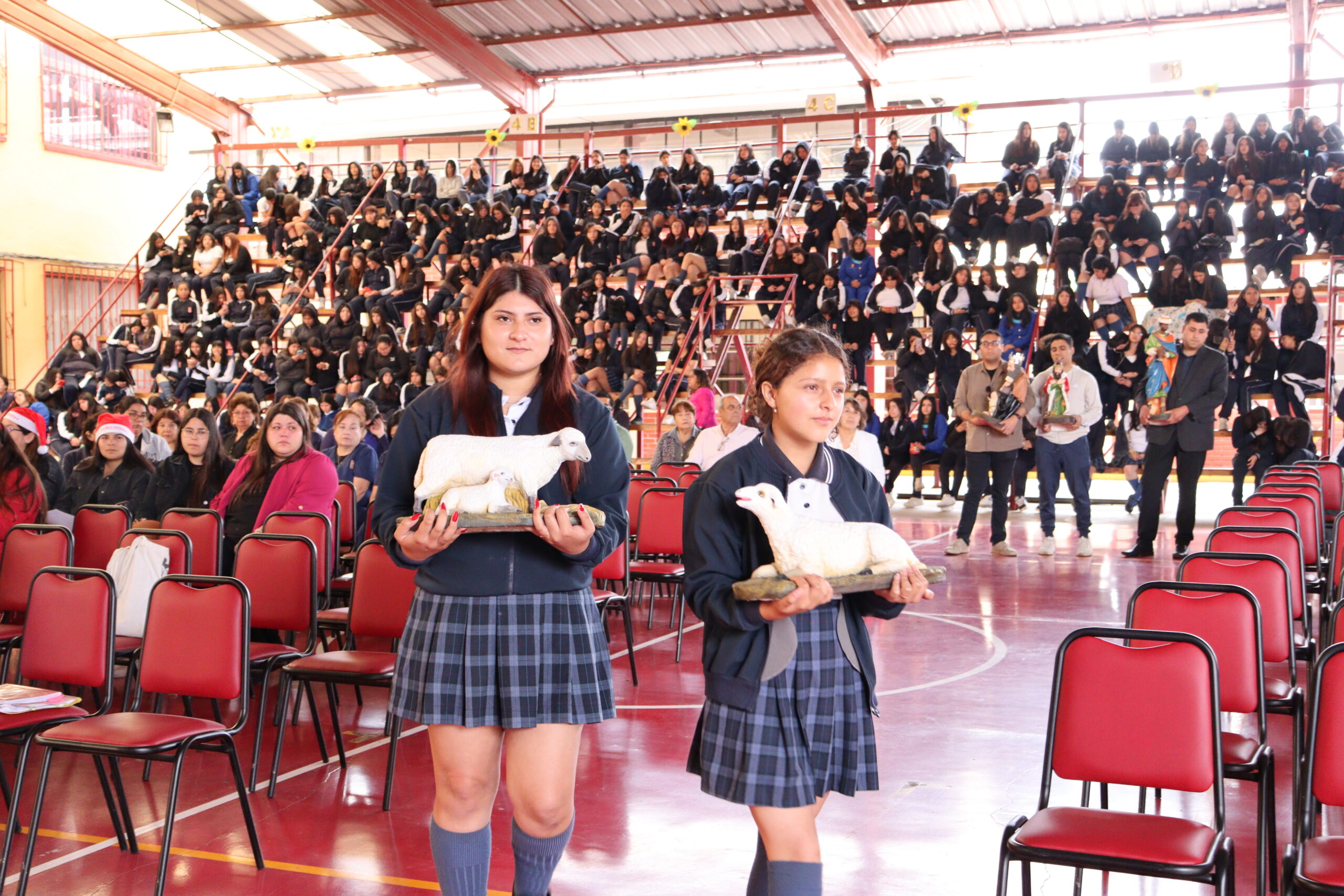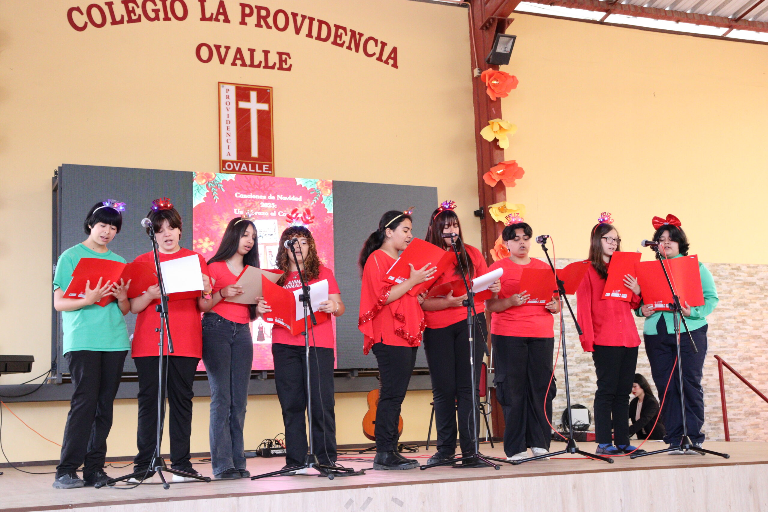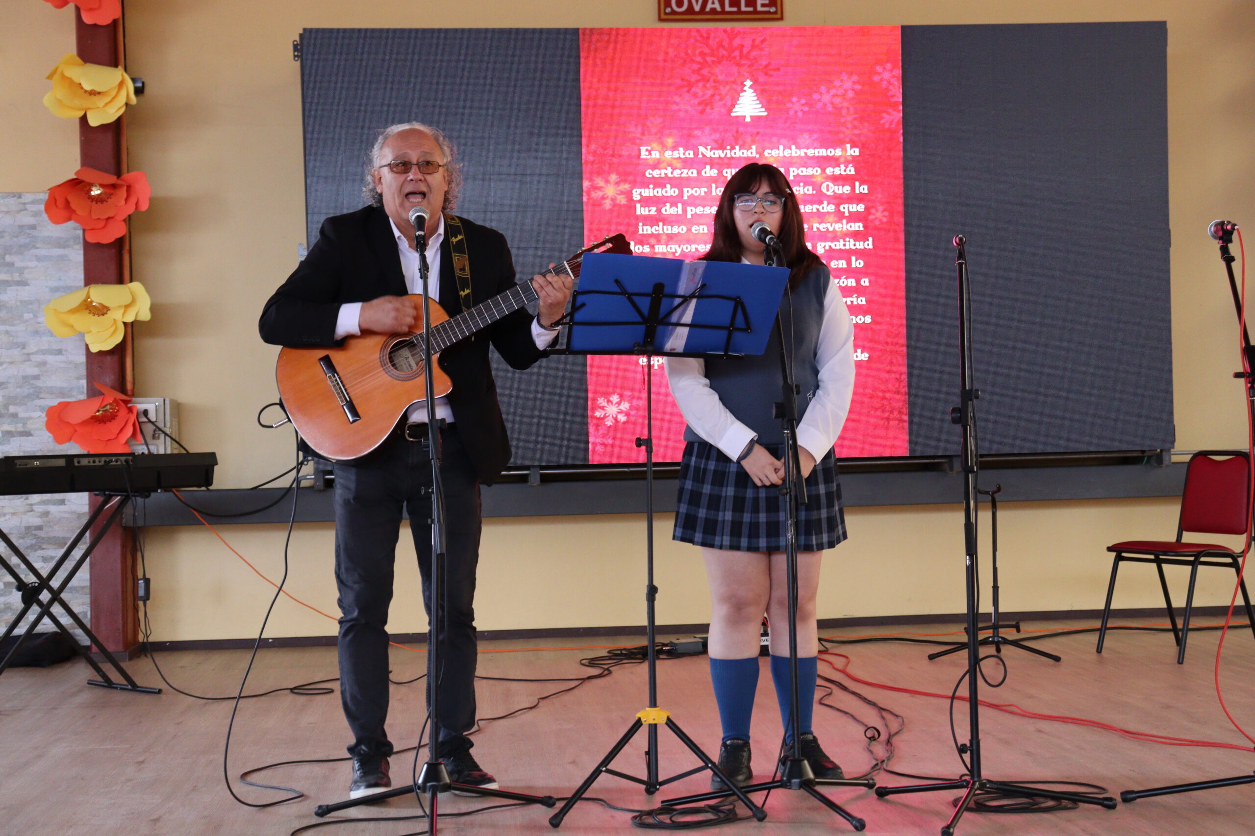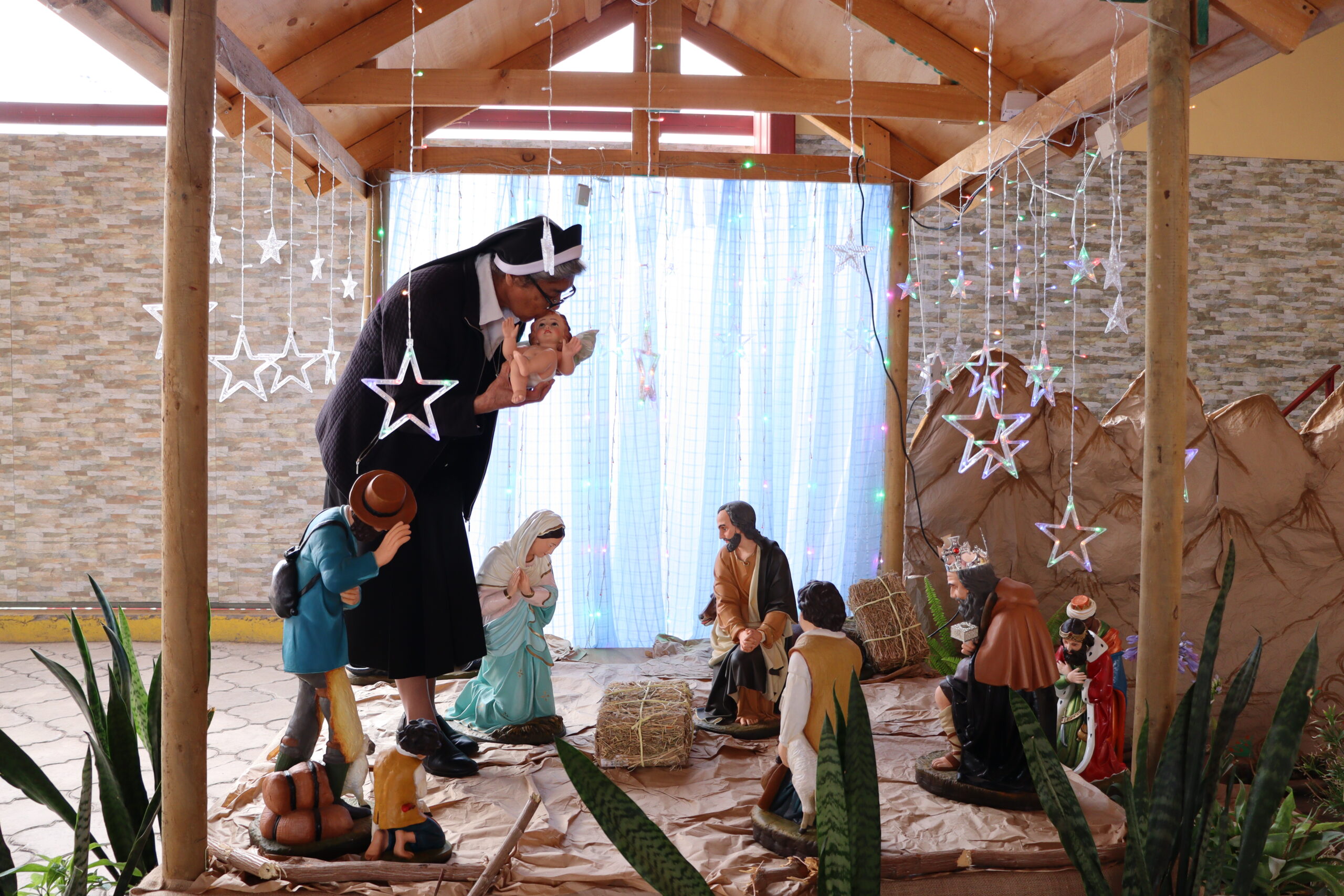 Posteriormente, se dio paso a los villancicos, iniciando con la academia de inglés, seguida por la academia de coro y la academia de banda. La sorpresa la entregó el coro de funcionarios, quienes interpretaron villancicos con alegría y unidad. Finalmente, todos los grupos se unieron para cantar Noche de Paz, mientras la imagen del Niño Jesús era llevada al pesebre y recibida por la Hna. Elvira Letelier, quien la posó en el lugar central.