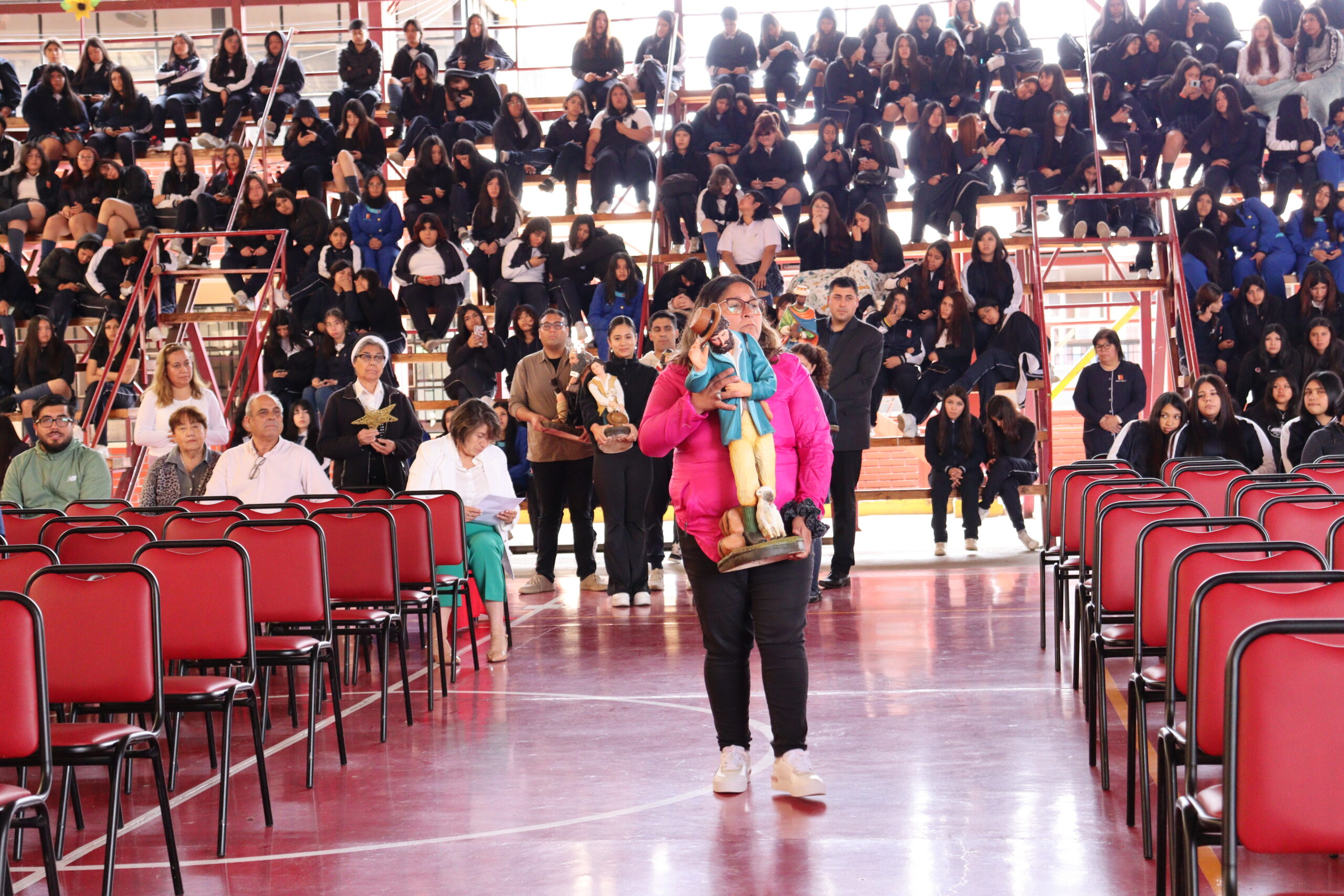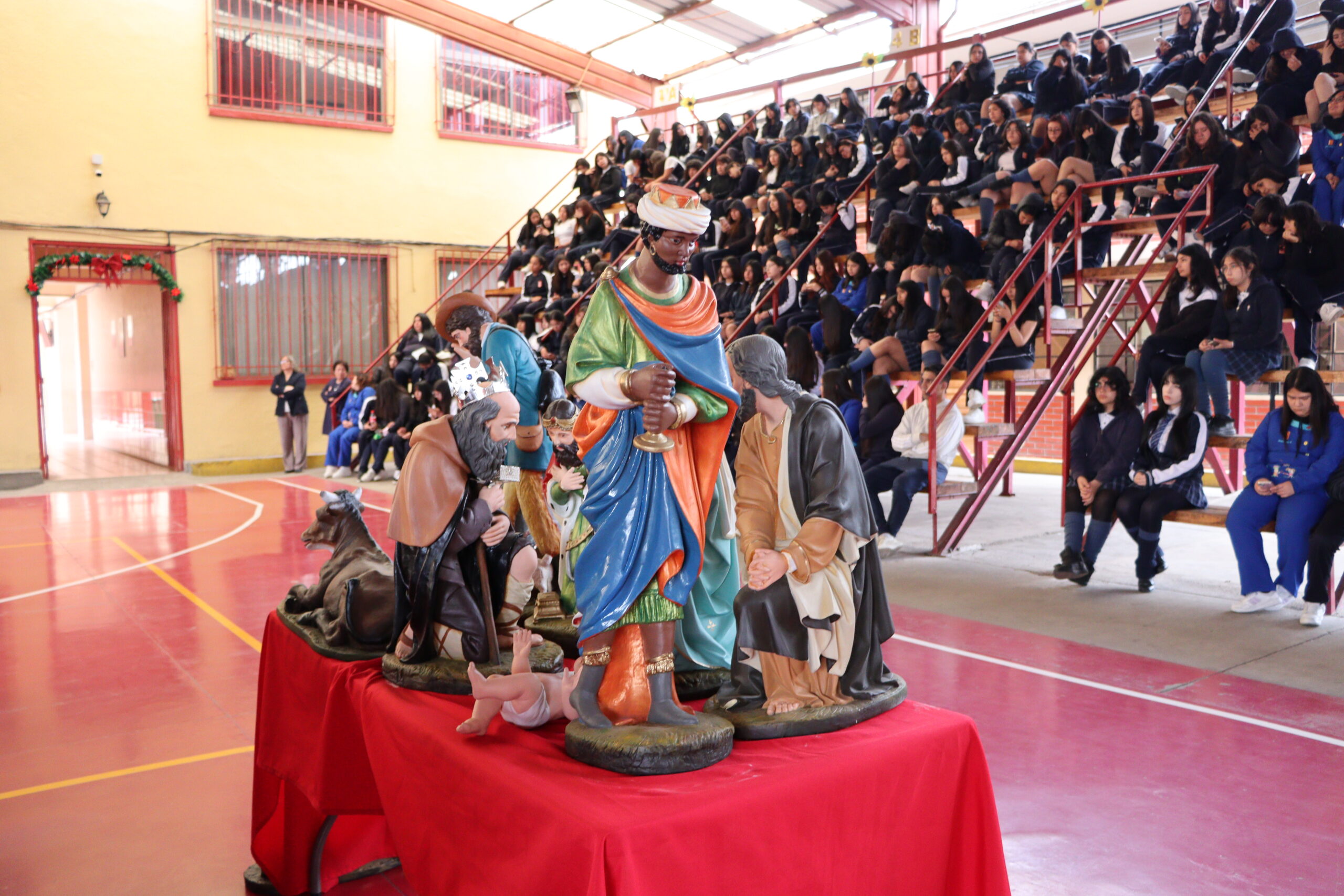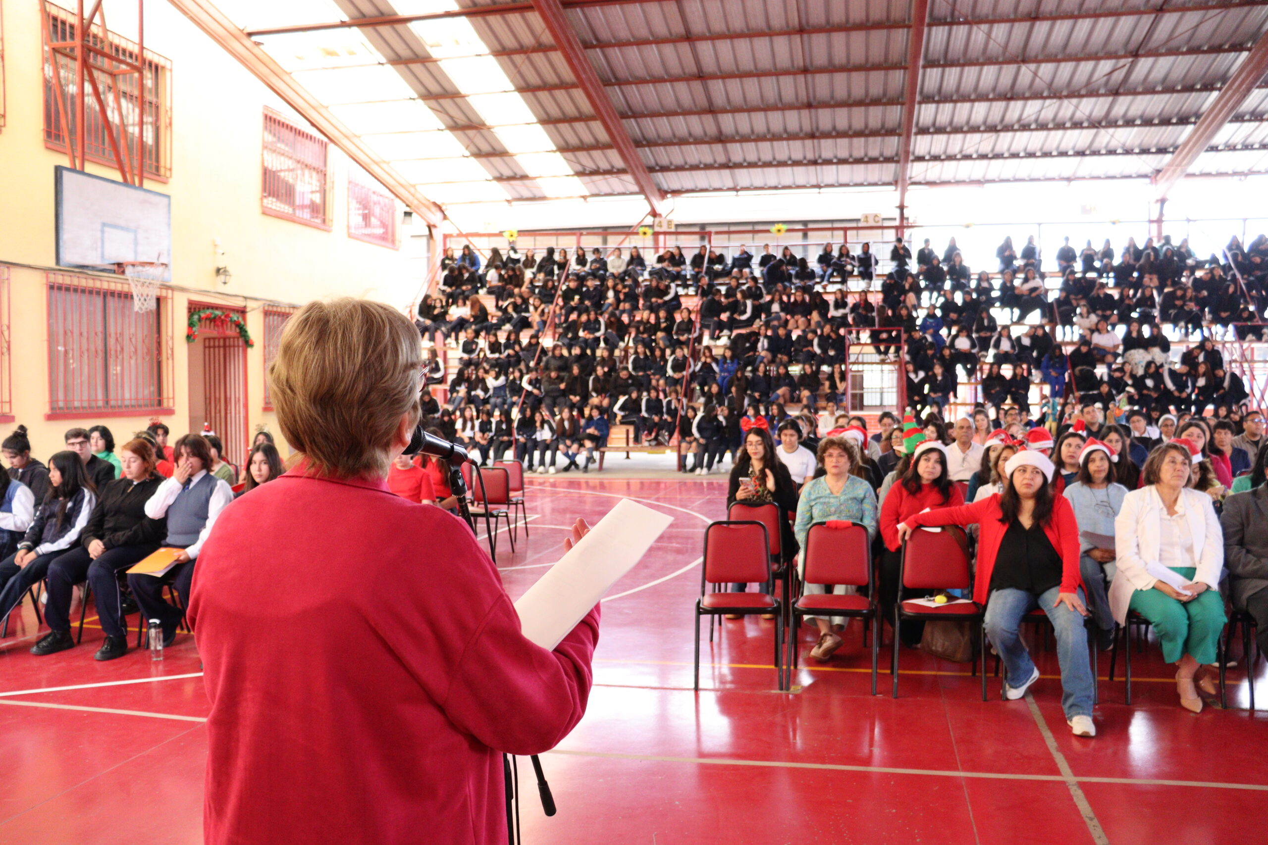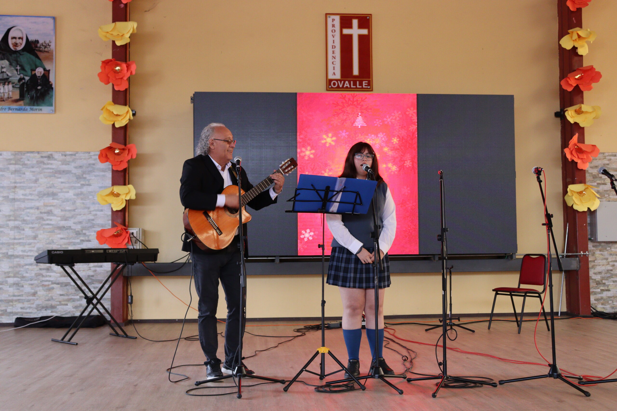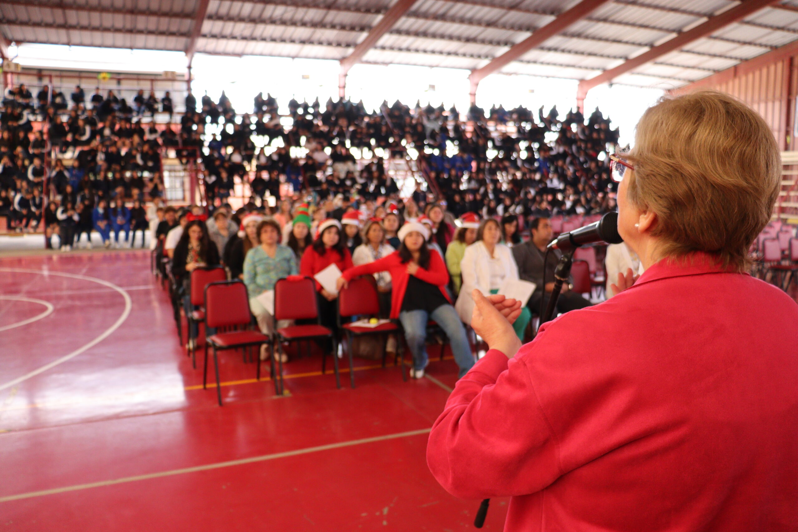 Posteriormente, se dio paso a los villancicos, iniciando con la academia de inglés, seguida por la academia de coro y la academia de banda. La sorpresa la entregó el coro de funcionarios, quienes interpretaron villancicos con alegría y unidad. Finalmente, todos los grupos se unieron para cantar Noche de Paz, mientras la imagen del Niño Jesús era llevada al pesebre y recibida por la Hna. Elvira Letelier, quien la posó en el lugar central.