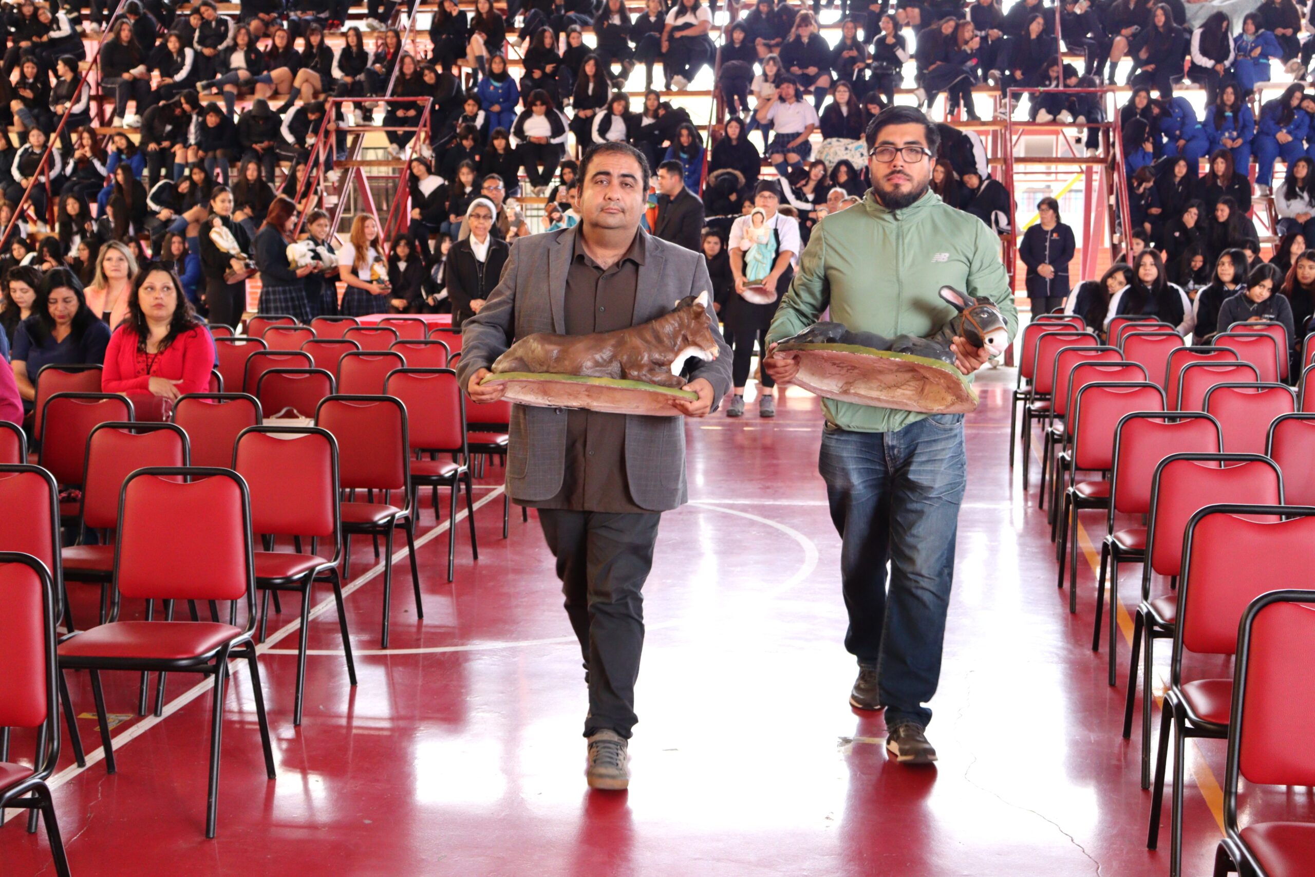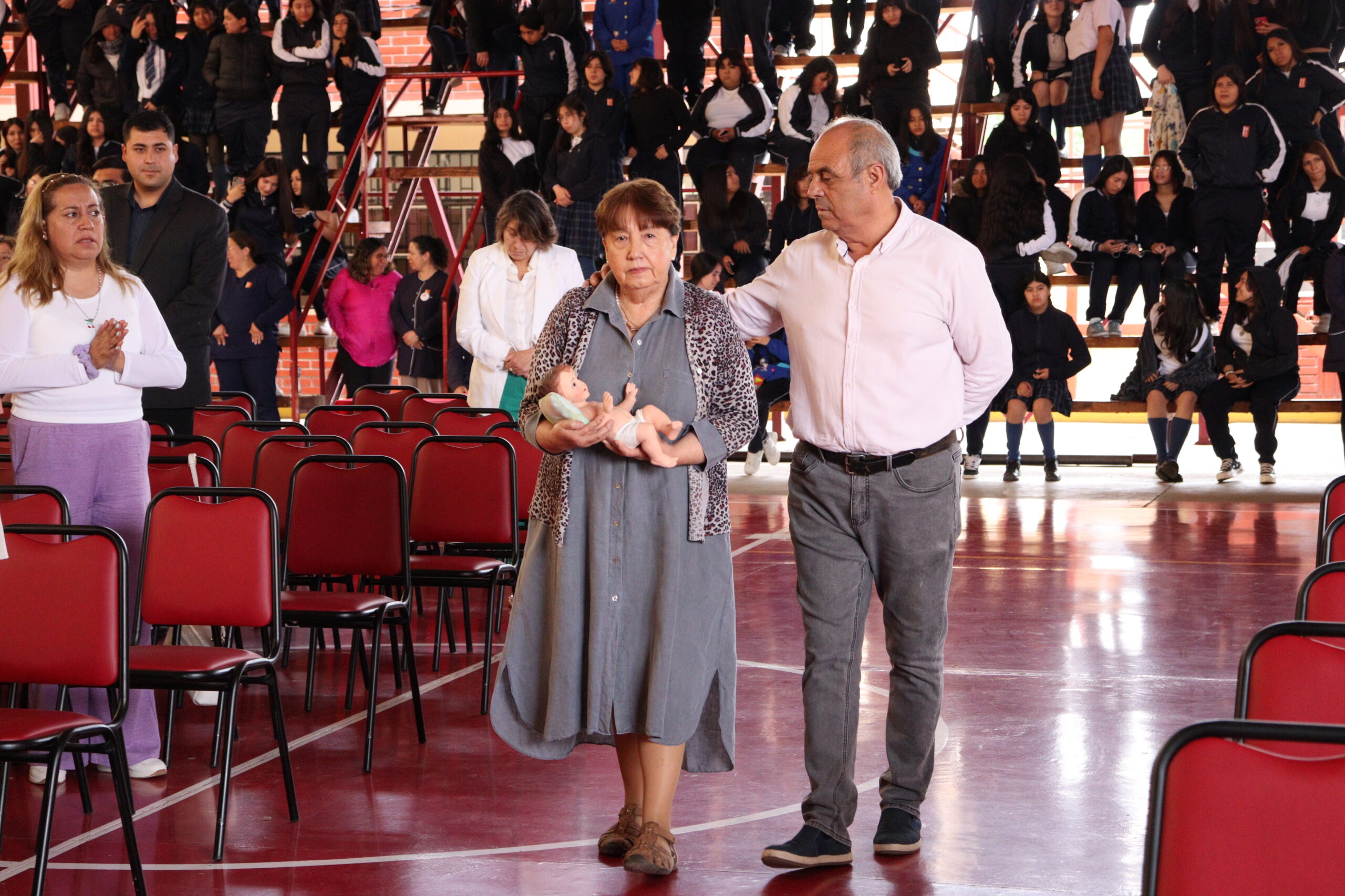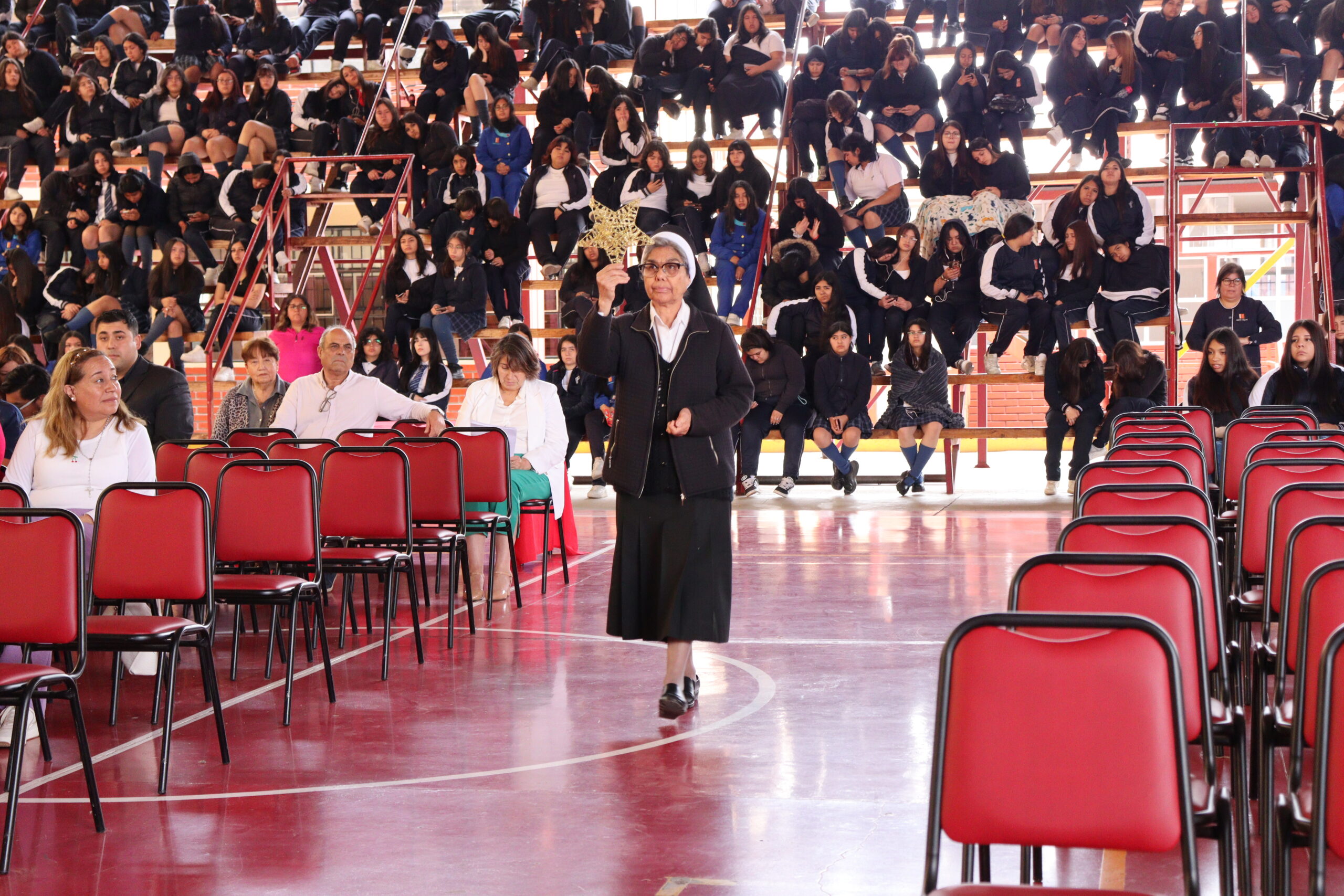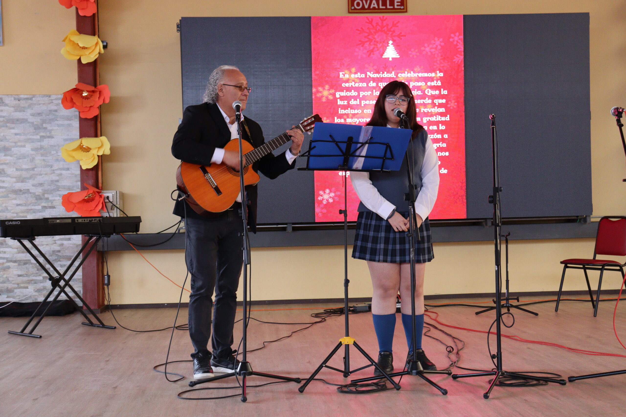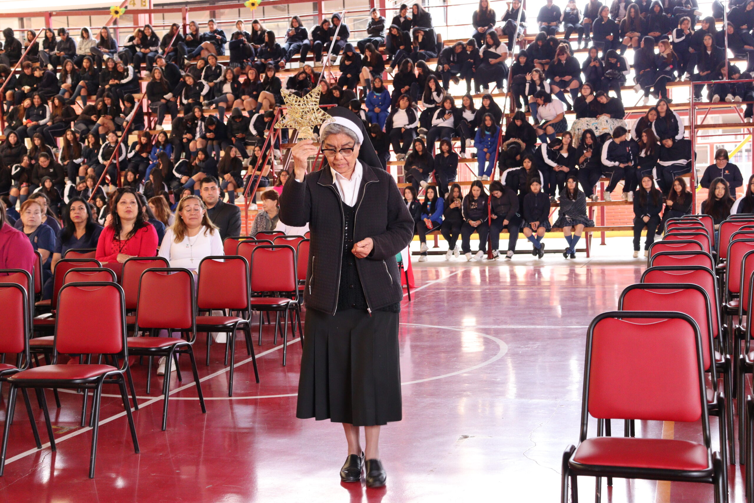 Posteriormente, se dio paso a los villancicos, iniciando con la academia de inglés, seguida por la academia de coro y la academia de banda. La sorpresa la entregó el coro de funcionarios, quienes interpretaron villancicos con alegría y unidad. Finalmente, todos los grupos se unieron para cantar Noche de Paz, mientras la imagen del Niño Jesús era llevada al pesebre y recibida por la Hna. Elvira Letelier, quien la posó en el lugar central.