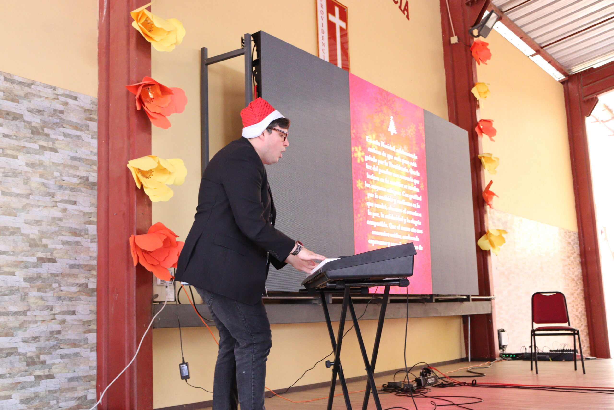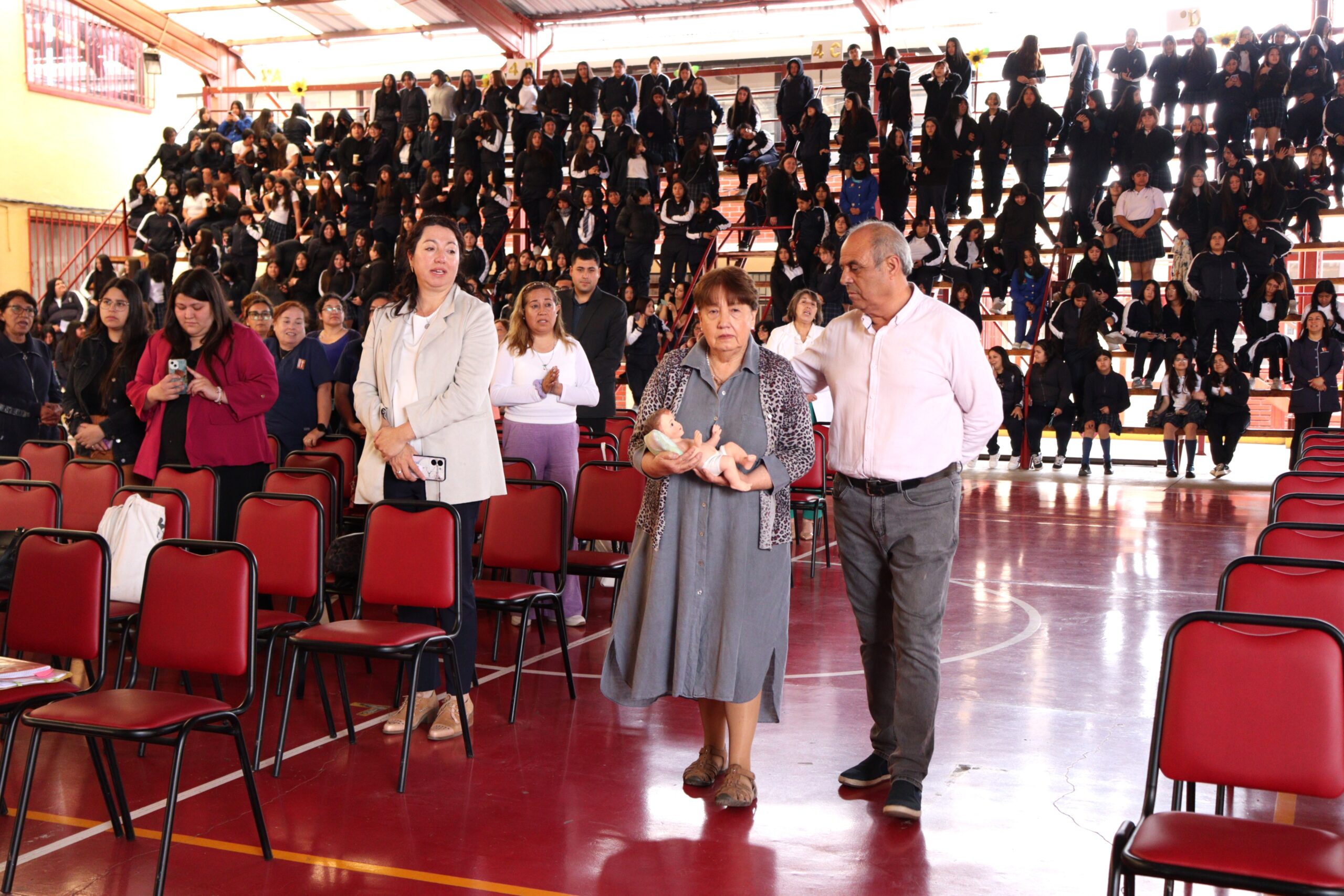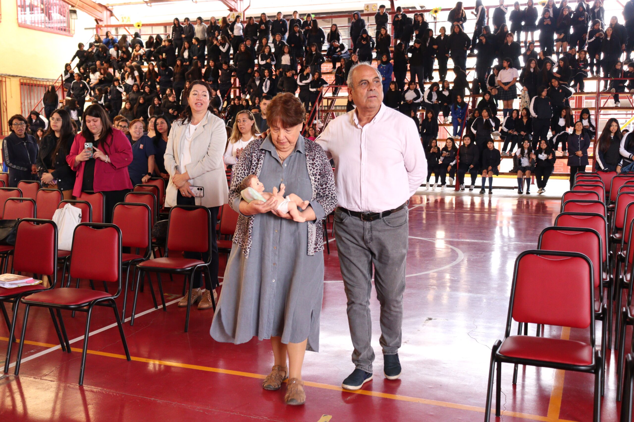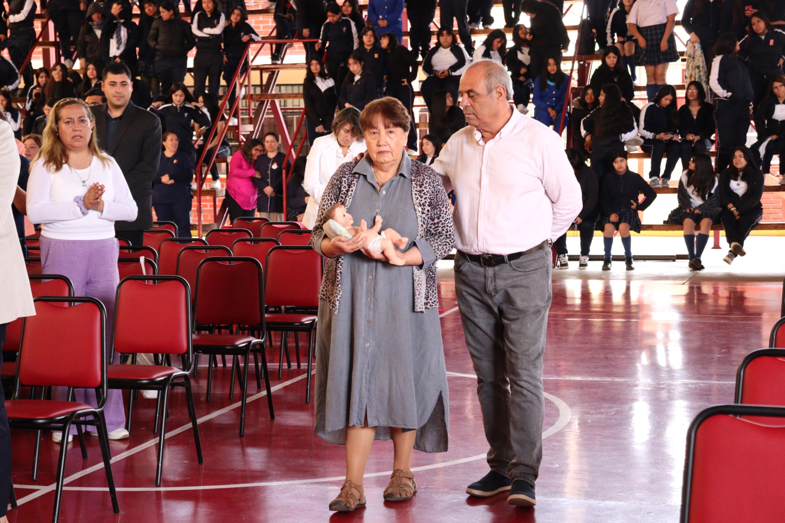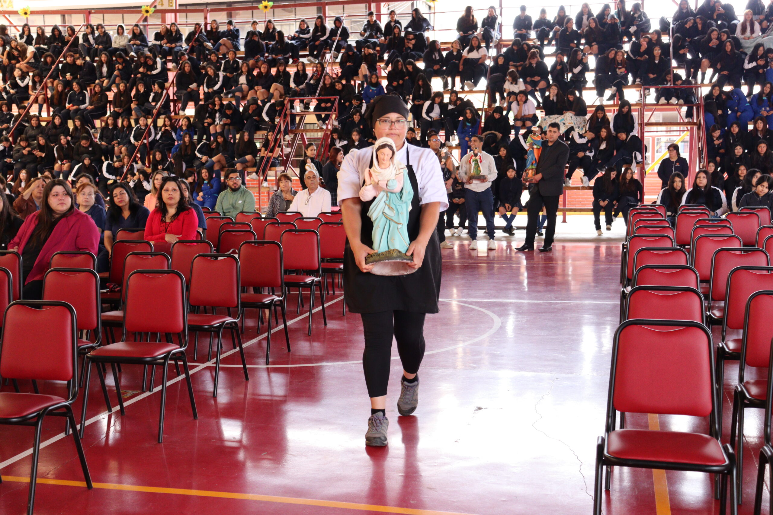 Posteriormente, se dio paso a los villancicos, iniciando con la academia de inglés, seguida por la academia de coro y la academia de banda. La sorpresa la entregó el coro de funcionarios, quienes interpretaron villancicos con alegría y unidad. Finalmente, todos los grupos se unieron para cantar Noche de Paz, mientras la imagen del Niño Jesús era llevada al pesebre y recibida por la Hna. Elvira Letelier, quien la posó en el lugar central.