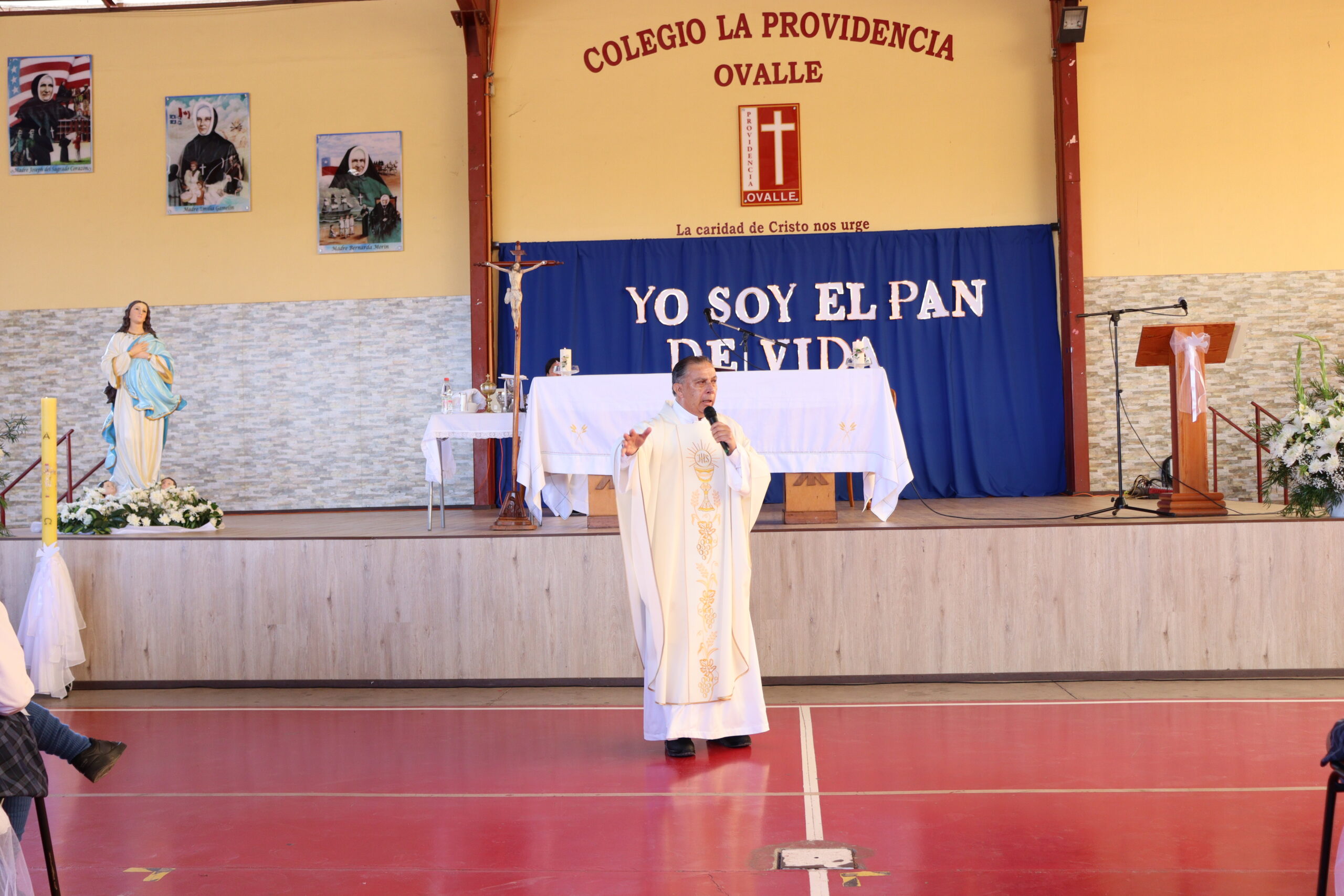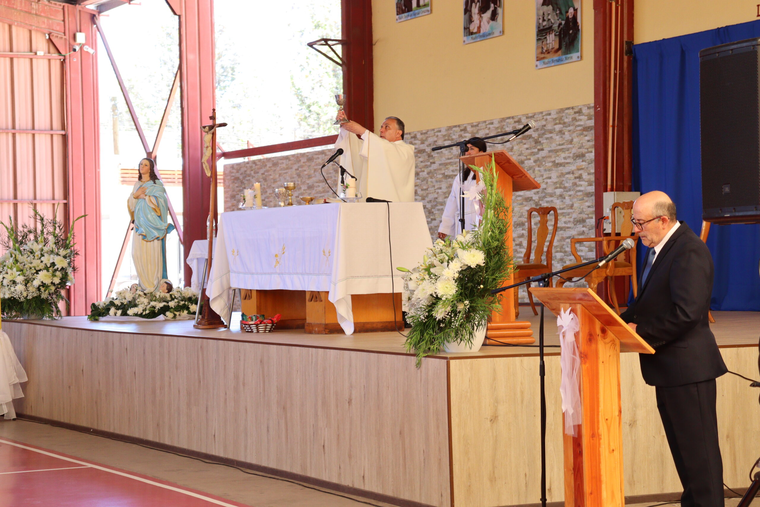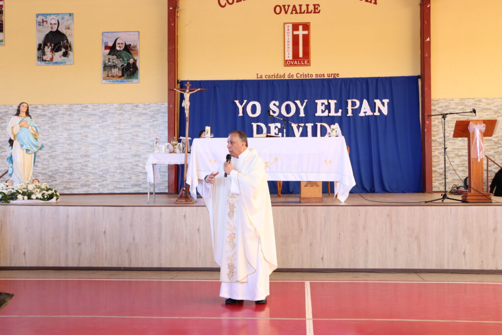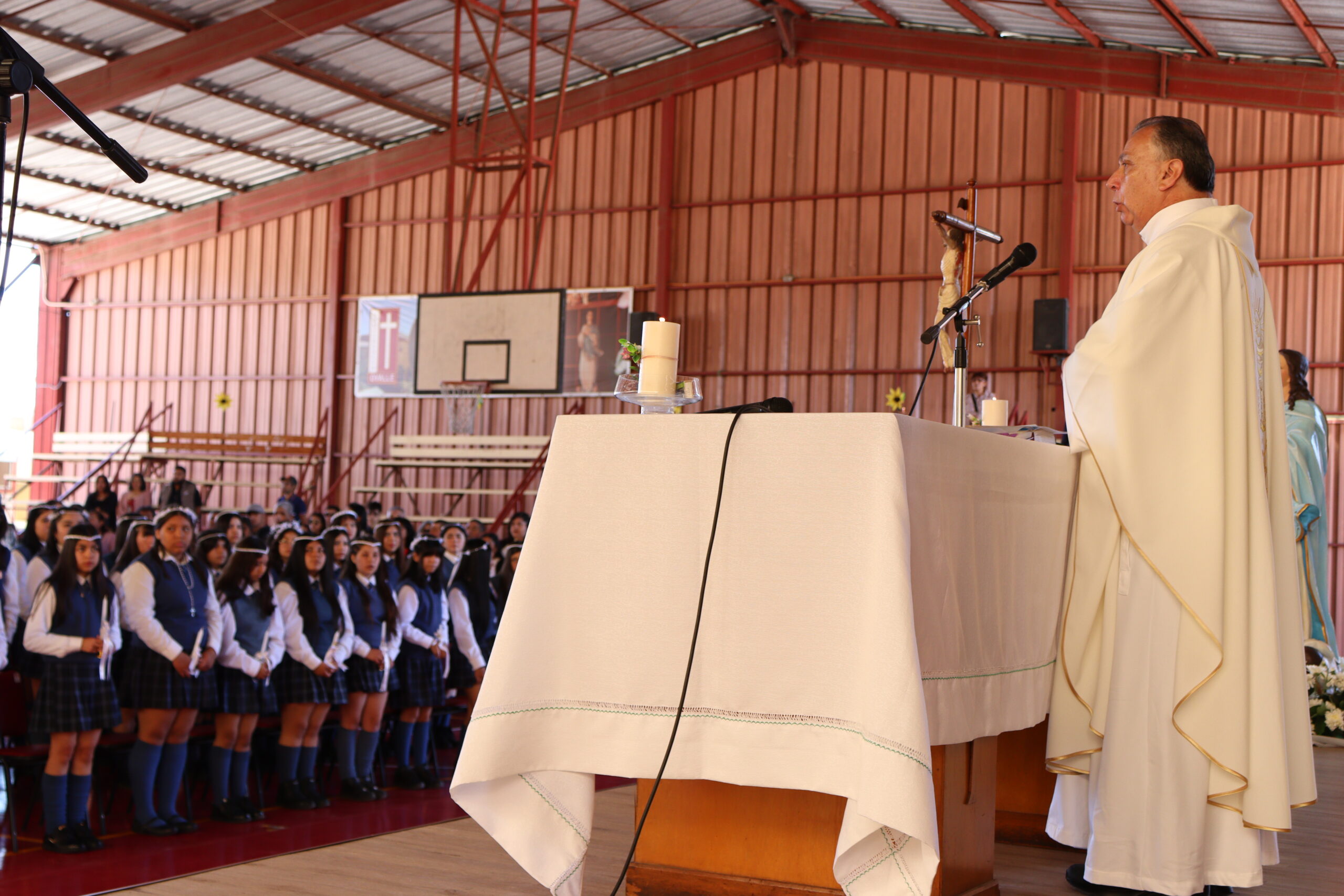 La eucaristía fue presidida por el Padre Jorge Arancibia Mancilla, con la conducción del docente Adrián Varas, y se celebró al mediodía en el techado del colegio, en un ambiente de recogimiento, alegría y fe compartida.
