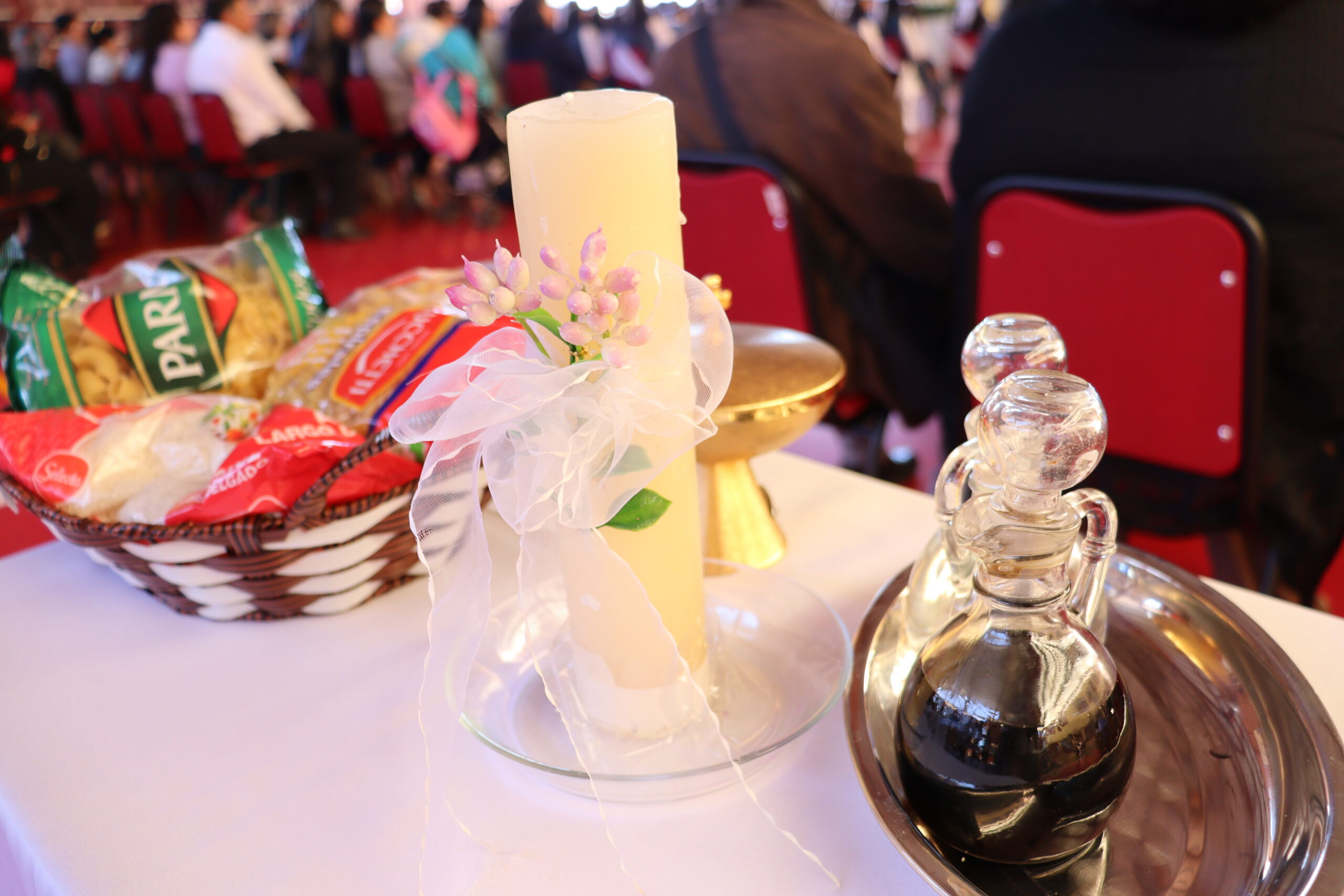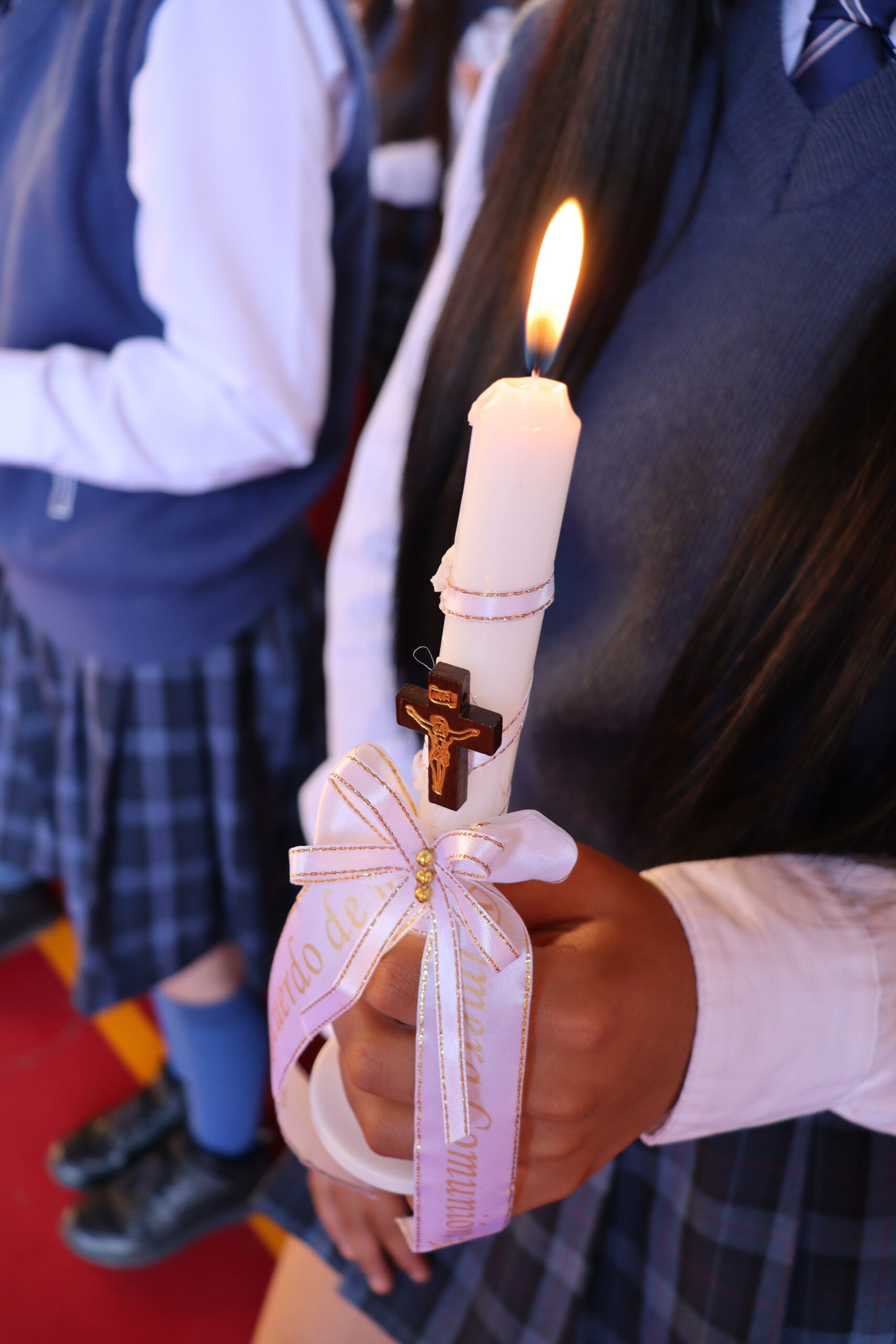 Durante la misa, las catequistas Oriana Rivera y Elizabeth Cancino encendieron sus velas desde el Cirio Pascual, compartiendo esa luz con cada estudiante, quien renovó sus promesas bautismales con emoción y solemnidad.
