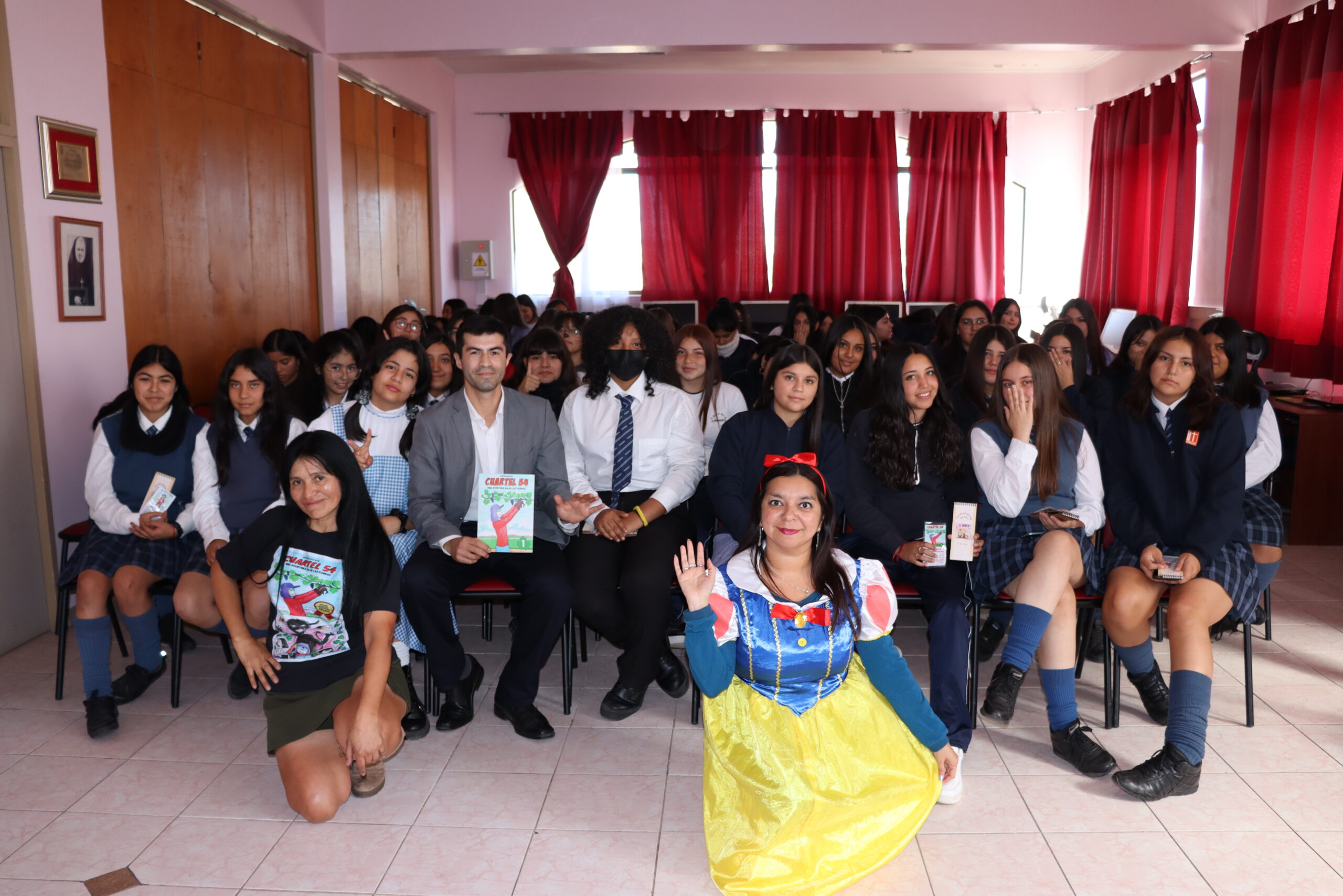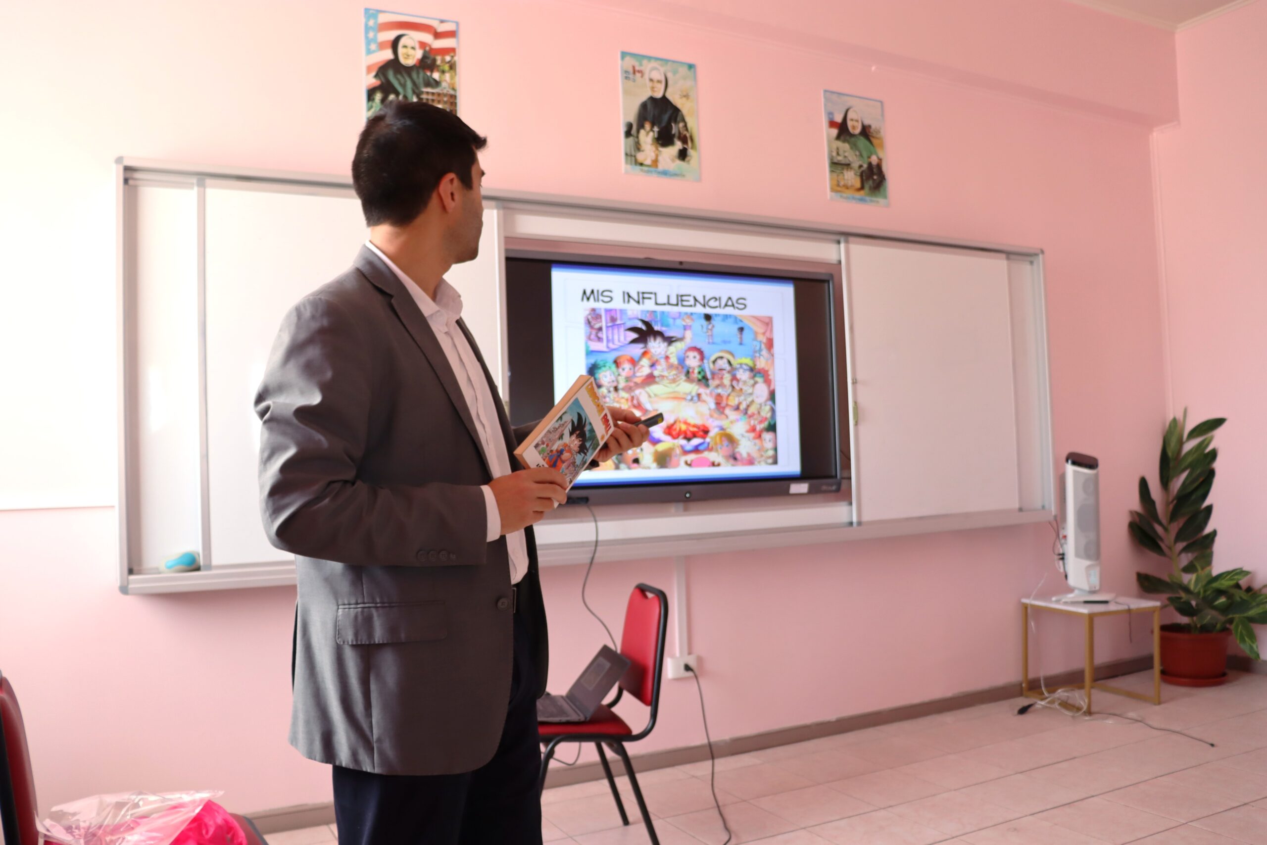Las estudiantes de la especialidad de Párvulo y segundos medios pudieron compartir y participar de una charla, donde el joven escritor ovallino, José Bolbarán, habló sobre la importancia de leer, y cómo el cómic se transforma en una herramienta que fomenta la lectura y creatividad en niños y jóvenes. En su presentación José contó cuáles fueron sus referencias e influencia en su camino de dibujante y escritor de historietas , comenzando con animaciones japonesas entre los años 90 y 2000, así como también leyendo cómics de Mafalda, Condorito y su favorito Mampato.