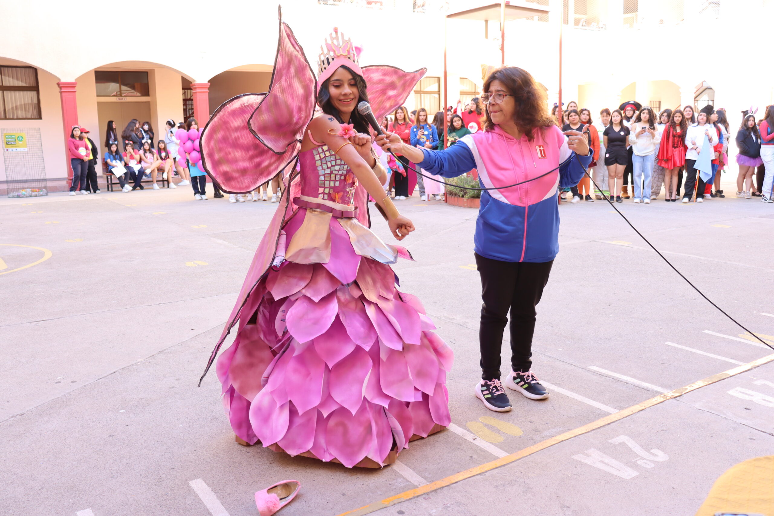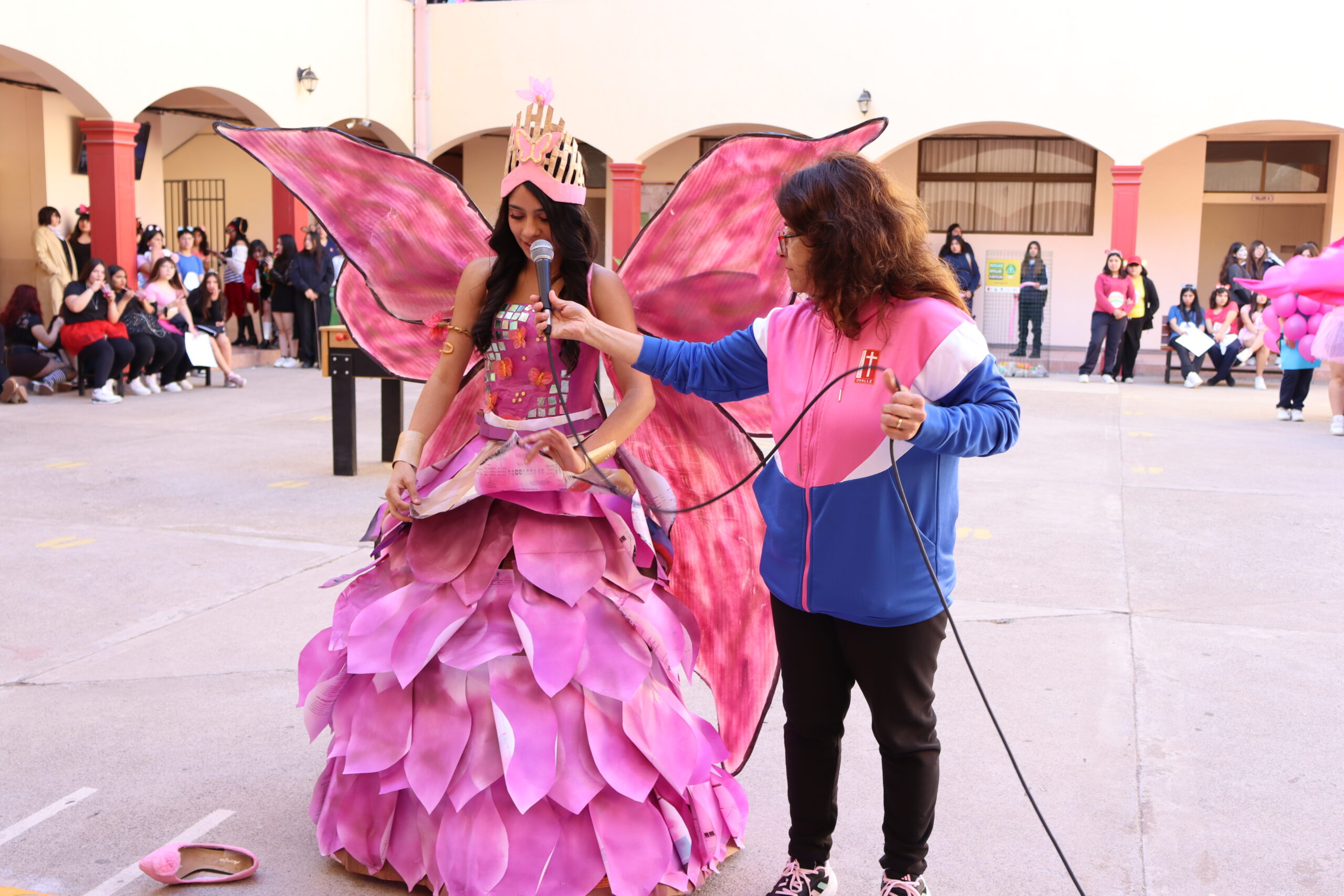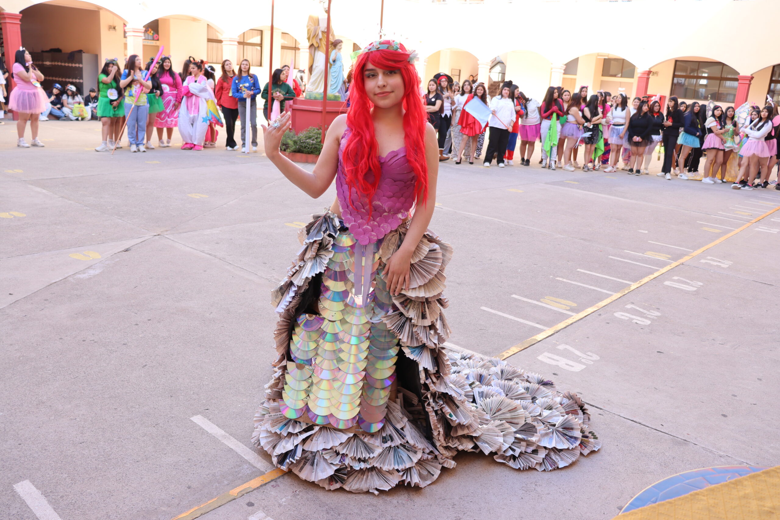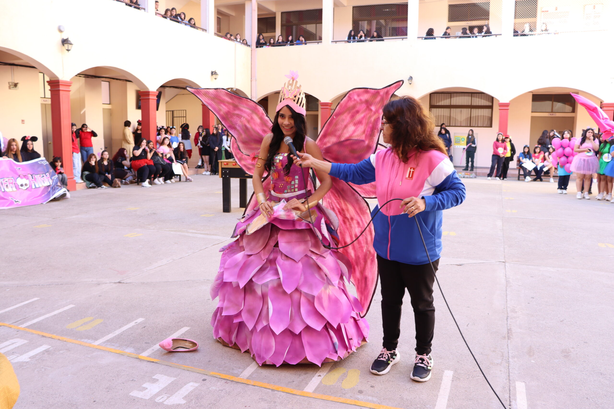 ♻️ Moda con conciencia: trajes reciclados y personajes mágicos De regreso en el colegio, las candidatas de cada alianza presentaron sus trajes confeccionados con materiales reciclados, inspirados en temáticas como Princesas, Barbie, Hadas y Monster High, demostrando creatividad y compromiso con el medio ambiente.