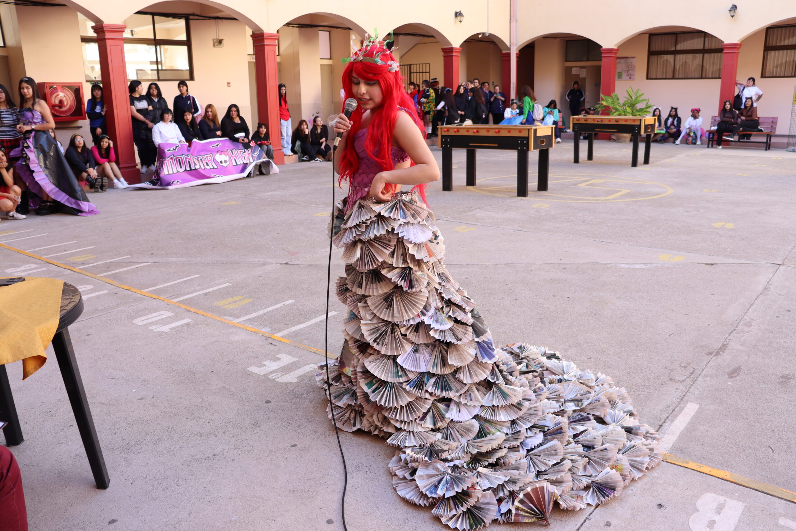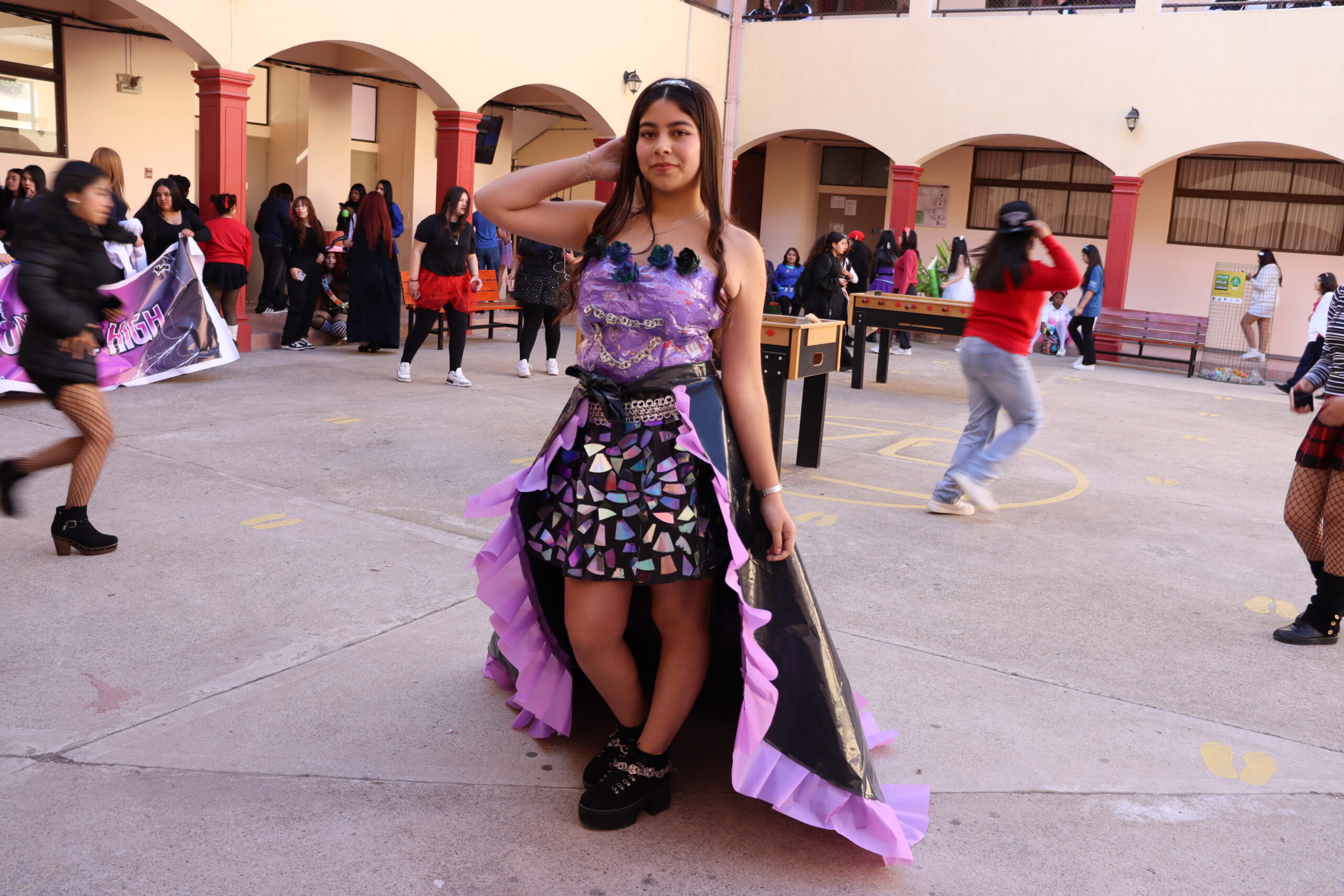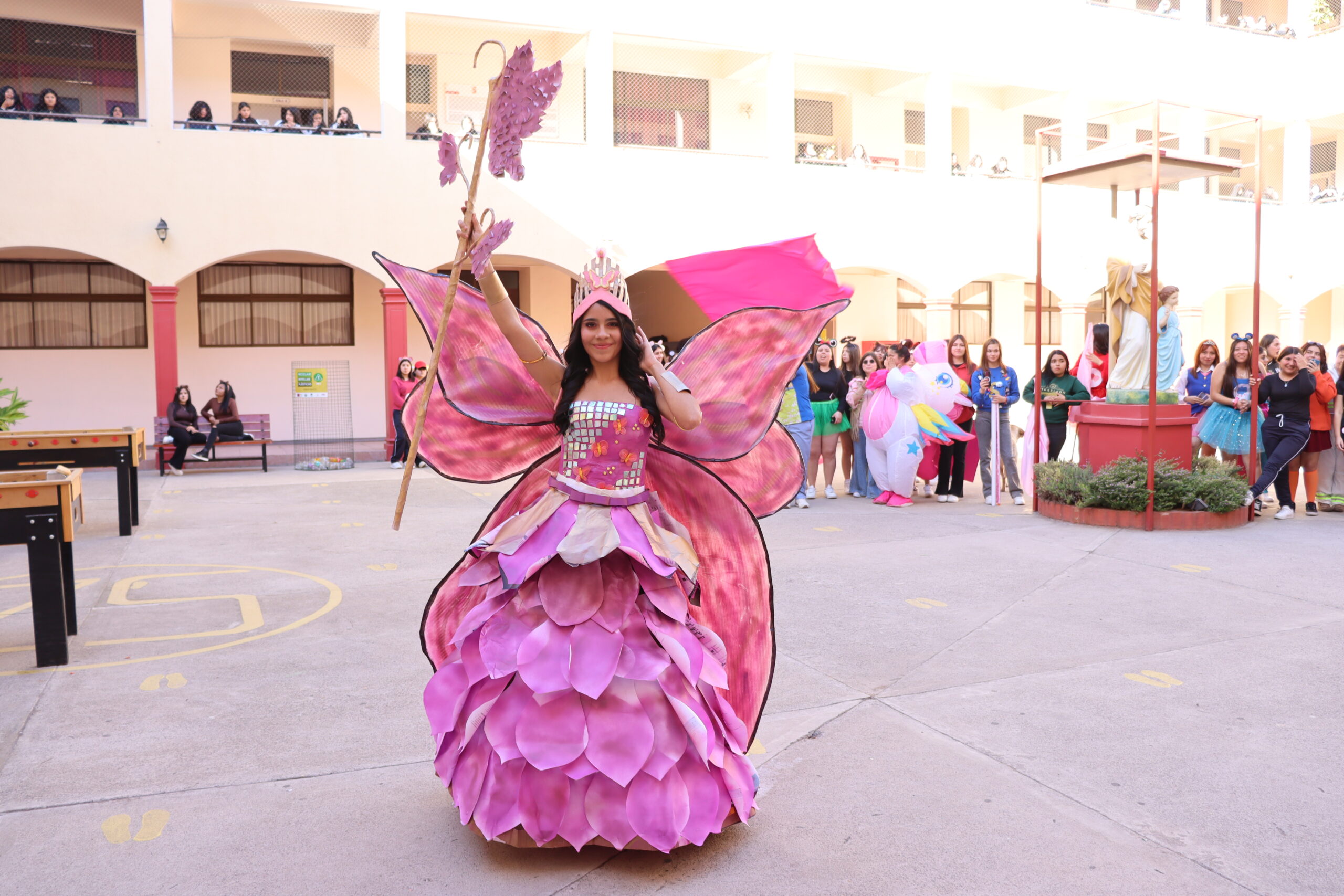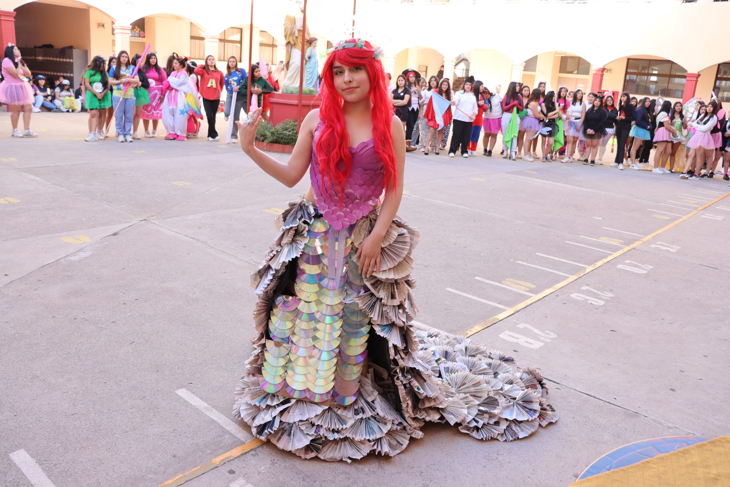 ♻️ Moda con conciencia: trajes reciclados y personajes mágicos De regreso en el colegio, las candidatas de cada alianza presentaron sus trajes confeccionados con materiales reciclados, inspirados en temáticas como Princesas, Barbie, Hadas y Monster High, demostrando creatividad y compromiso con el medio ambiente.