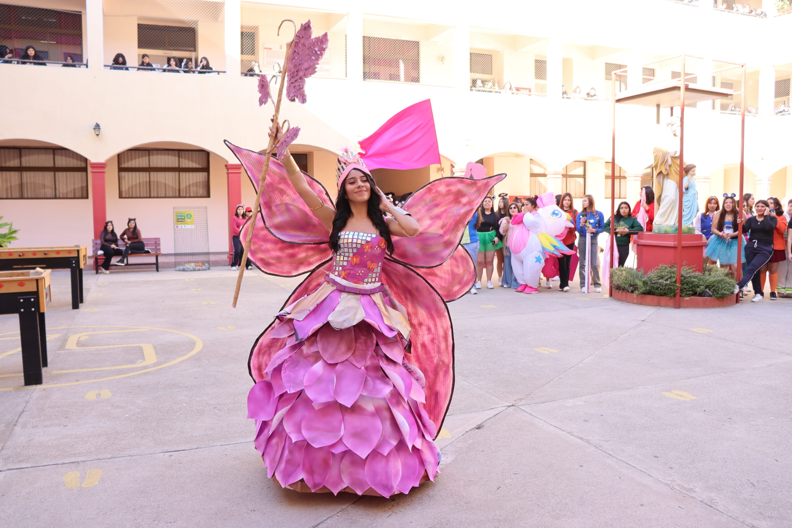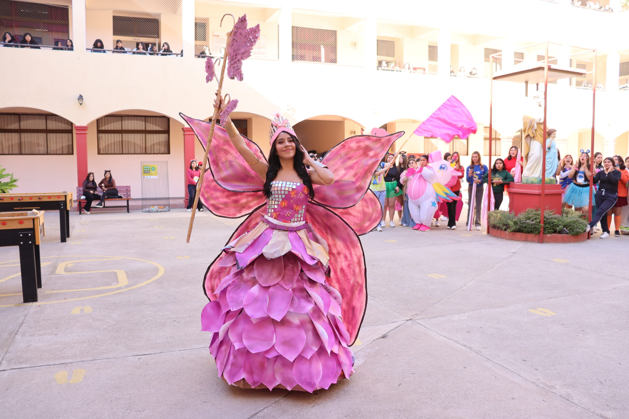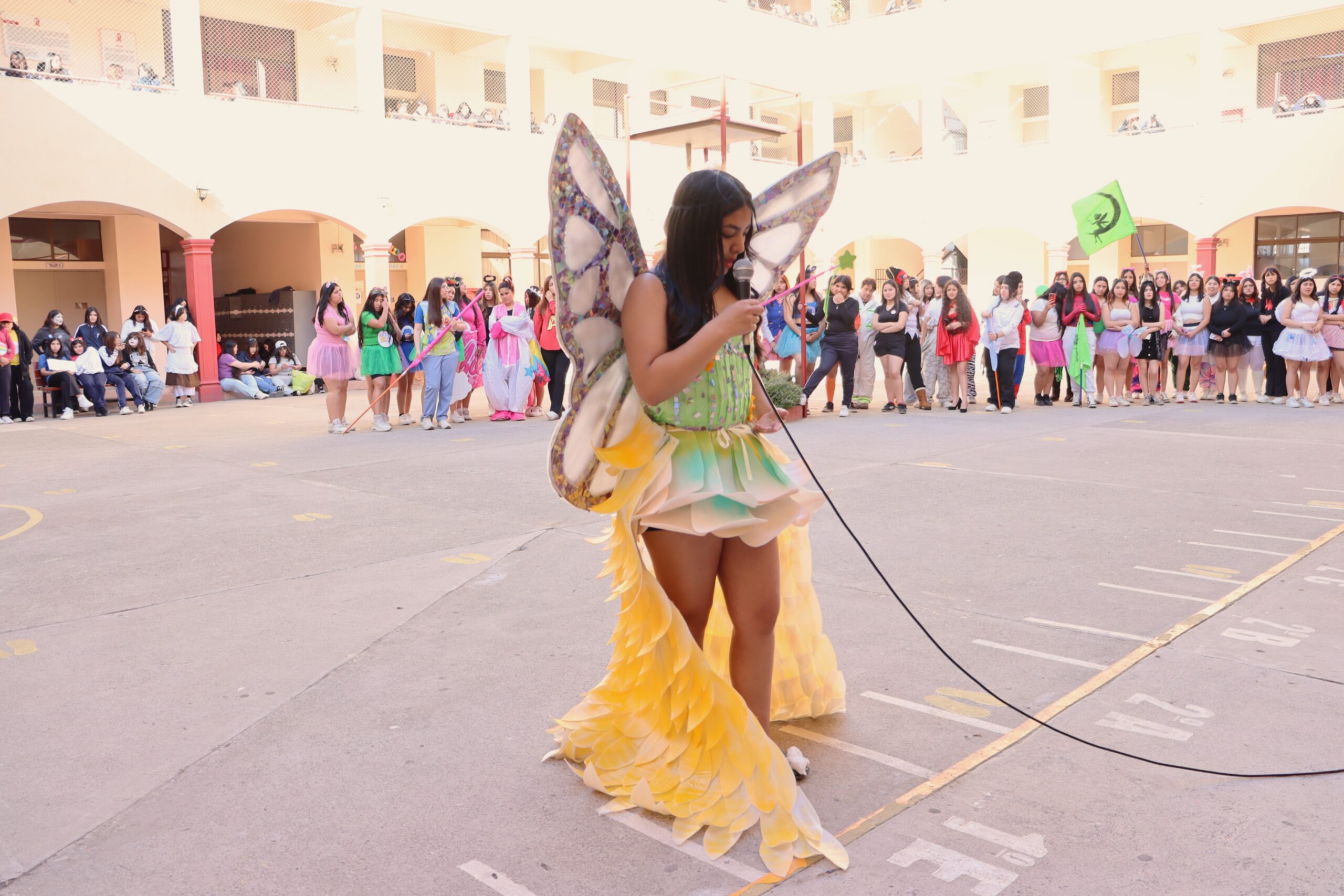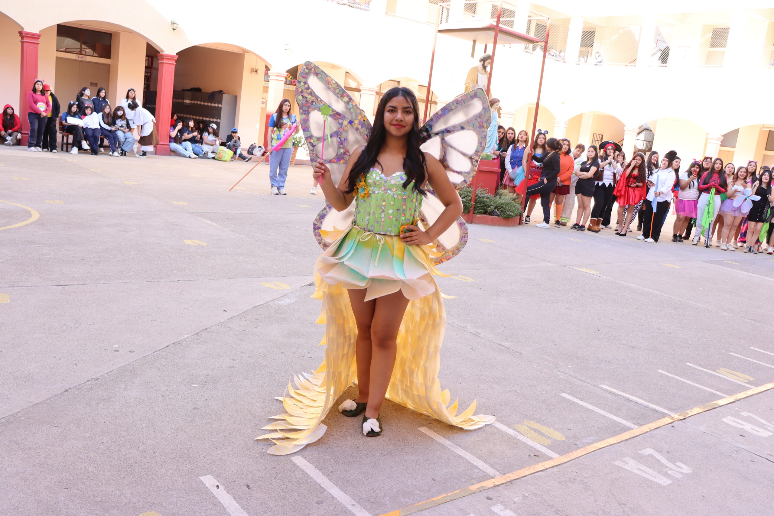 ♻️ Moda con conciencia: trajes reciclados y personajes mágicos De regreso en el colegio, las candidatas de cada alianza presentaron sus trajes confeccionados con materiales reciclados, inspirados en temáticas como Princesas, Barbie, Hadas y Monster High, demostrando creatividad y compromiso con el medio ambiente.