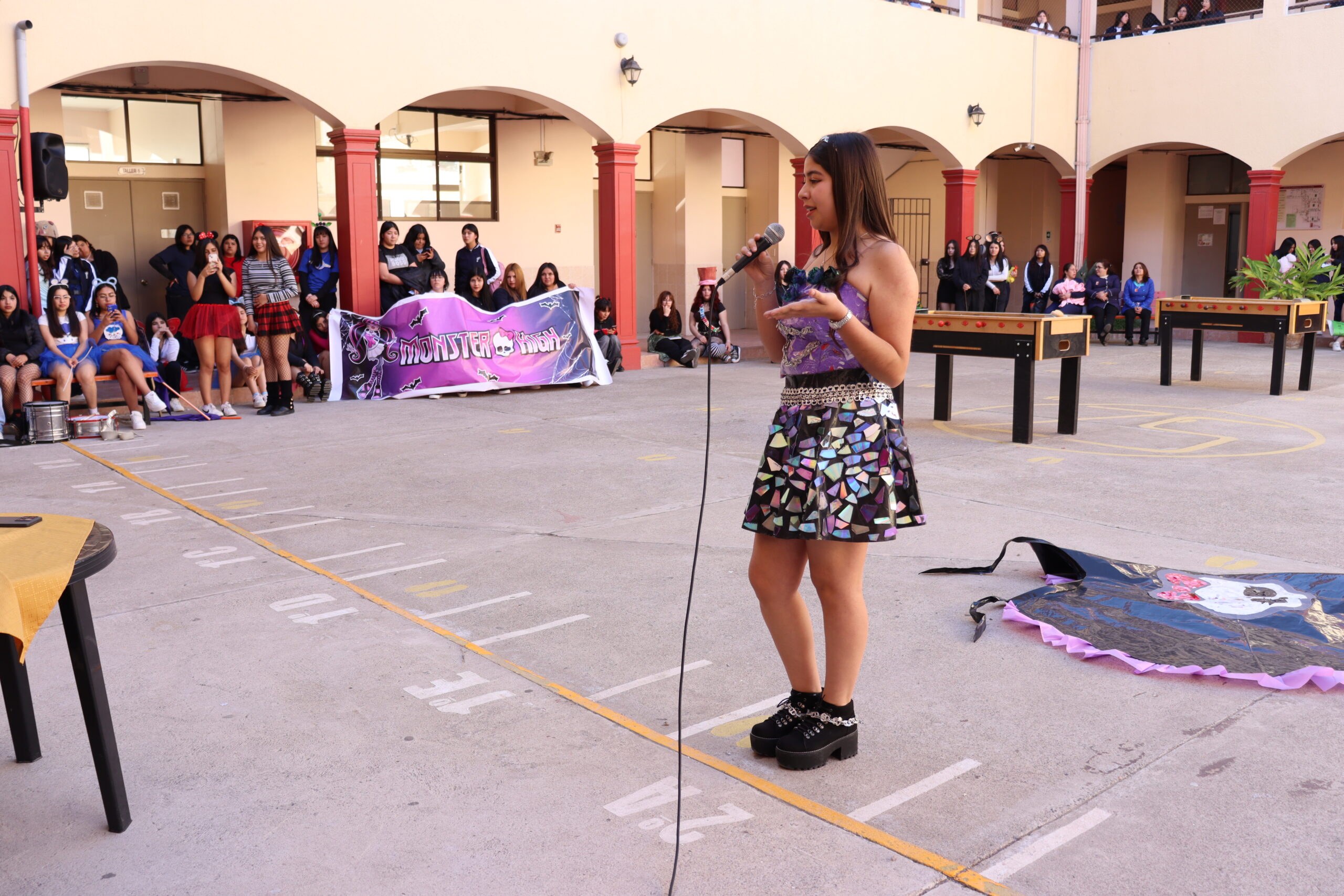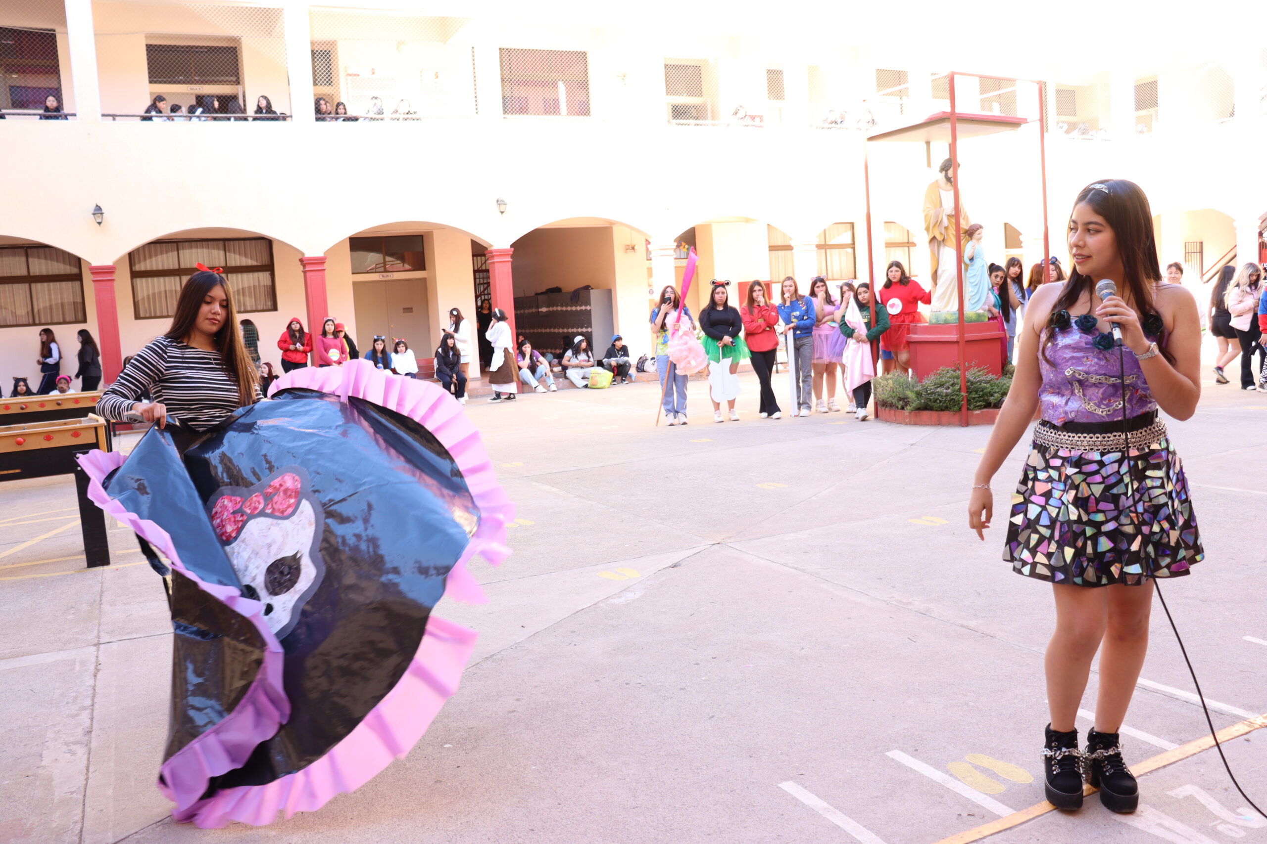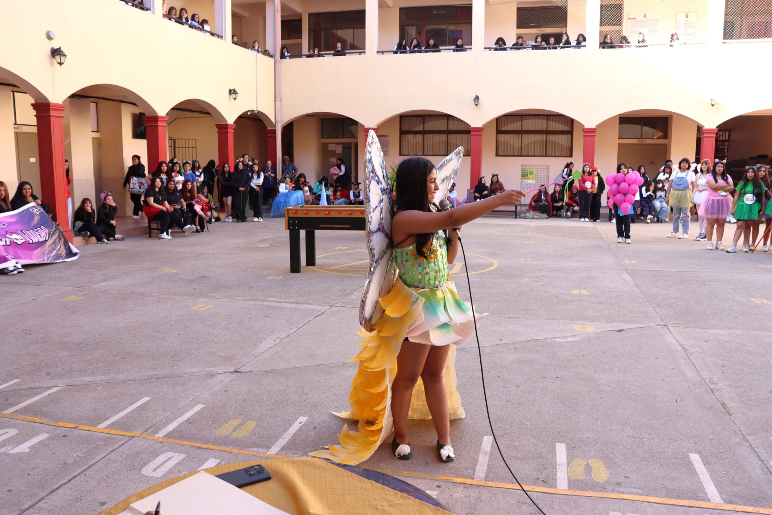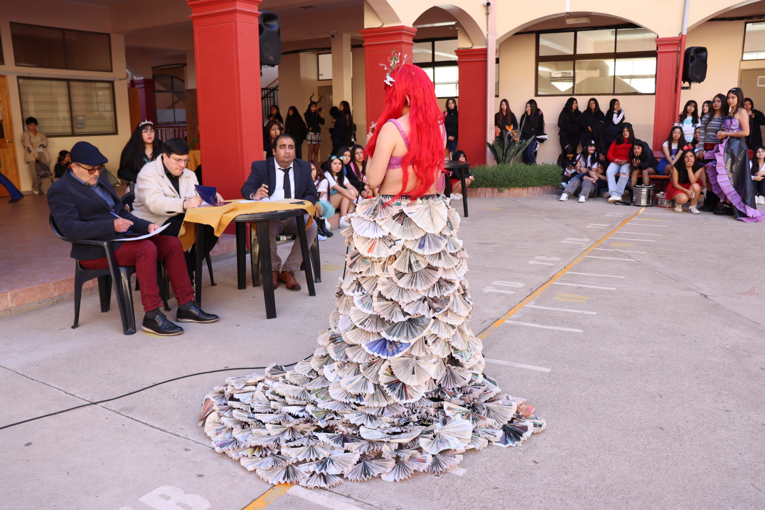 ♻️ Moda con conciencia: trajes reciclados y personajes mágicos De regreso en el colegio, las candidatas de cada alianza presentaron sus trajes confeccionados con materiales reciclados, inspirados en temáticas como Princesas, Barbie, Hadas y Monster High, demostrando creatividad y compromiso con el medio ambiente.