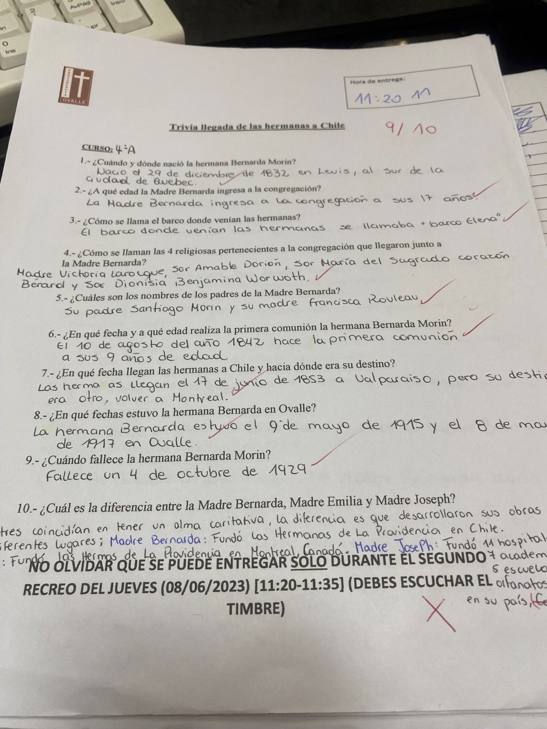 • Cuarto año “A” (9 respuestas correctas de 10 entregado a las 11:20:11)