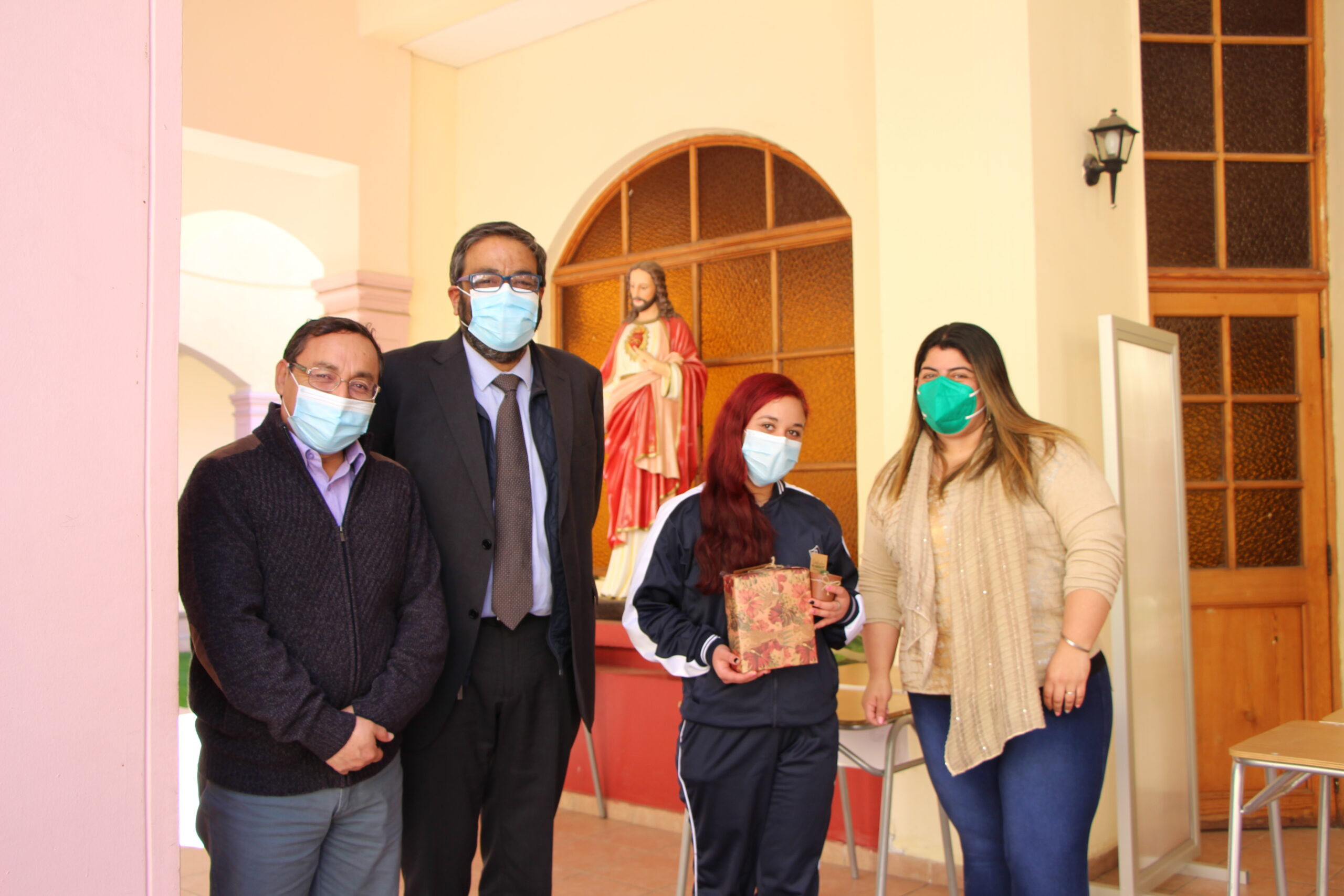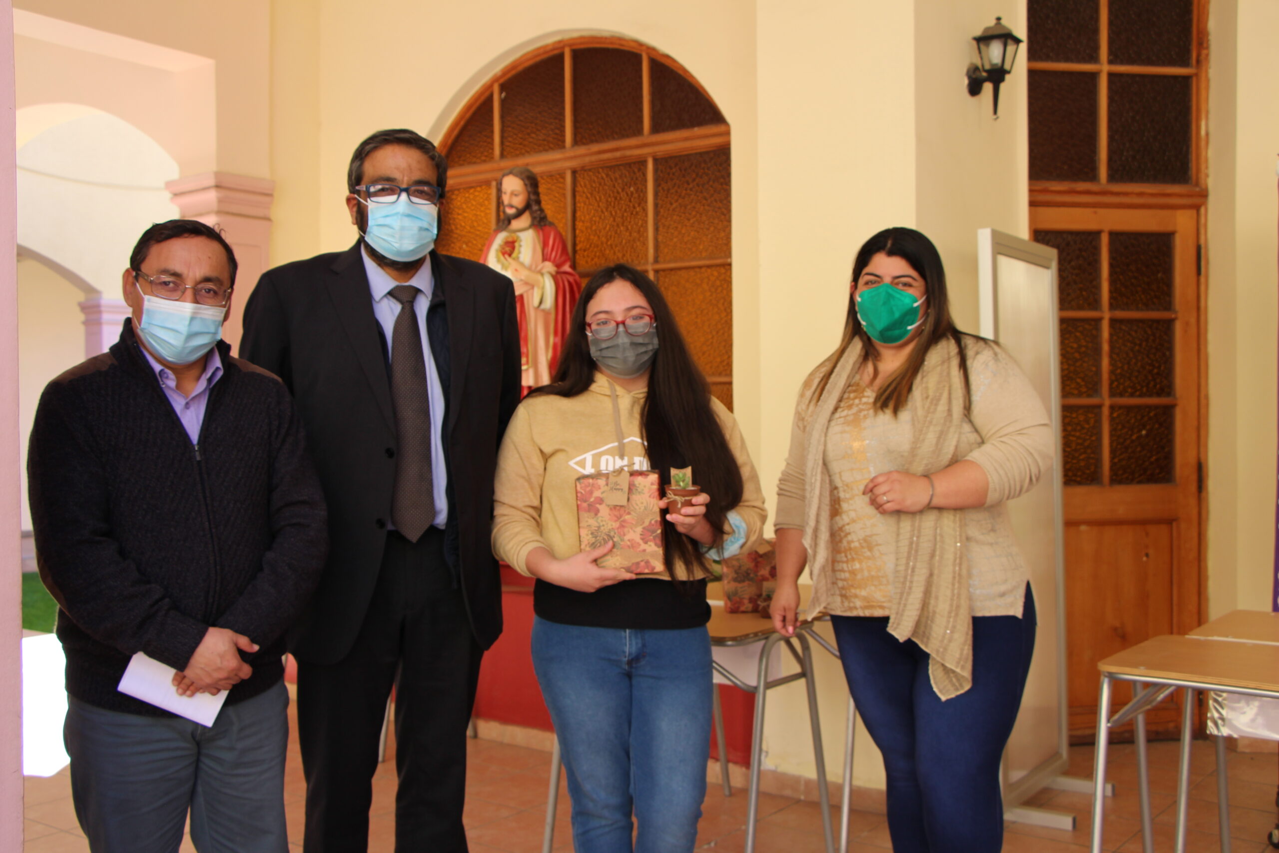El pasado miércoles 8 de septiembre, se realizó la premiación de las ganadoras del concurso “En familia cuidamos la casa común”. En una breve pero simbólica ceremonia se premió a las estudiantes María Teresa Valdivia del 1° medio B y Sabkia Araya Órdenes de 1° medio D, por su destacada participación en el concurso organizado por el Equipo de Convivencia Escolar a cargo de la Psicológa Daniela Cáceres, la premiación contó además con la presencia del Director, Jorge Gormaz y Coordinador Pedagógico, Ricardo Montes.
