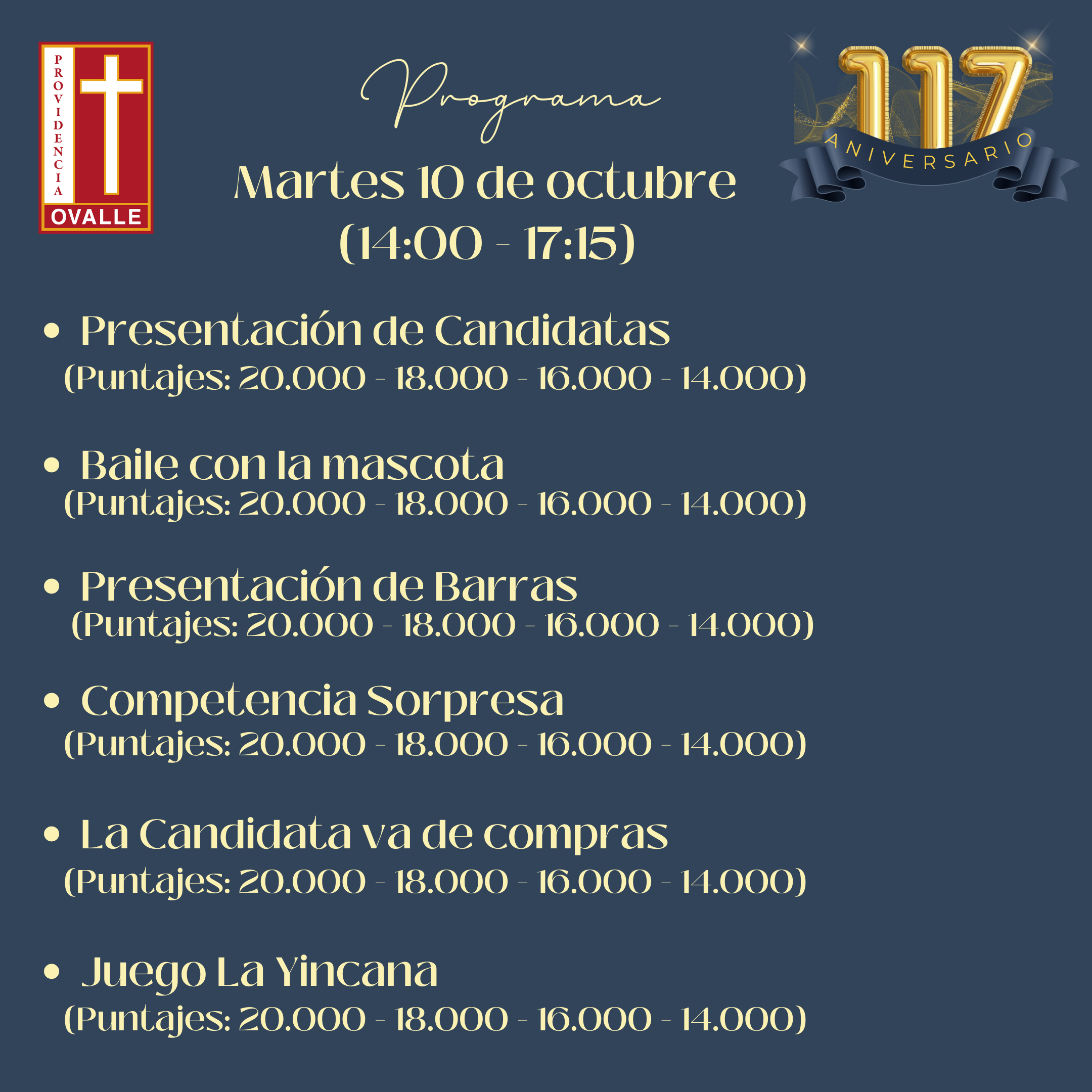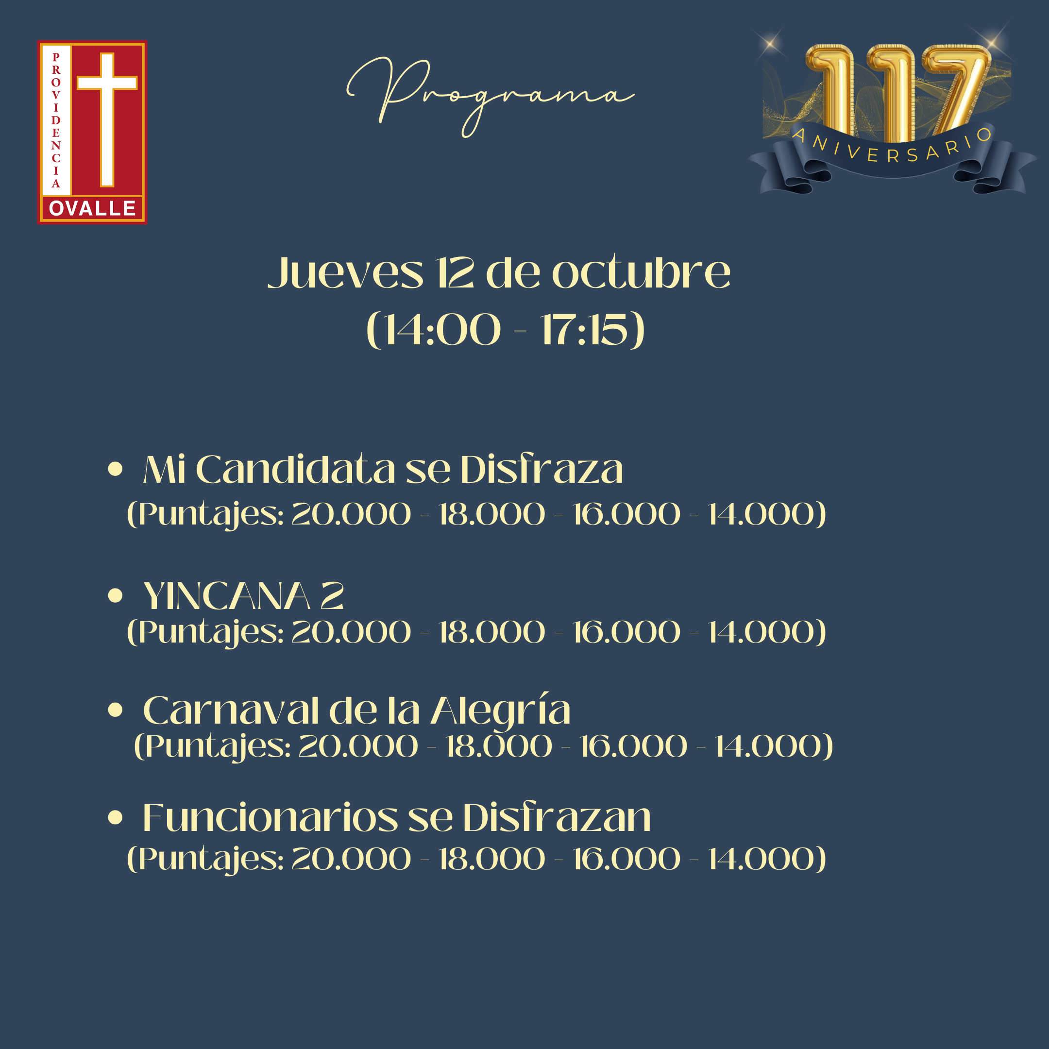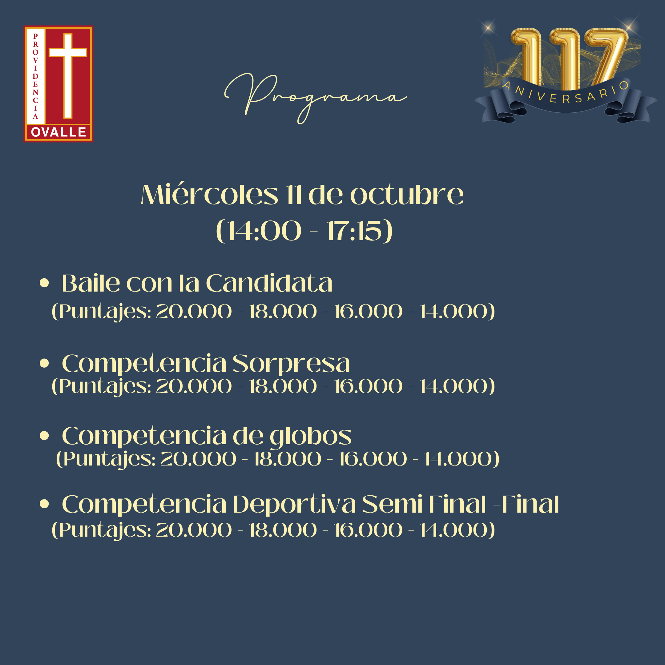 lugar: 18.000 puntos- 3° lugar: 16.000 puntos – 4° lugar: 14.000 puntos. - Competencia de Murales sobre la temática: “170 años Hermanas de la Providencia en Chile, Celebrando en nuestro Colegio los 117 años de amor y servicio en Ovalle “Se evaluará presentación estética, contenido de la información y creatividad. El material a utilizar será a libre elección. El jurado evaluará sólo el material disponible en el diario mural. (no