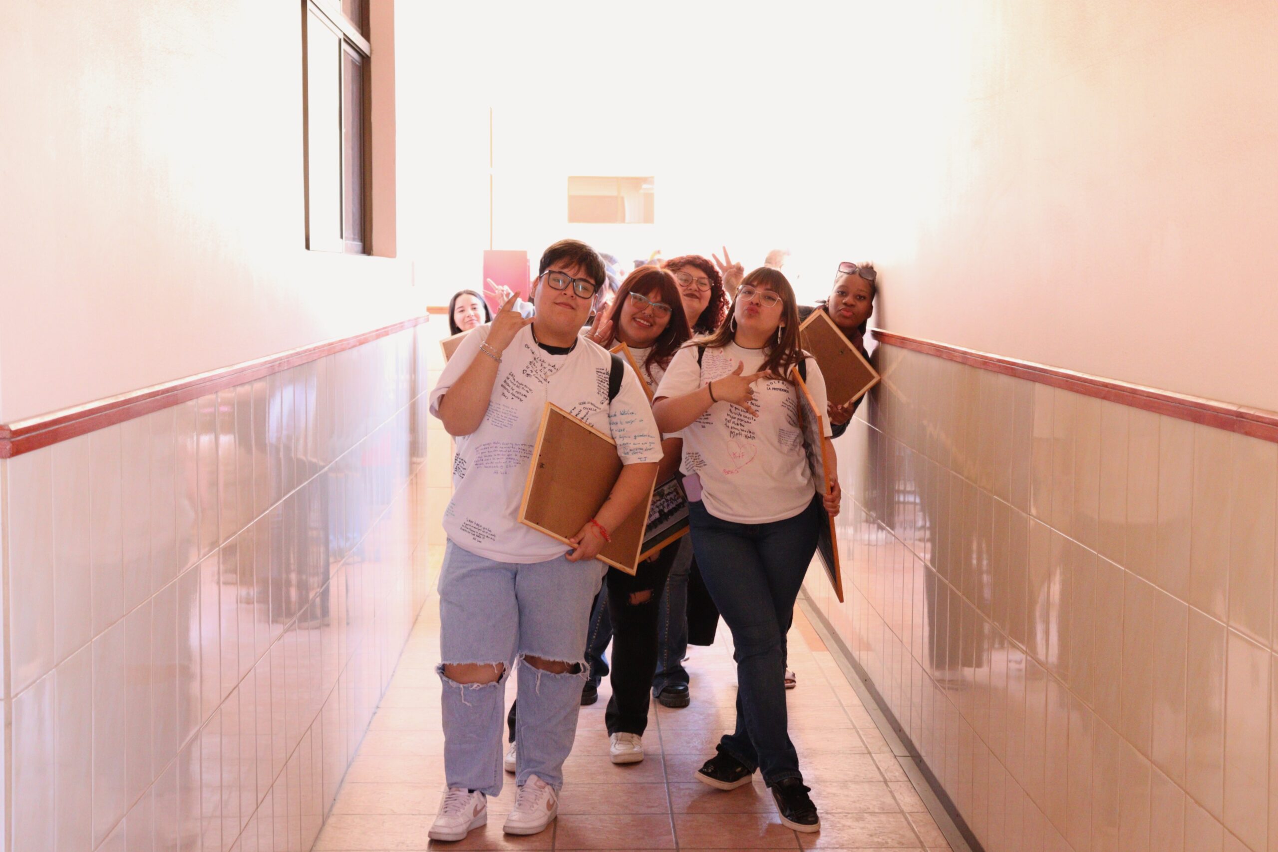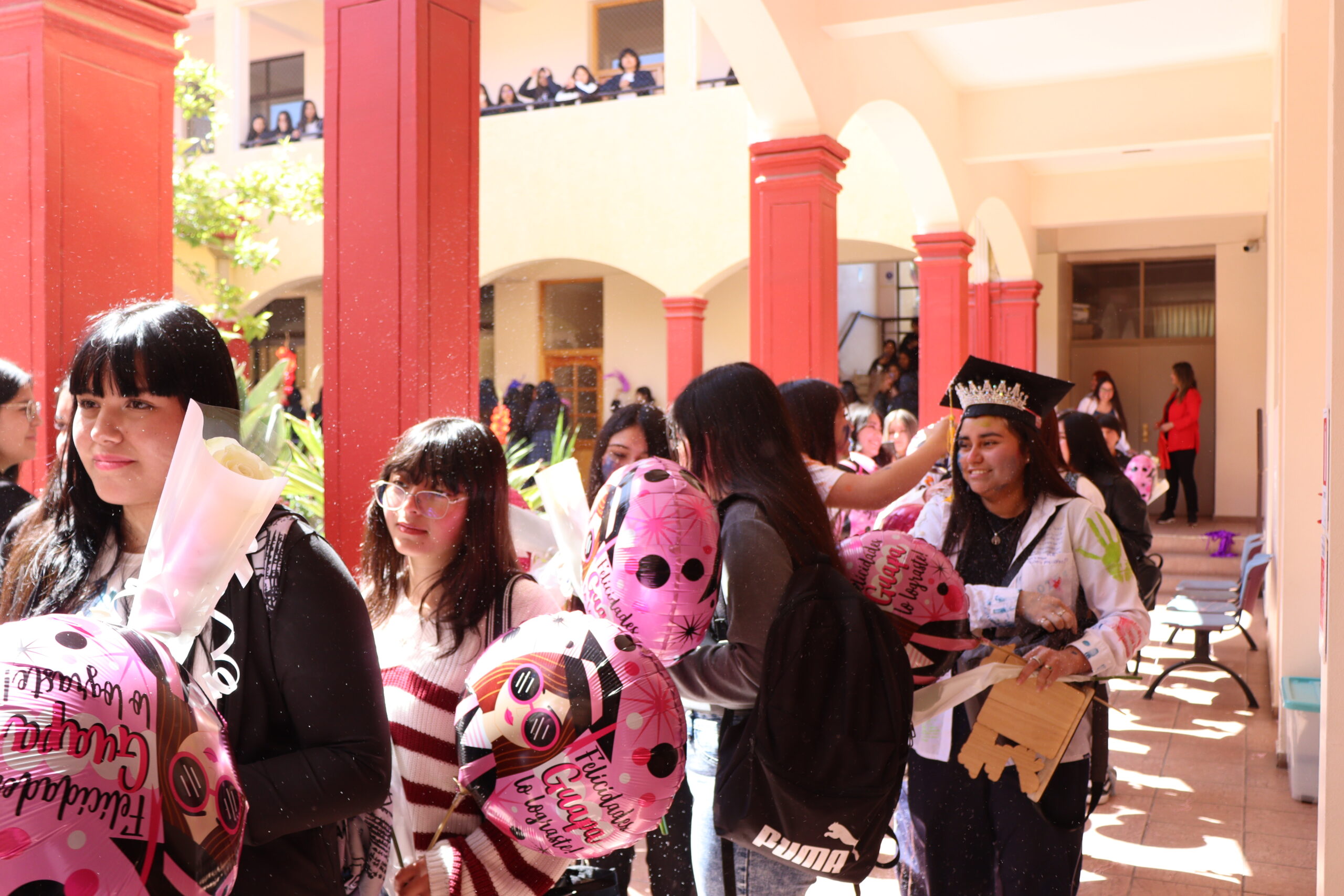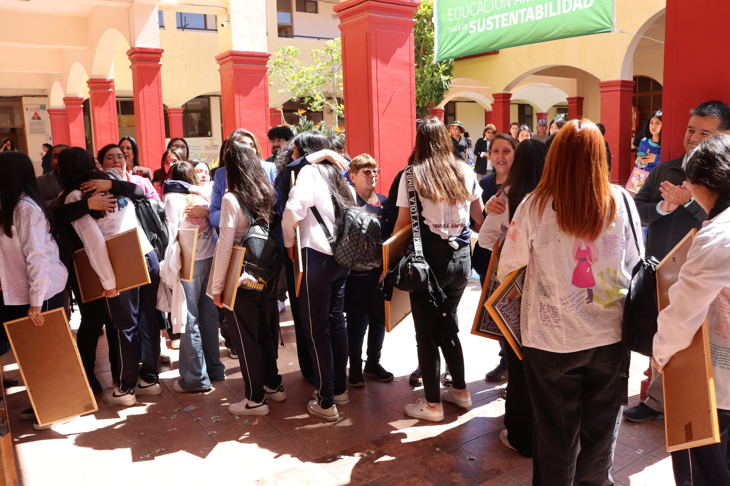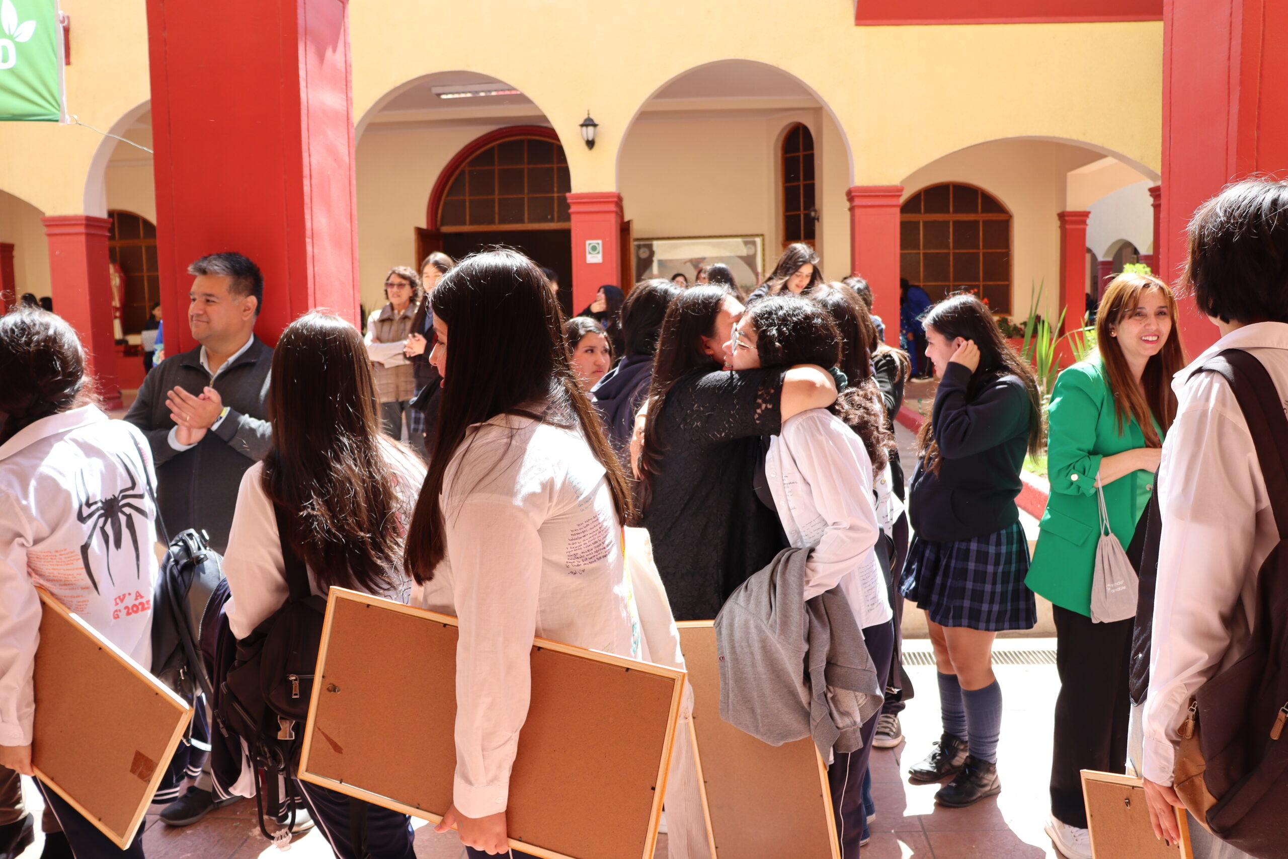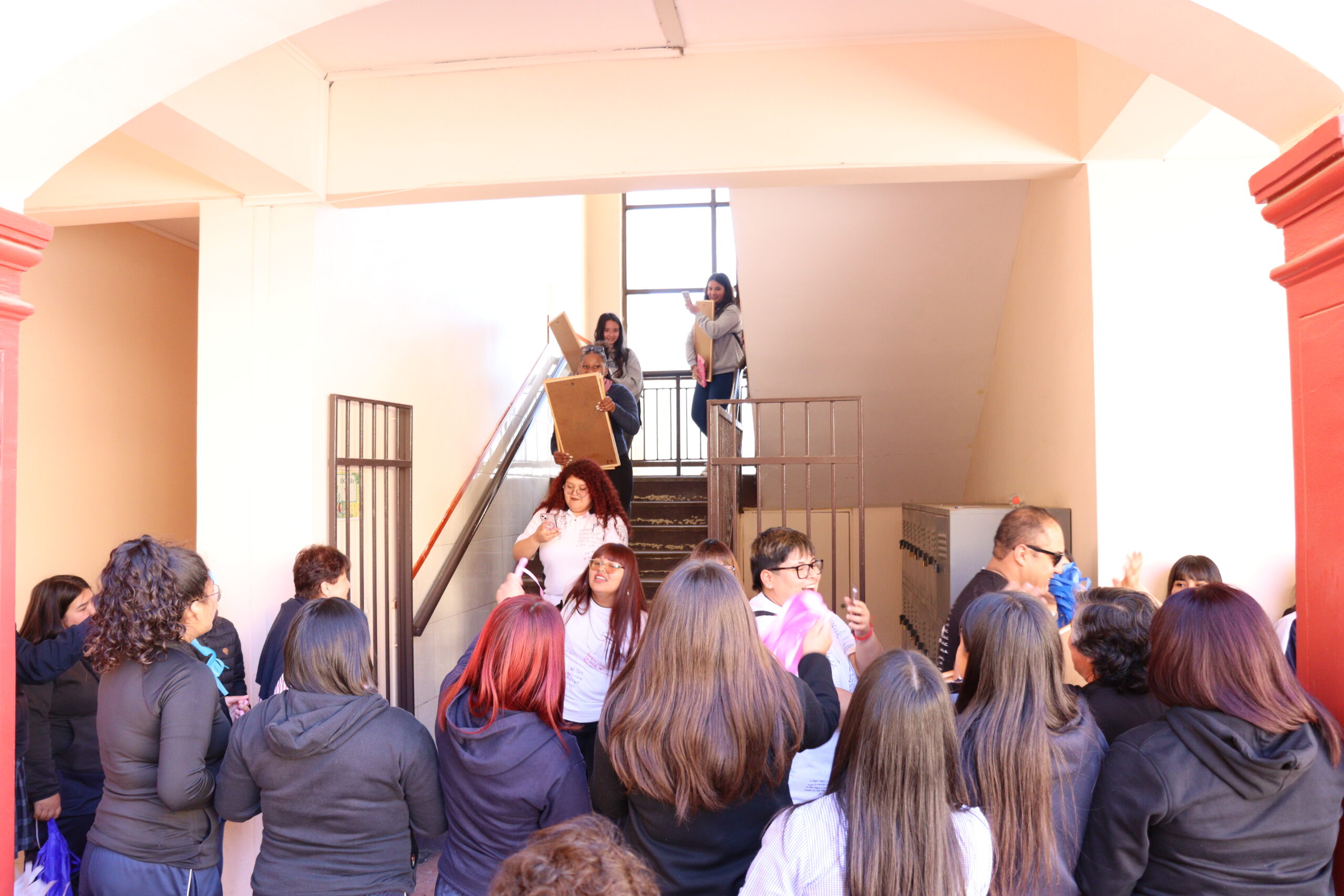 Las jóvenes, acompañadas por sus profesores jefes, comenzaron su recorrido desde las salas, bajando por el tercer y segundo piso, donde fueron despedidas con aplausos y muestras de cariño de los cursos menores. Al llegar al primer piso, las estudiantes de Terceros Medios las recibieron con coloridos pompones confeccionados especialmente para la ocasión, gesto que simbolizó la alegría y el orgullo de ver partir a sus compañeras.