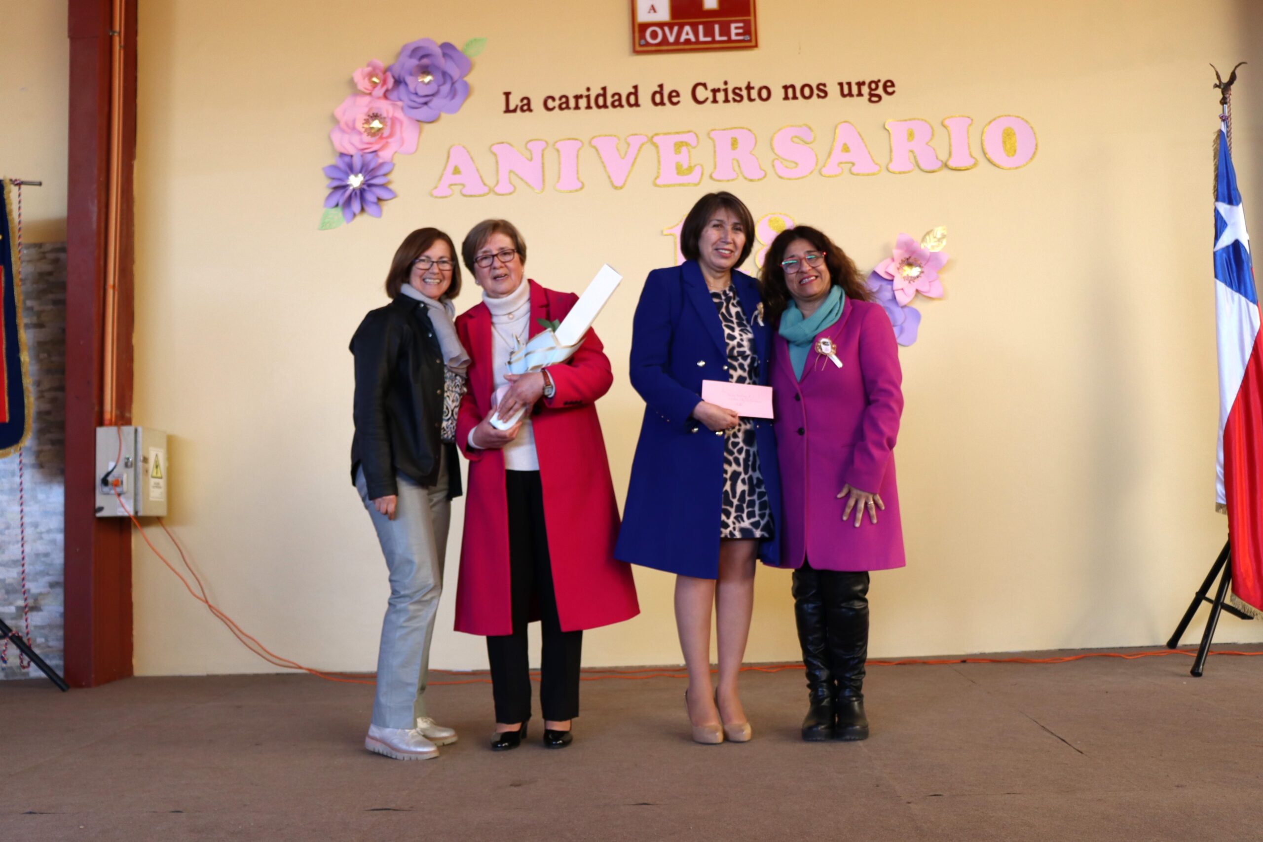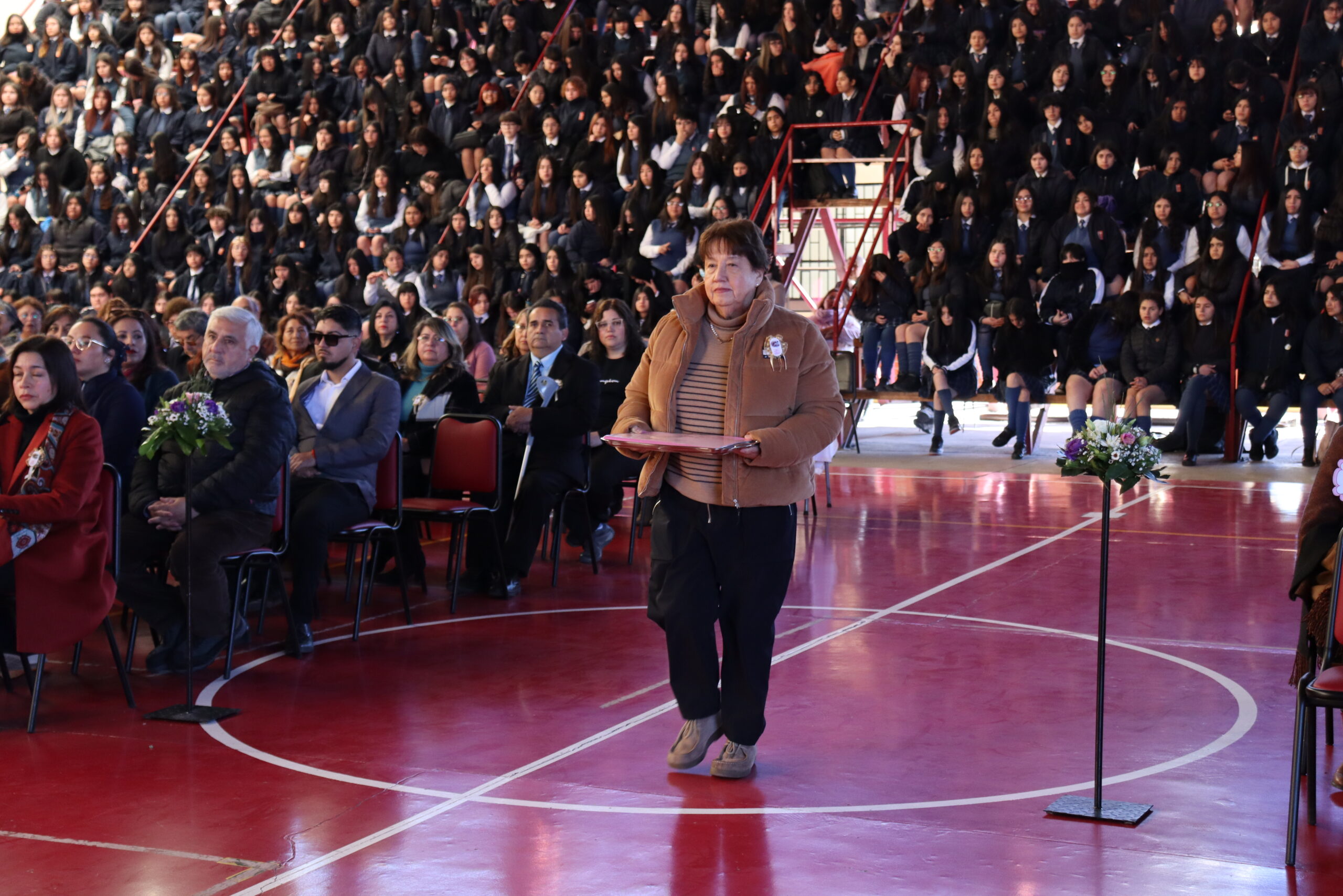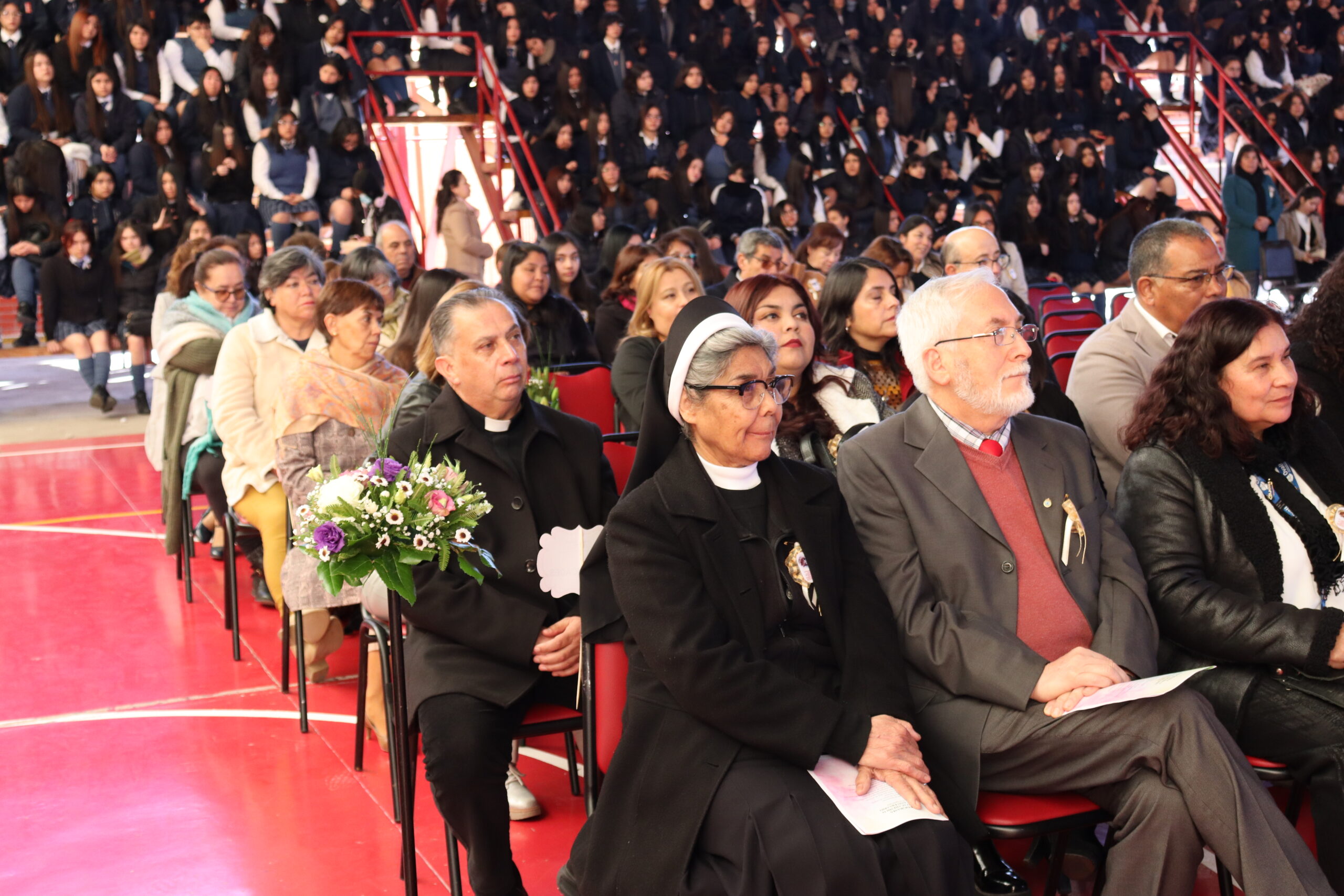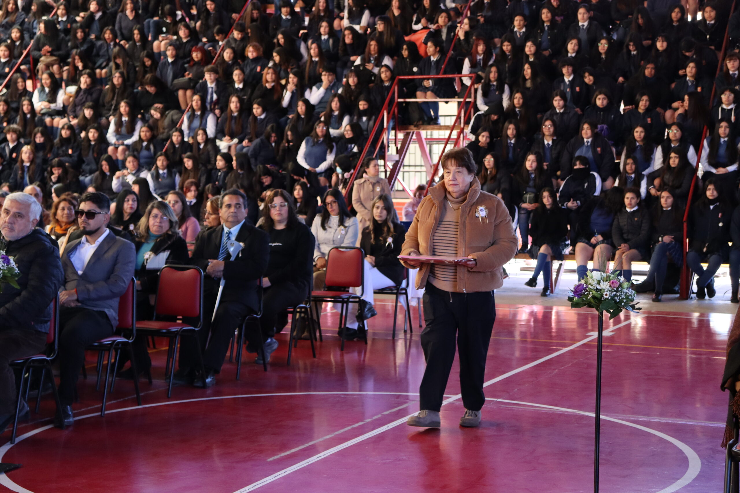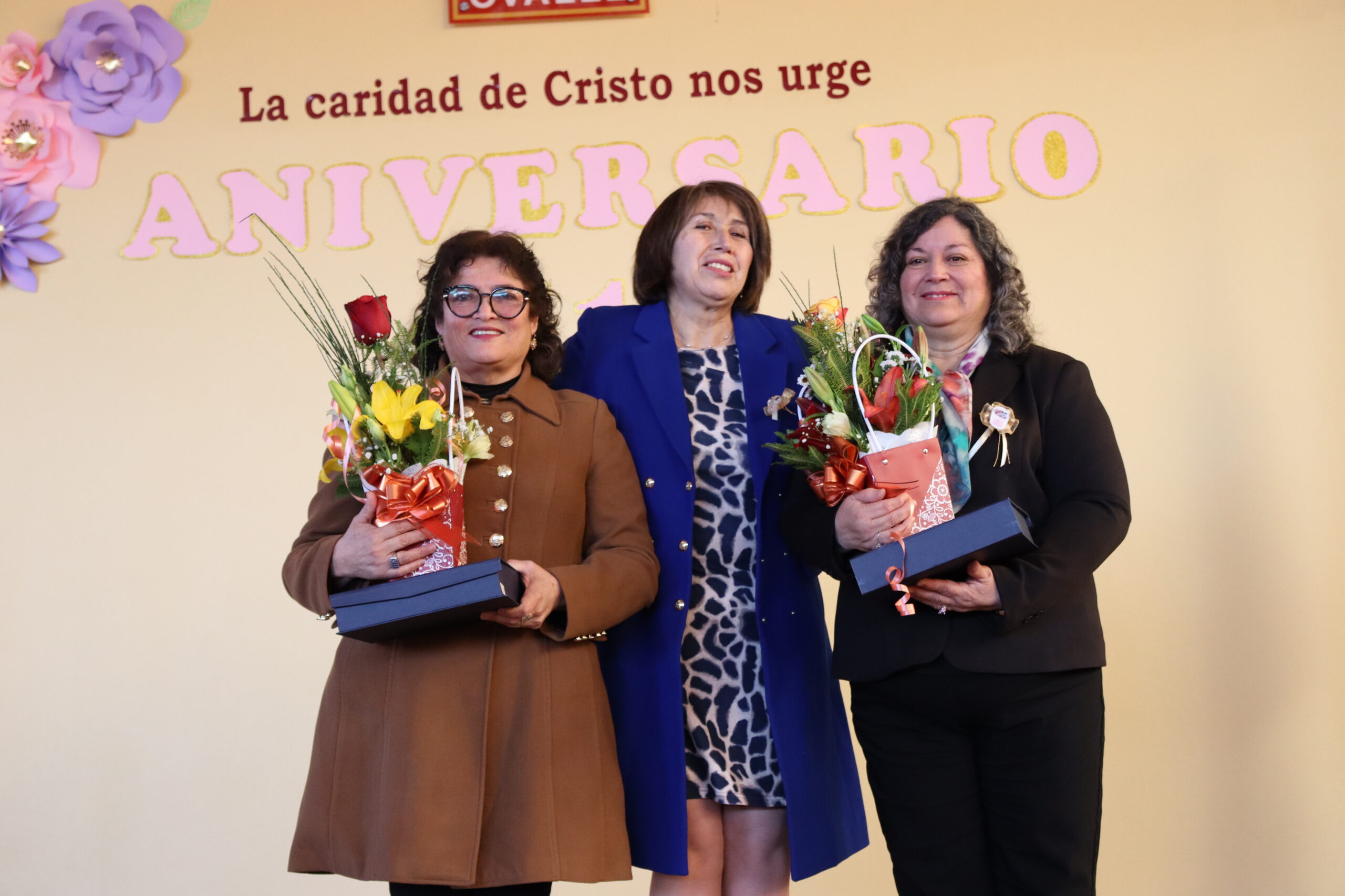 Al finalizar la Eucaristía, se dio inicio al acto conmemorativo de Aniversario, el cual contó con diversos números artísticos, como canto y baile, además del reconocimiento a los años de servicio de nuestros funcionarios, con el objetivo de fortalecerlos espacios laborales, destacando su profesionalismo, compromiso y dedicación en su larga trayectoria: Sra. Oriana Rivera con 45 años de servicio, Sra. Cecilia Leiva y Sra. Nelly García con 40 años, Sra. Silvia Urqueta con 35 años y Sra. María Véliz con 20 años de desempeño en torno a esta obra educativa plasmada con tan noble entrega en la educación de las jóvenes estudiantes.
